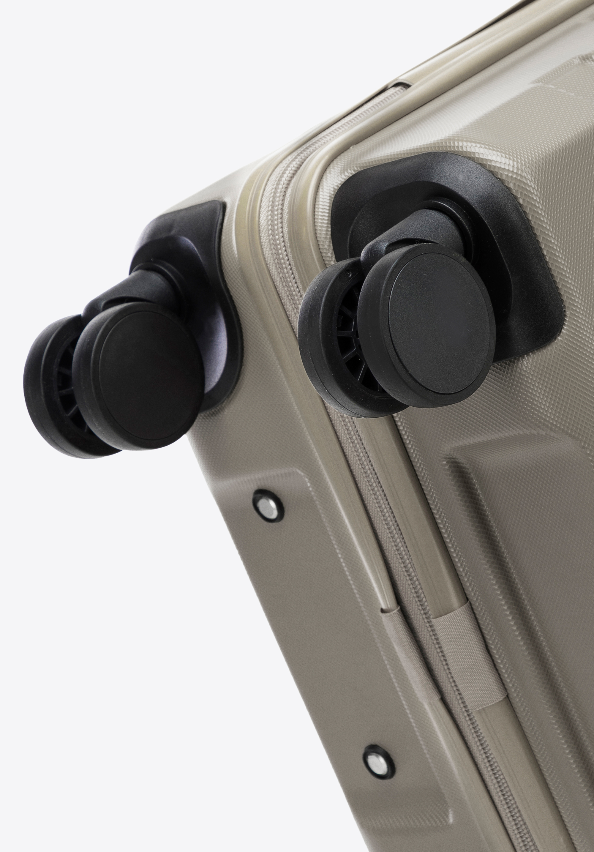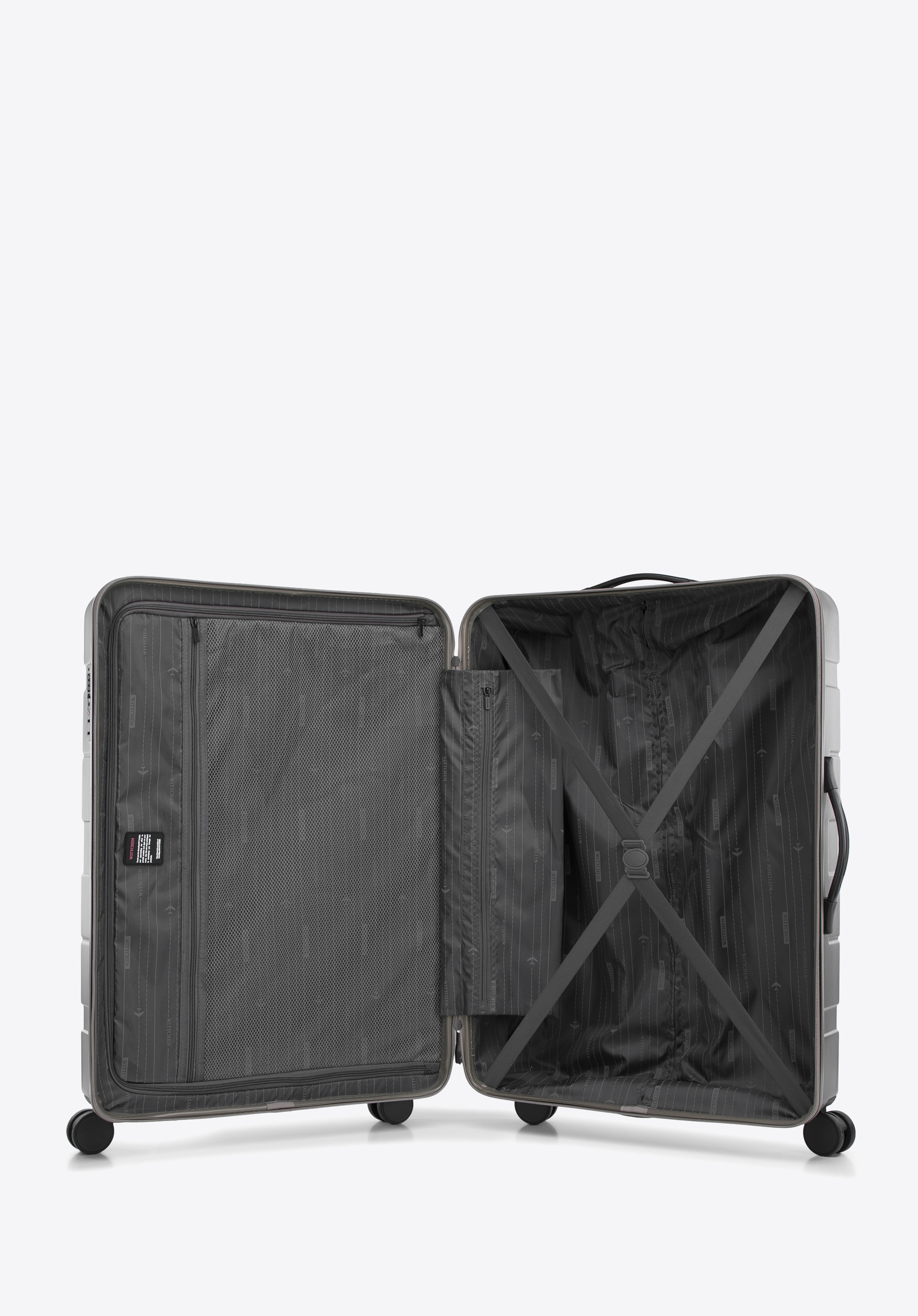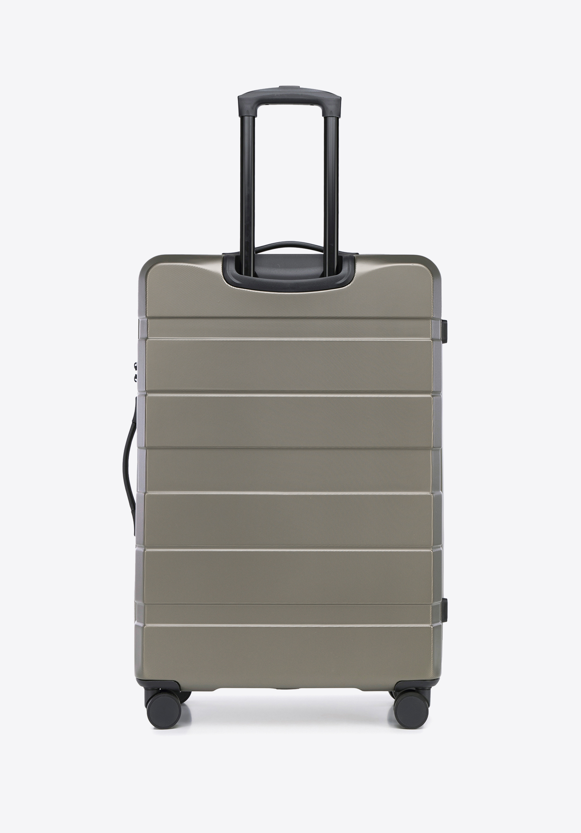 - walizka wyposażona w cztery podwójne, obrotowe kółka ułatwiające prowadzenie;