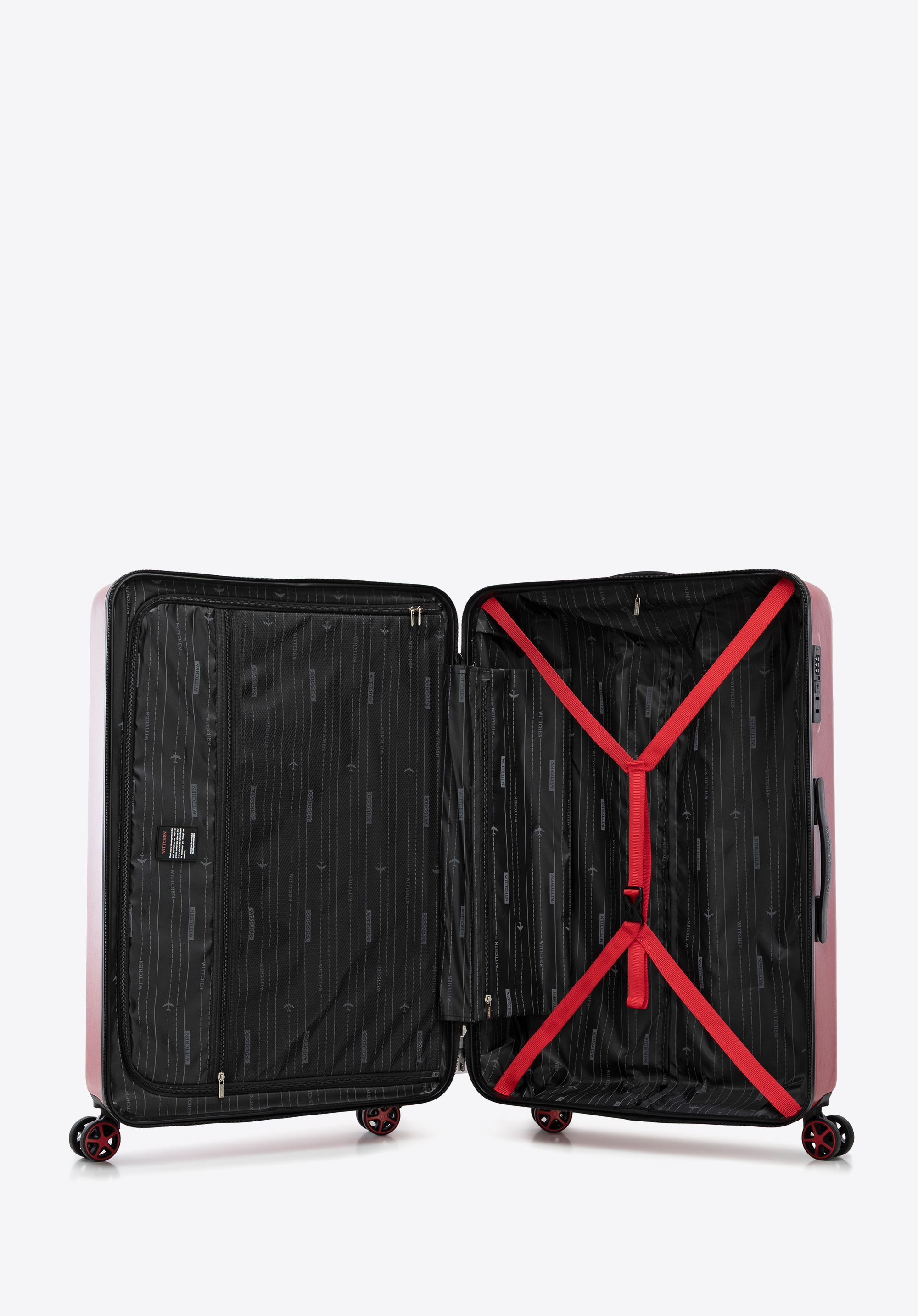- Design: Tłoczone logo, wyraziste żłobienia oraz kółka i pasy mocujące w dopasowanej do korpusu kolorystyce nadają walizce elegancki, wyjątkowy charakter.