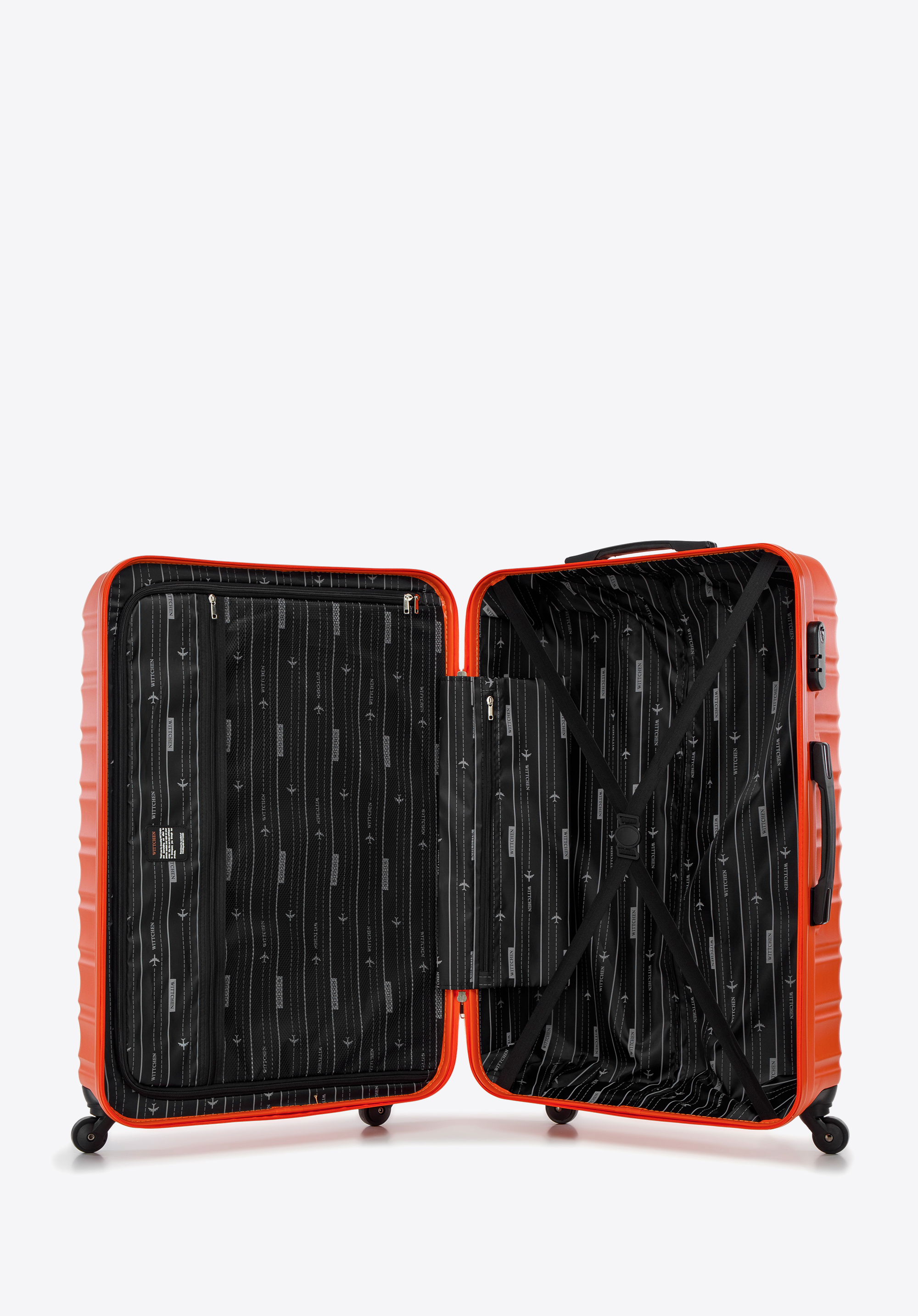 - Przemyślane wnętrze: Wnętrze walizki podzielone jest na dwie funkcjonalne komory. Pierwsza z nich, zabezpieczona elastycznymi pasami, dopasowuje się do rozmiaru bagażu, gwarantując jego stabilność i eliminując ryzyko przemieszczania się rzeczy. Druga komora, zamykana na suwak, jest idealna do przechowywania drobnych przedmiotów.