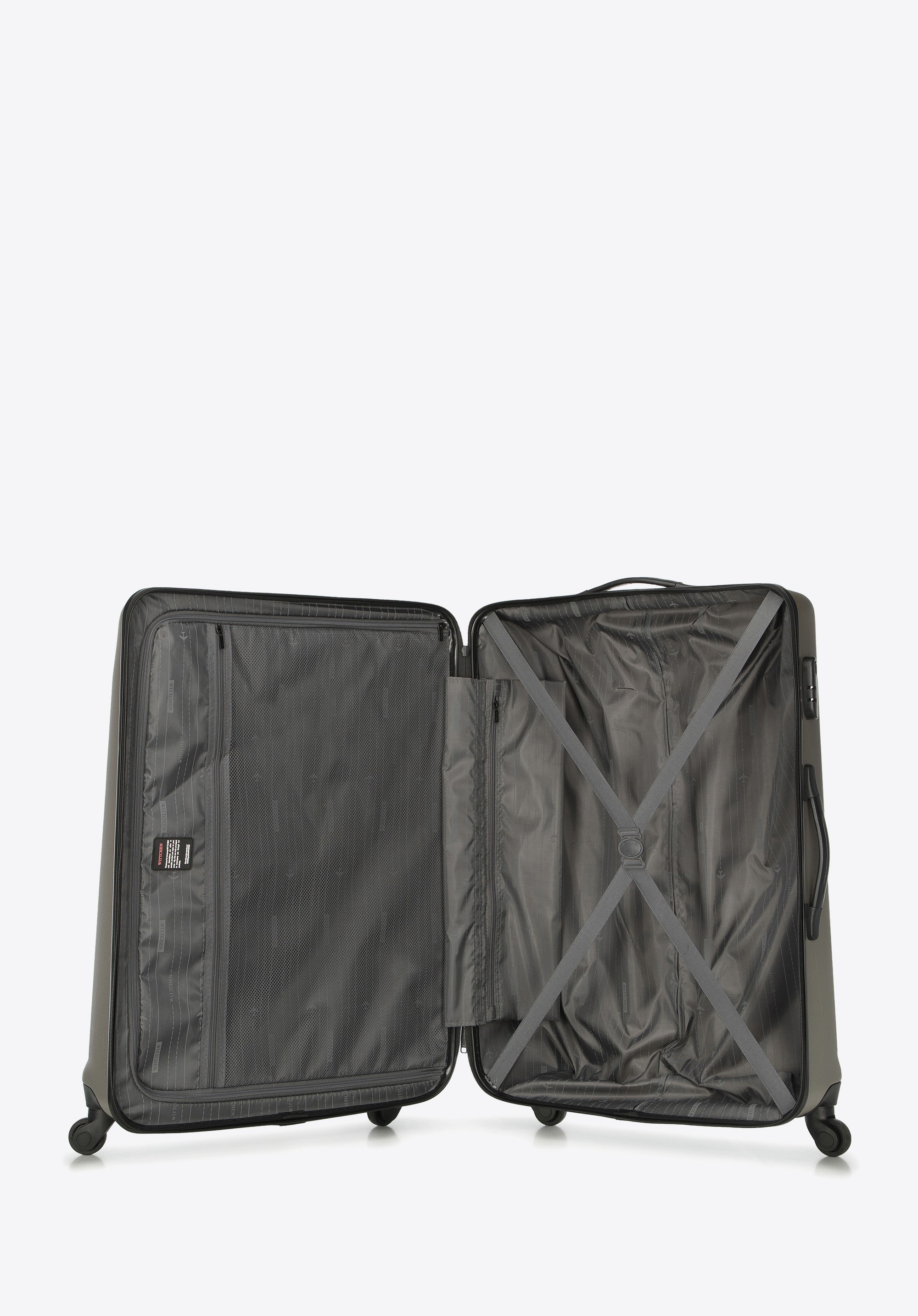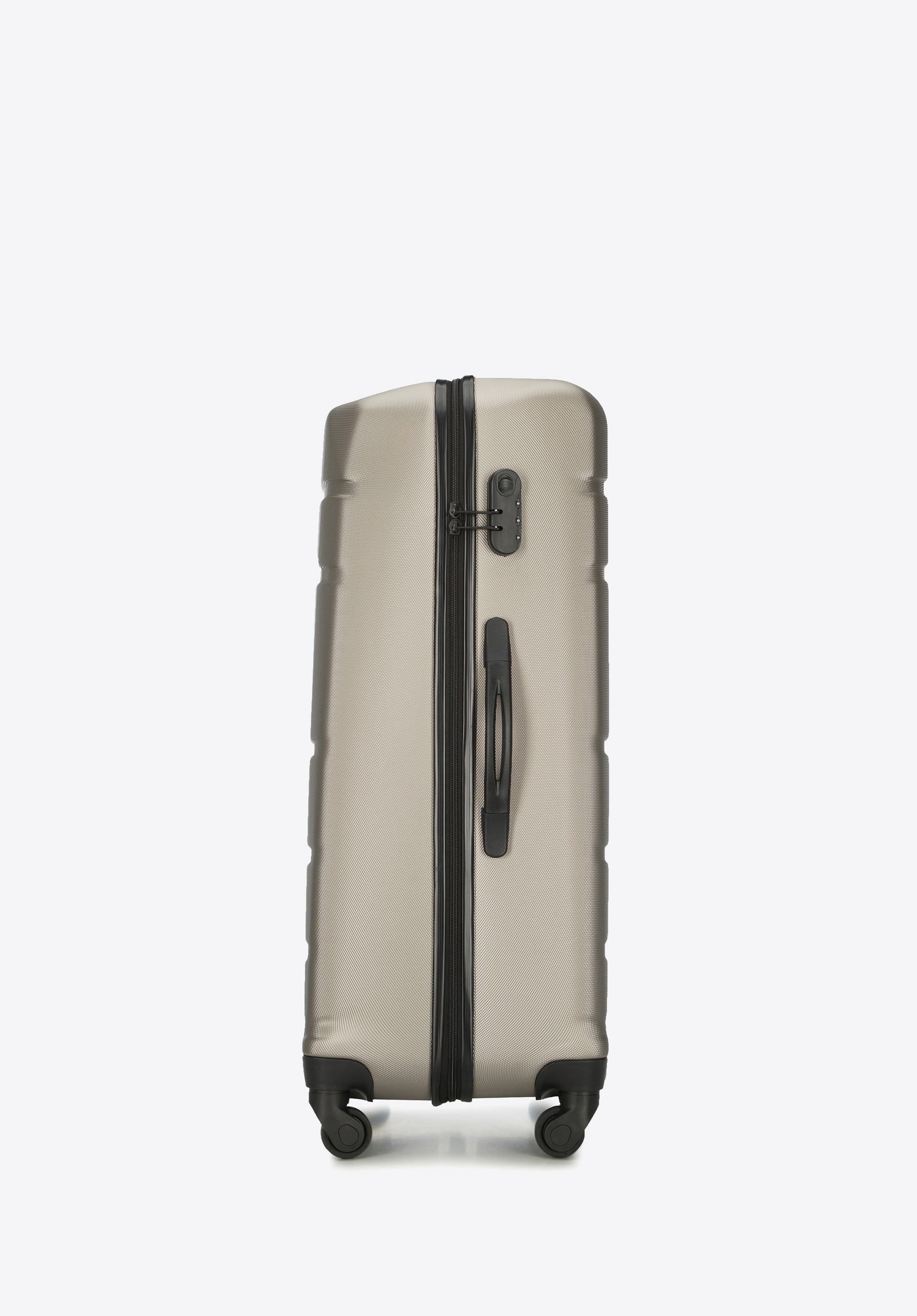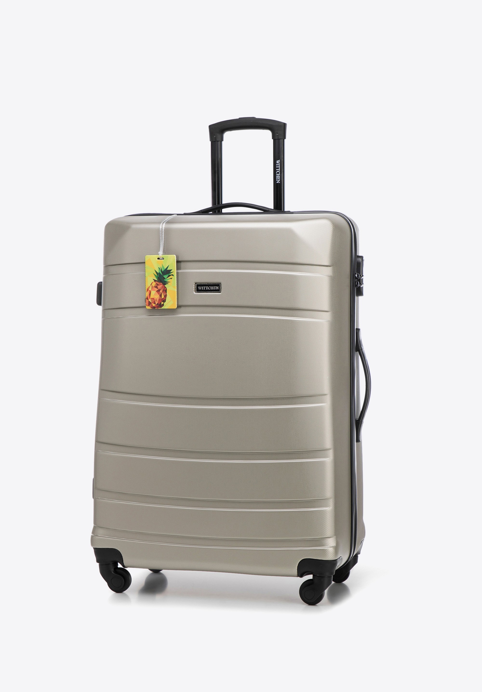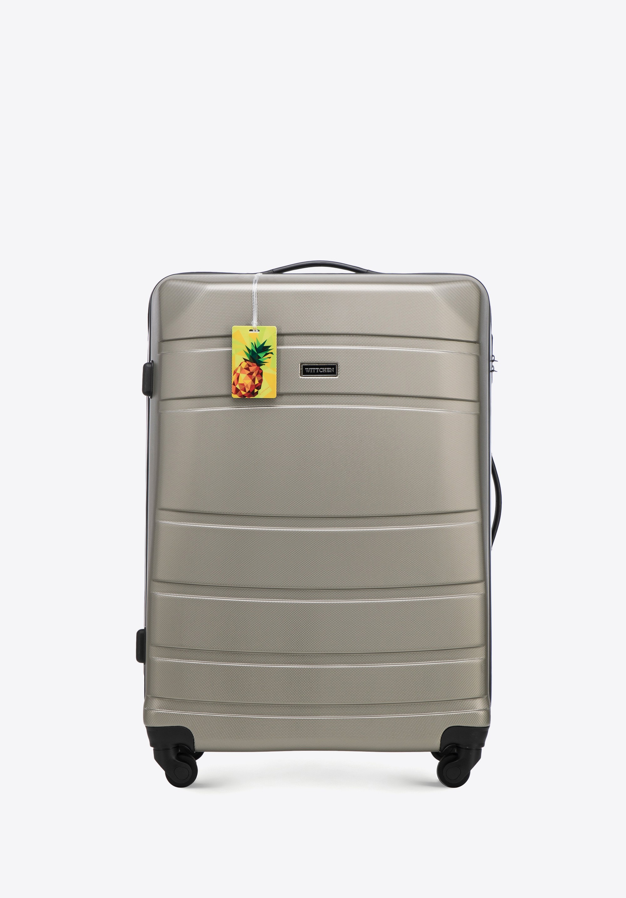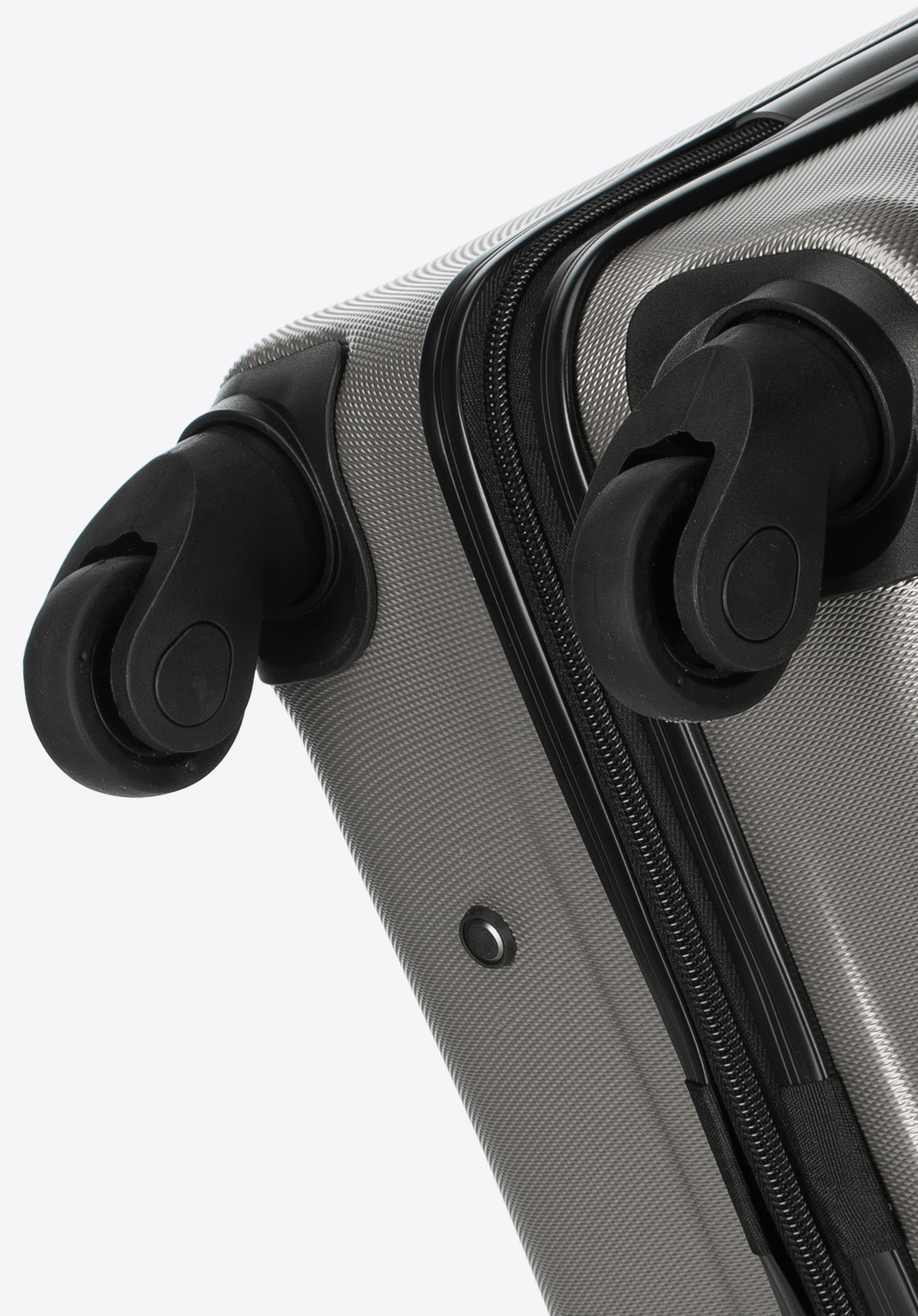 Duża walizka z ABS - u żłobiona z identyfikatorem została zaprojektowana na dłuższe wyjazdy, gdy liczy się pojemność, płynne prowadzenie i szybka identyfikacja bagażu. Wytrzymała skorupa z ABS, zamek szyfrowy, teleskopowy uchwyt i cztery obrotowe kółka zapewniają wygodę w podróży, a wnętrze z pasami i kieszeniami ułatwia pakowanie.