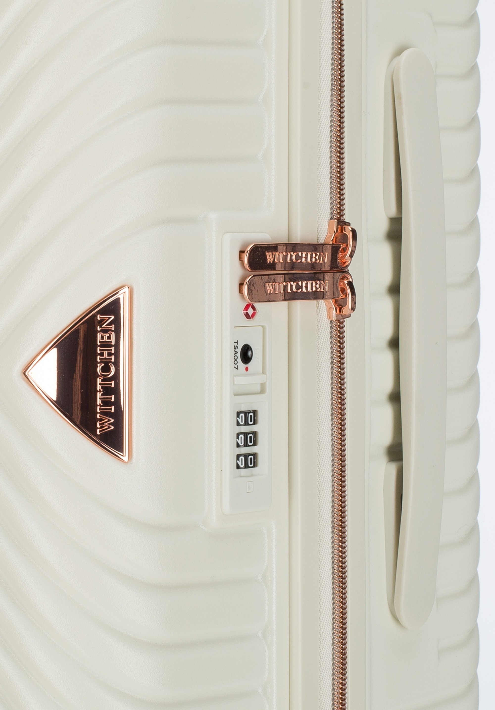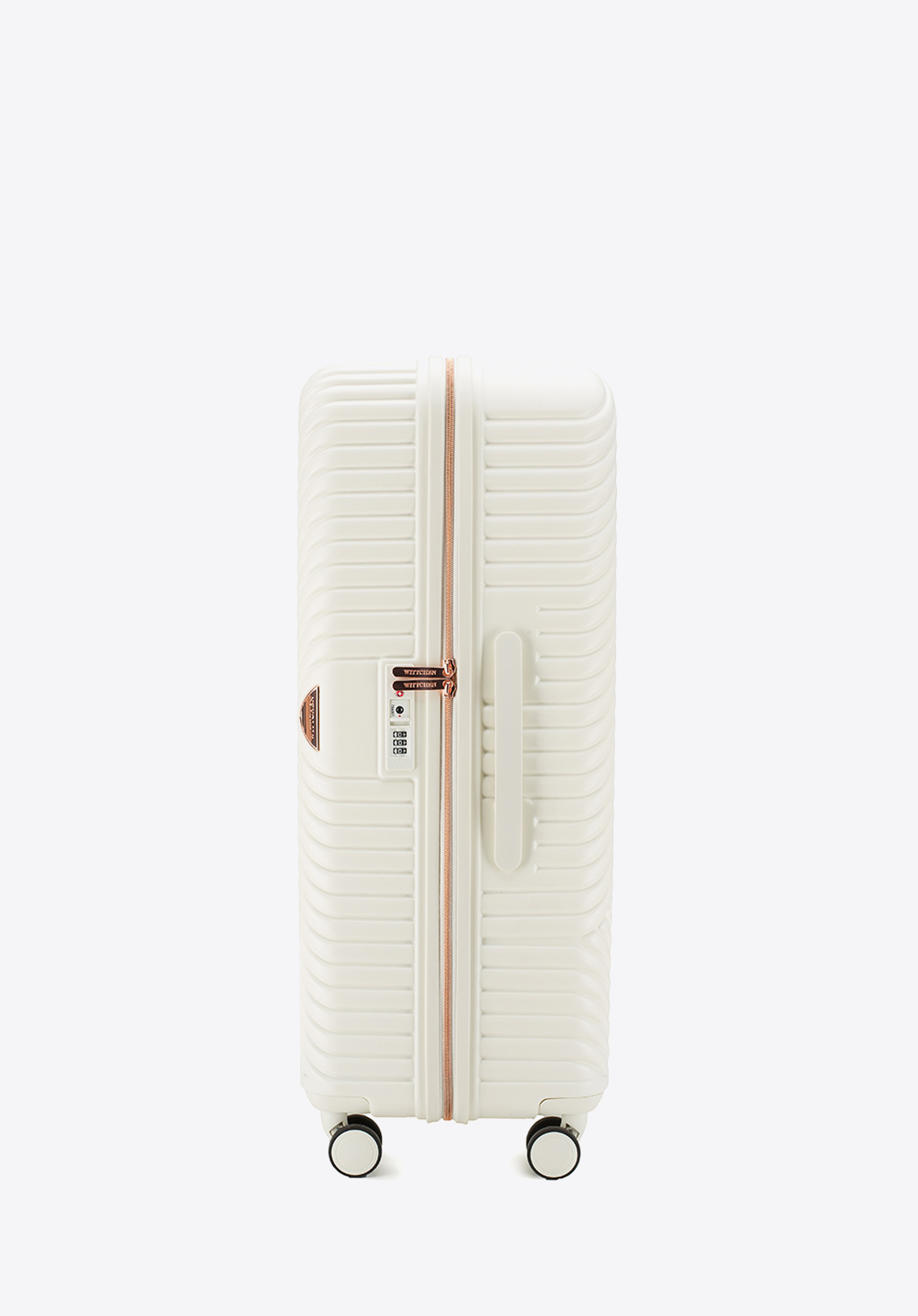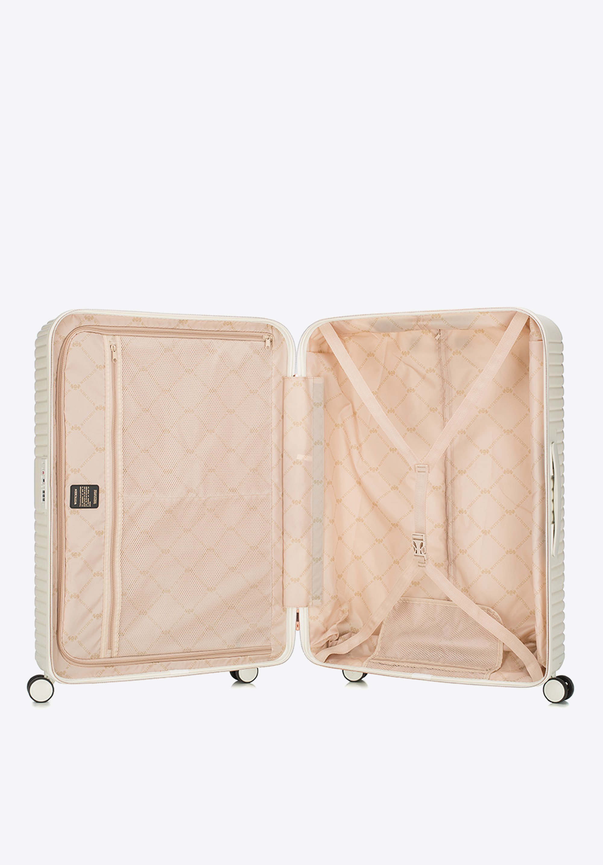 Walizka o dużej wielkości stworzona z polikarbonu z matowym wykończeniem. To designerski projekt z lśniącymi okuciami w kolorze różowego złota. Kółka wykonane z tworzywa sztucznego ABS z elastyczną powłoką. Wnętrze walizki pokrywa beżowa podszewka z logo WITTCHEN.