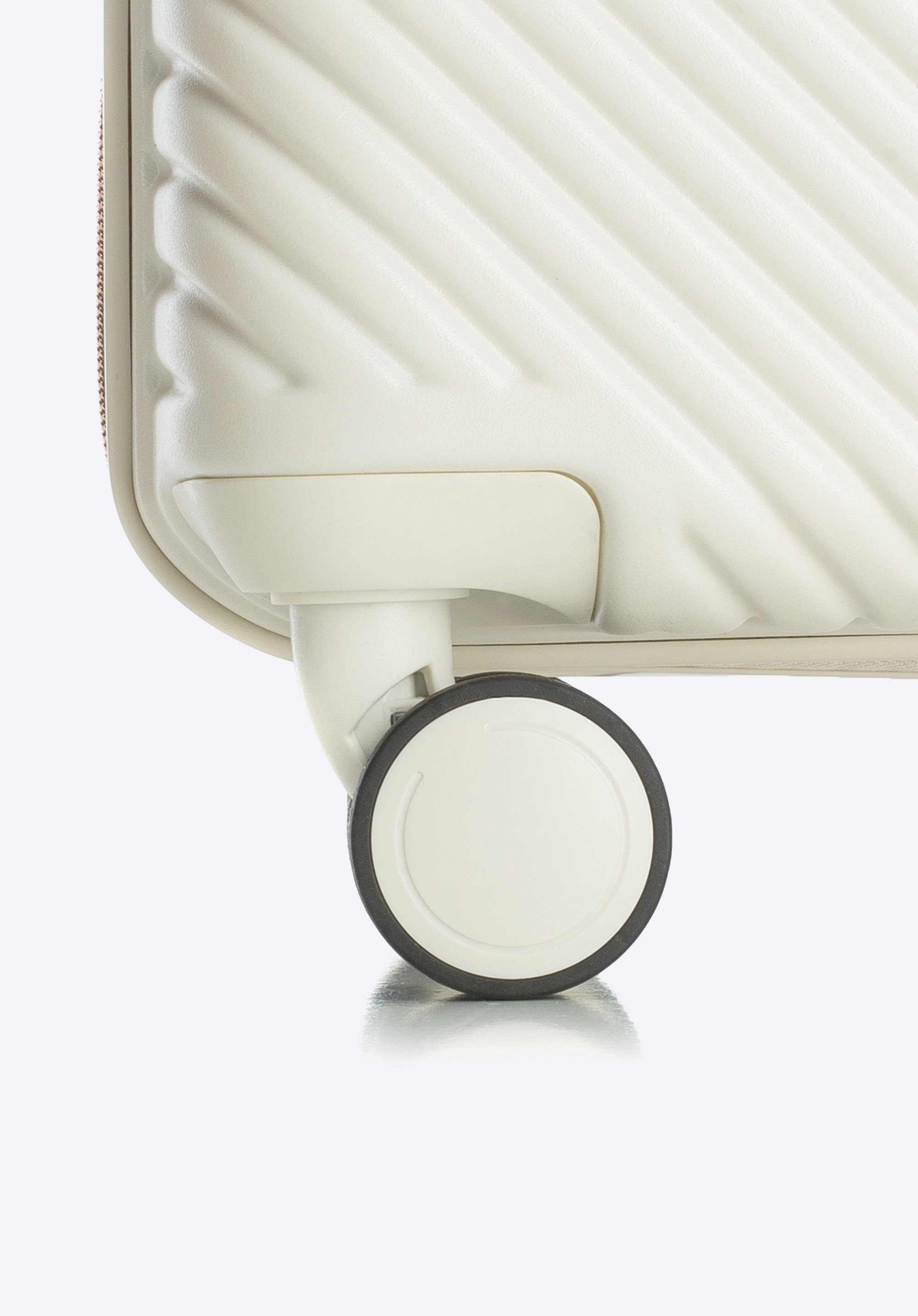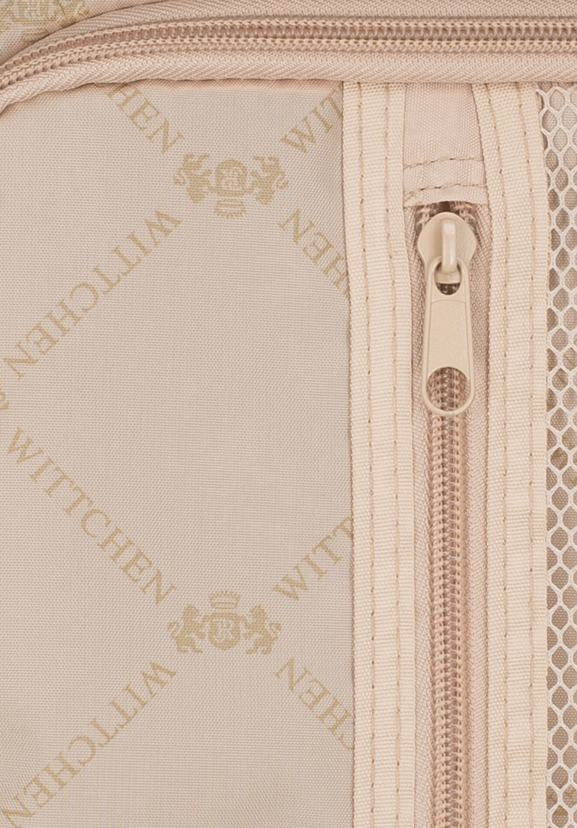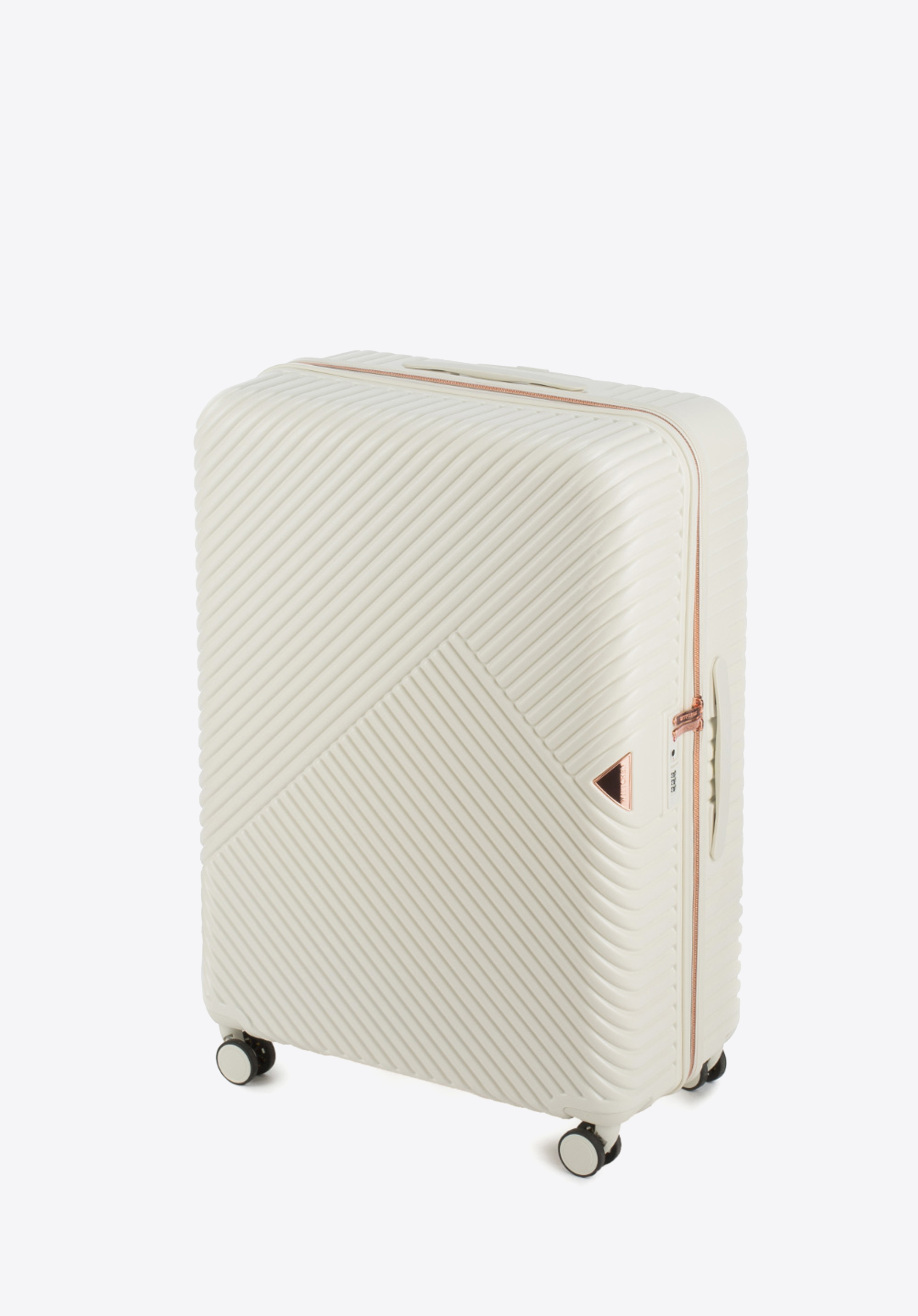 Walizka o dużej wielkości stworzona z polikarbonu z matowym wykończeniem. To designerski projekt z lśniącymi okuciami w kolorze różowego złota. Kółka wykonane z tworzywa sztucznego ABS z elastyczną powłoką. Wnętrze walizki pokrywa beżowa podszewka z logo WITTCHEN.