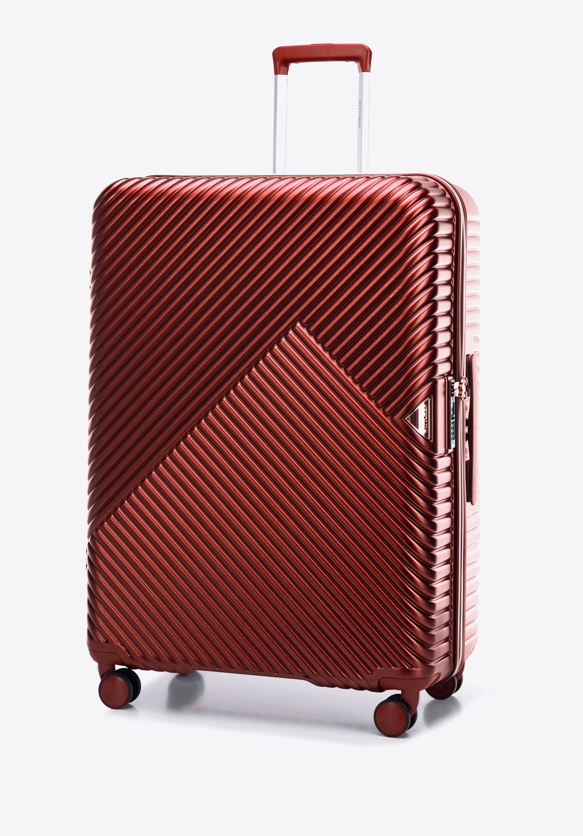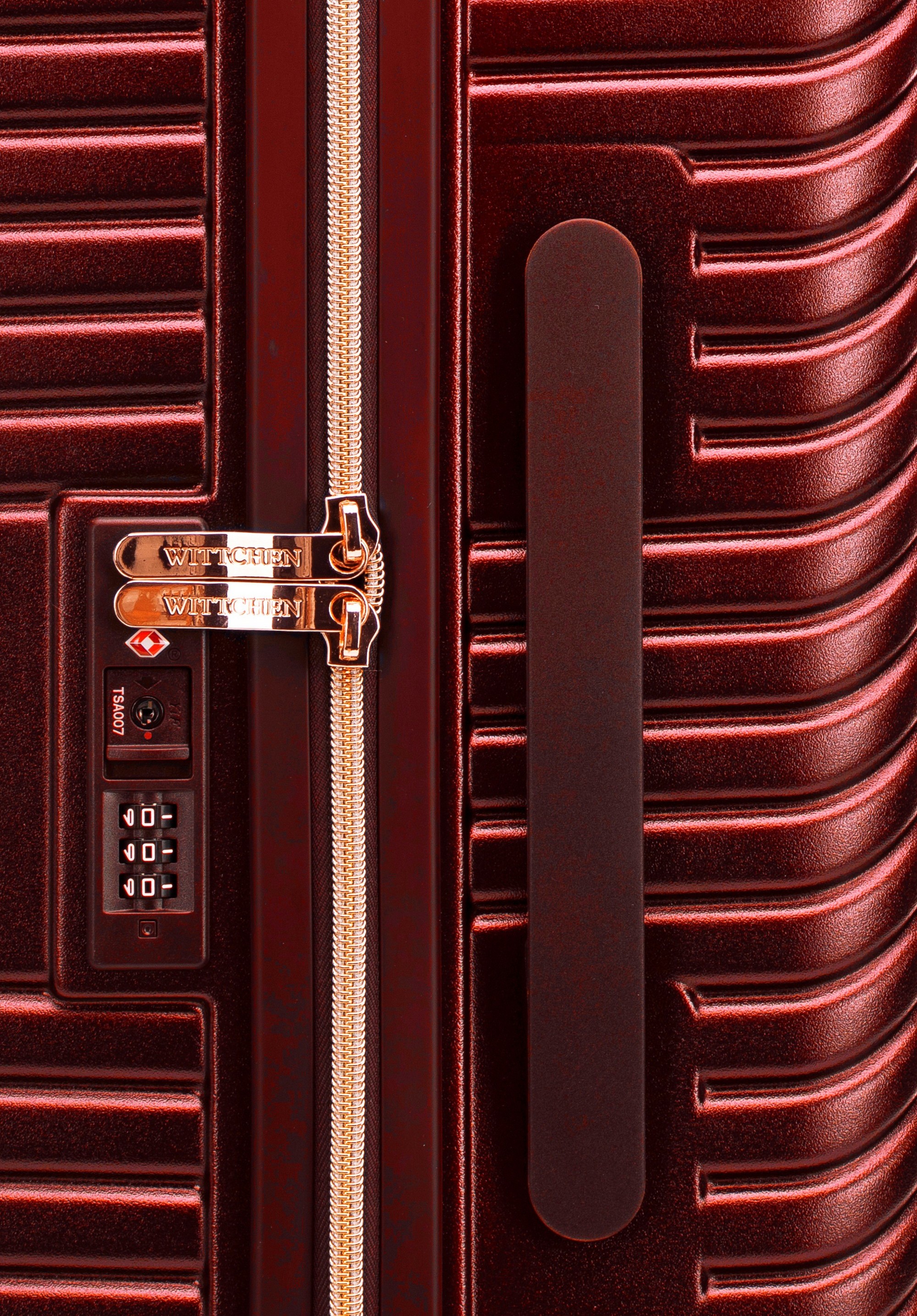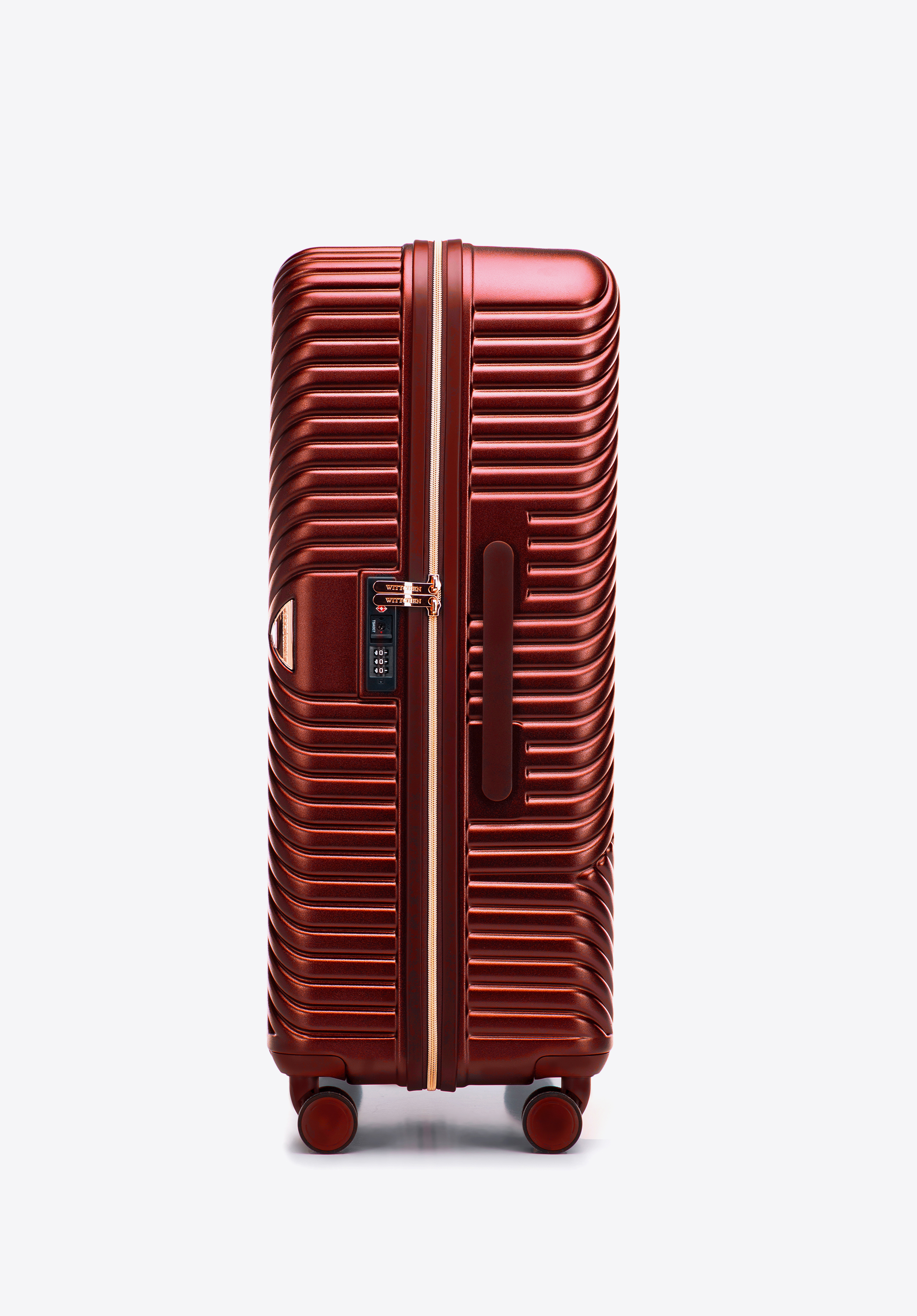 Walizka o dużej wielkości stworzona z polikarbonu z matowym wykończeniem. To designerski projekt z lśniącymi okuciami w kolorze różowego złota. Kółka wykonane z tworzywa sztucznego ABS z elastyczną powłoką. Wnętrze walizki pokrywa beżowa podszewka z logo WITTCHEN.
