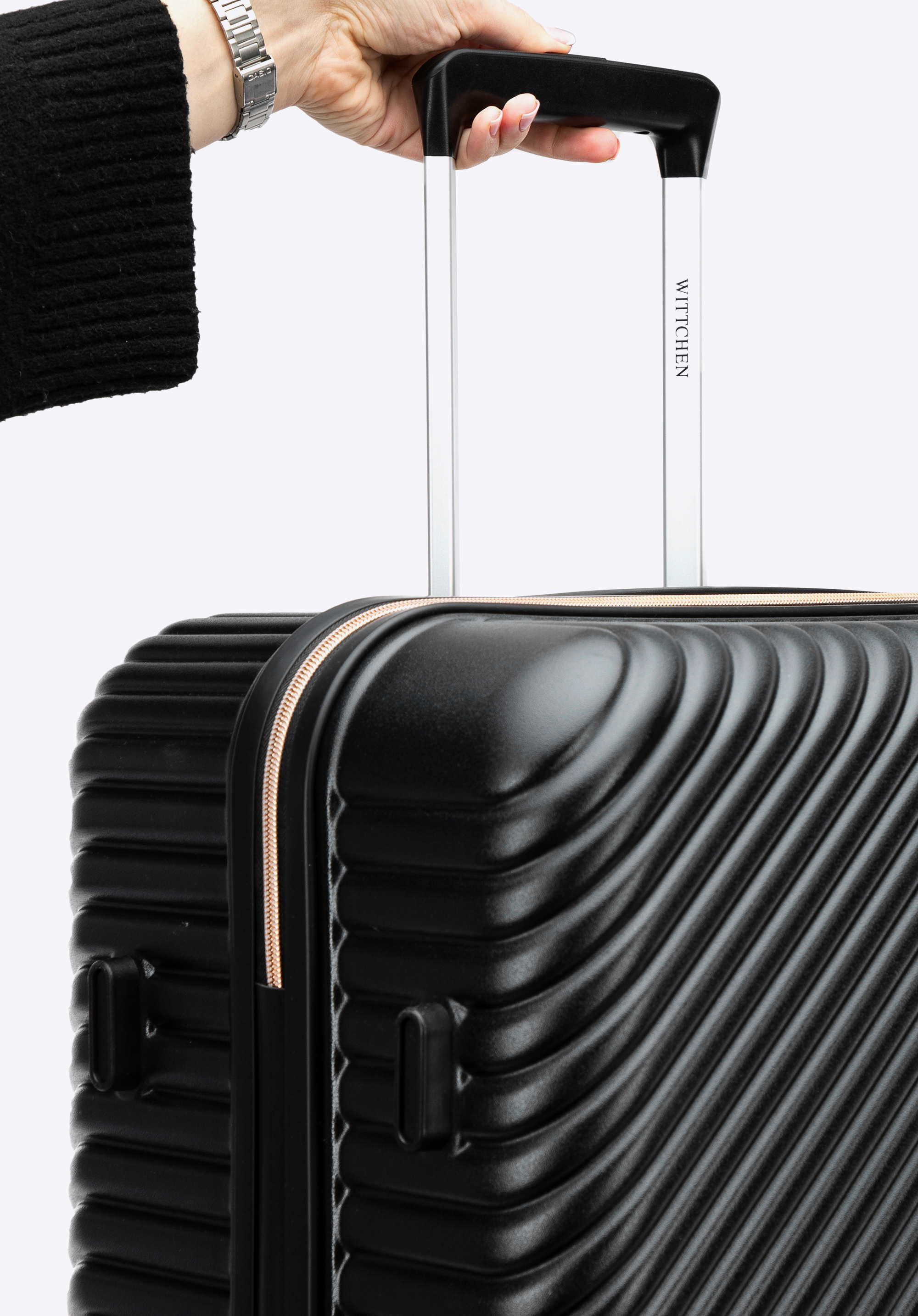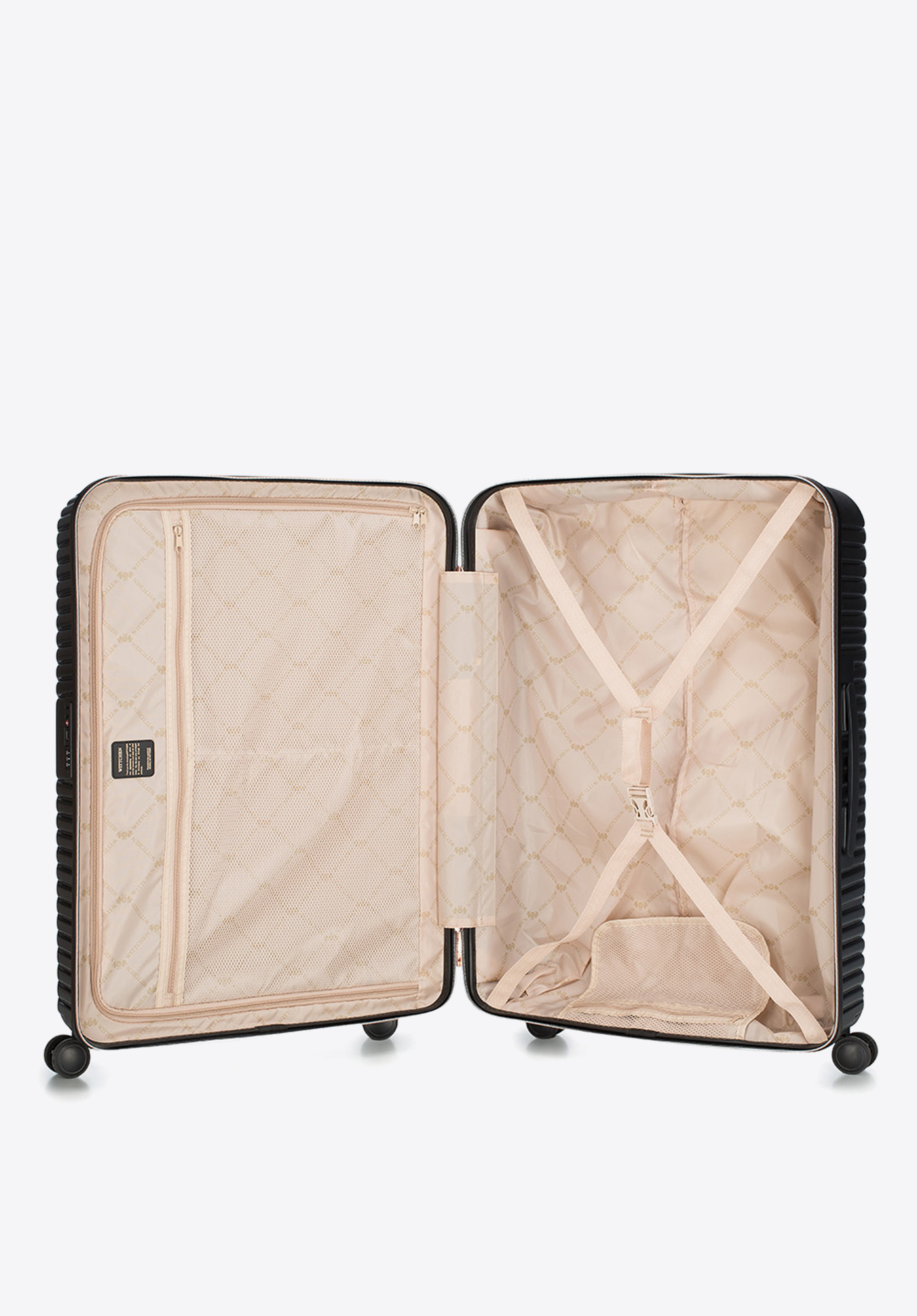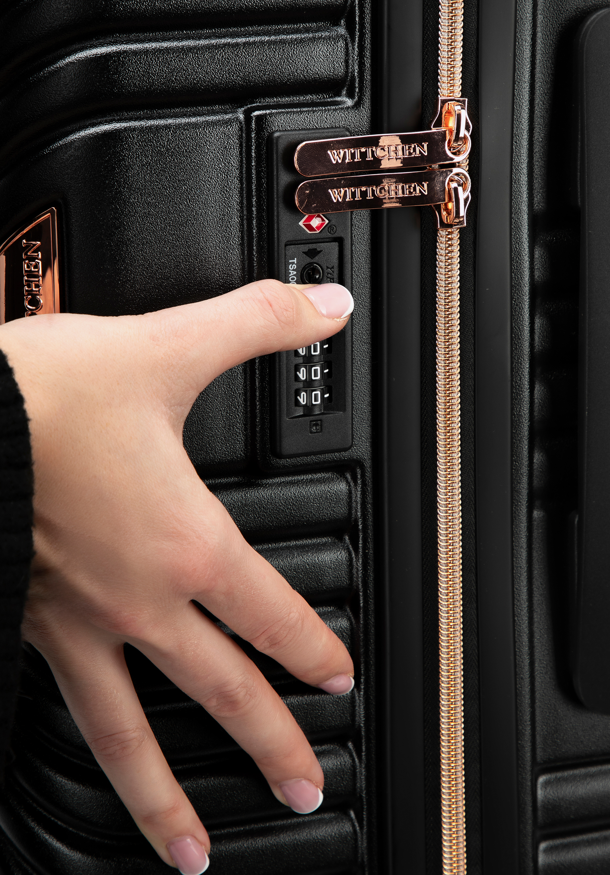 Walizka o dużej wielkości stworzona z polikarbonu z matowym wykończeniem. To designerski projekt z lśniącymi okuciami w kolorze różowego złota. Kółka wykonane z tworzywa sztucznego ABS z elastyczną powłoką. Wnętrze walizki pokrywa beżowa podszewka z logo WITTCHEN.