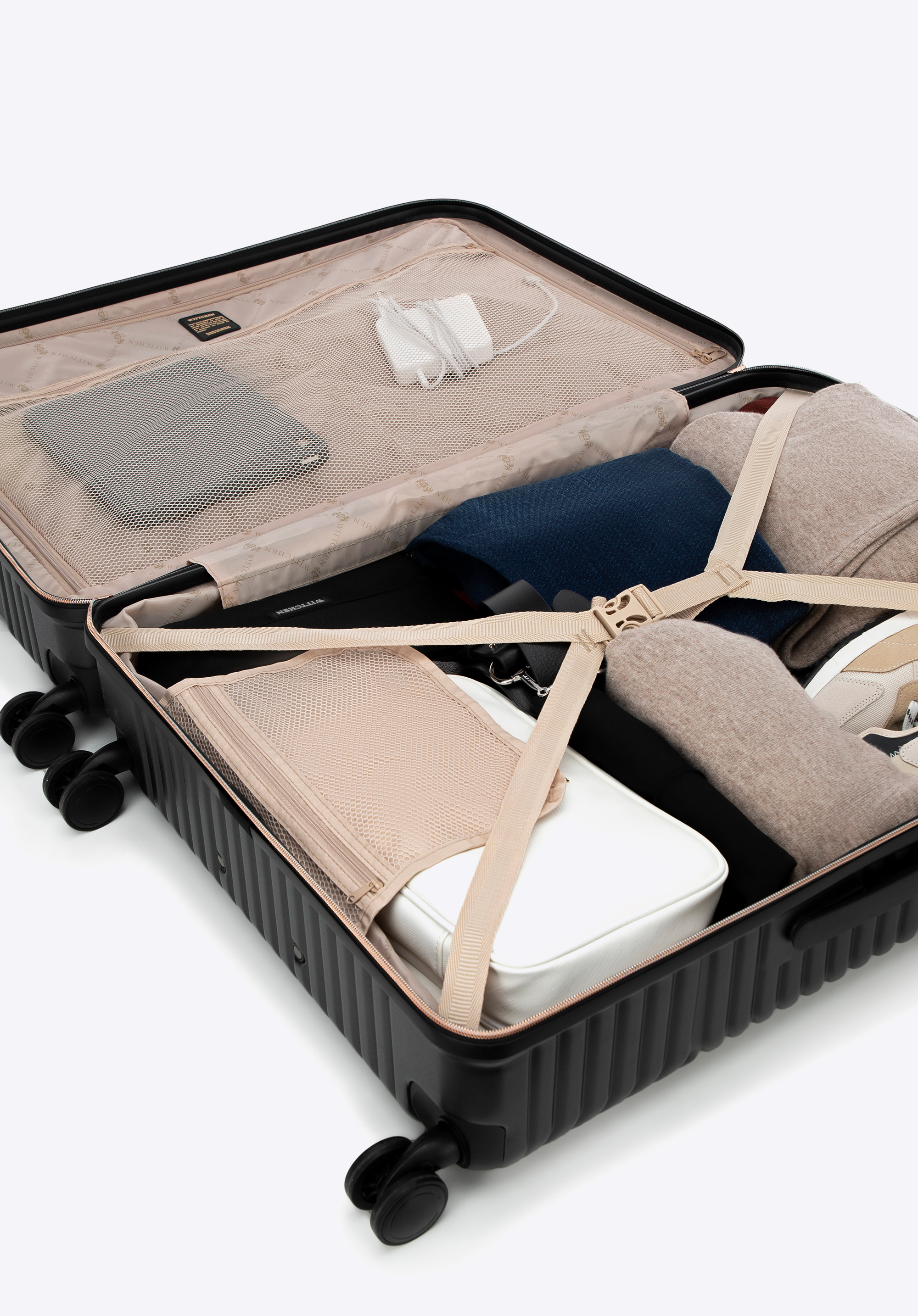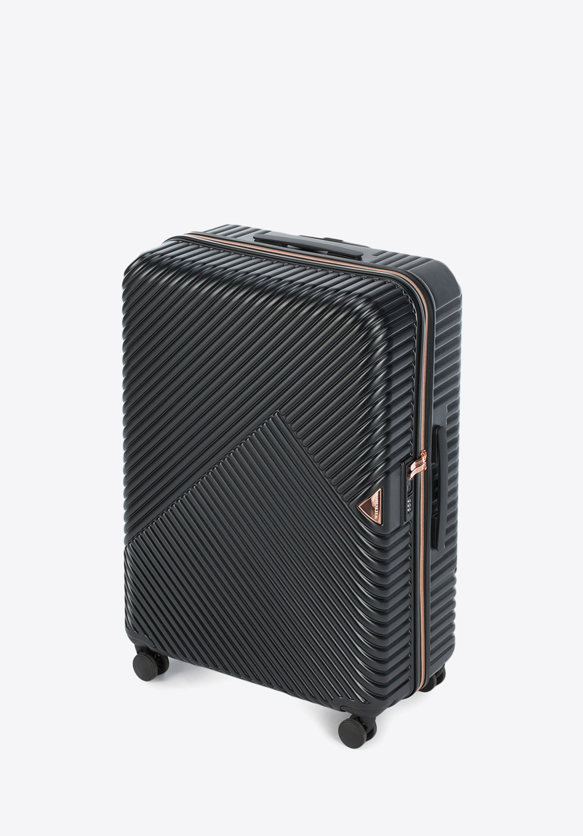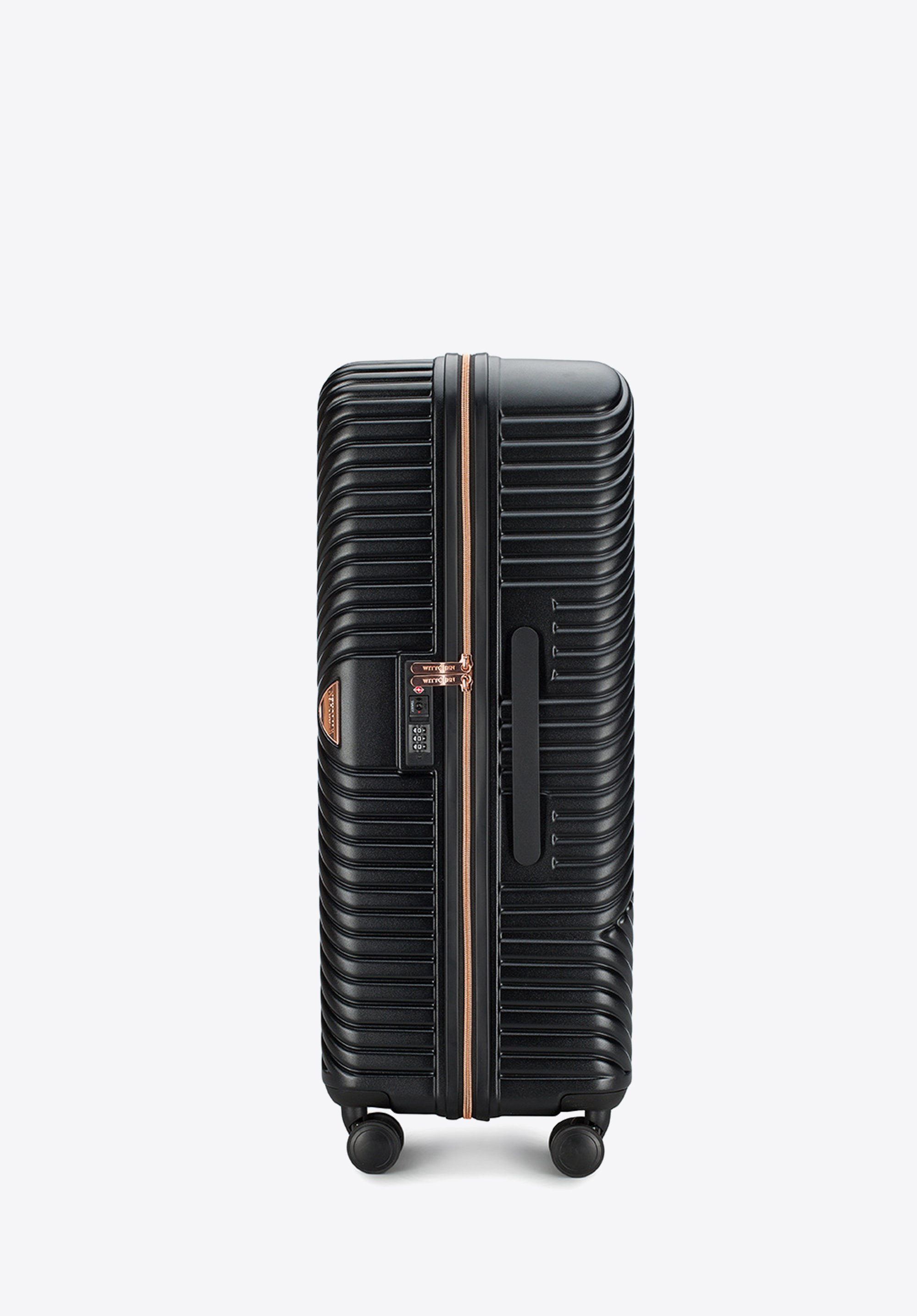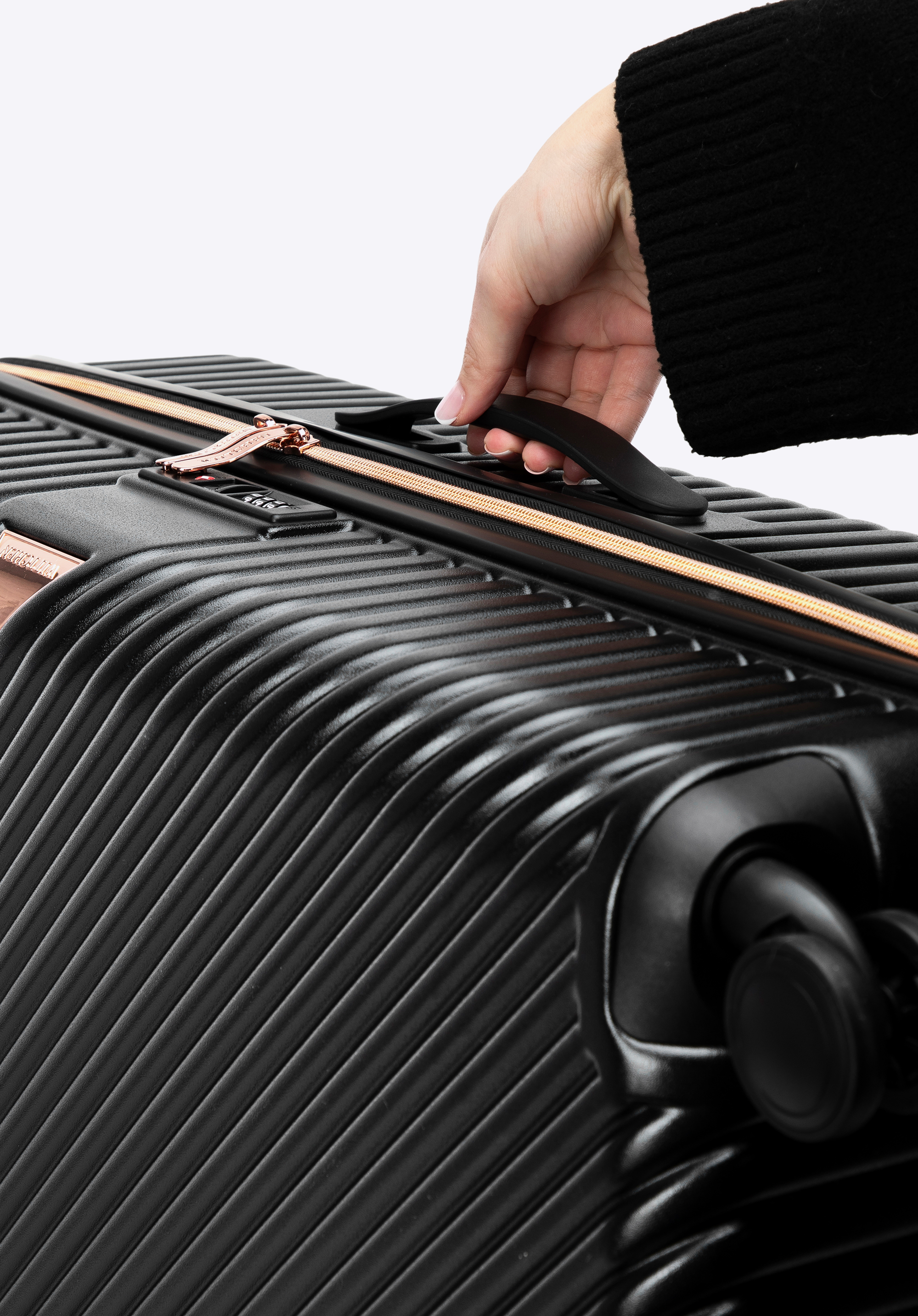 Walizka o dużej wielkości stworzona z polikarbonu z matowym wykończeniem. To designerski projekt z lśniącymi okuciami w kolorze różowego złota. Kółka wykonane z tworzywa sztucznego ABS z elastyczną powłoką. Wnętrze walizki pokrywa beżowa podszewka z logo WITTCHEN.