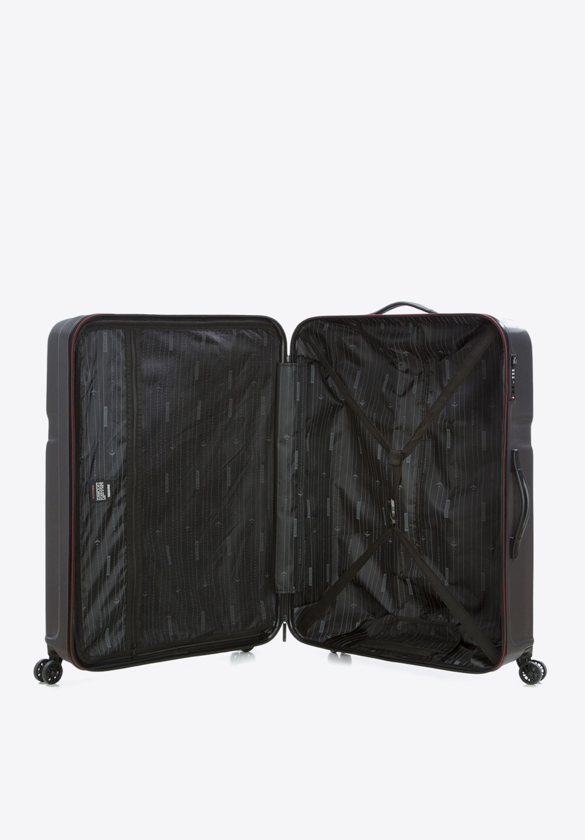 Walizka o dużej wielkości wykonana z policarbonu, stworzona z myślą o zapewnieniu najwyższej ochrony przewożonego bagażu. Czerwona nić wpleciona w taśmę suwaka podkreśla nowoczesną stylistykę bagażu. Walizka wzmocniona podwójną taśmą suwaka, posiada cechę 'AntiTheft', która stanowi doskonałe zabezpieczenie przed niechcianym otwarciem walizki przy pomocy ostro zakończonego przedmiotu.