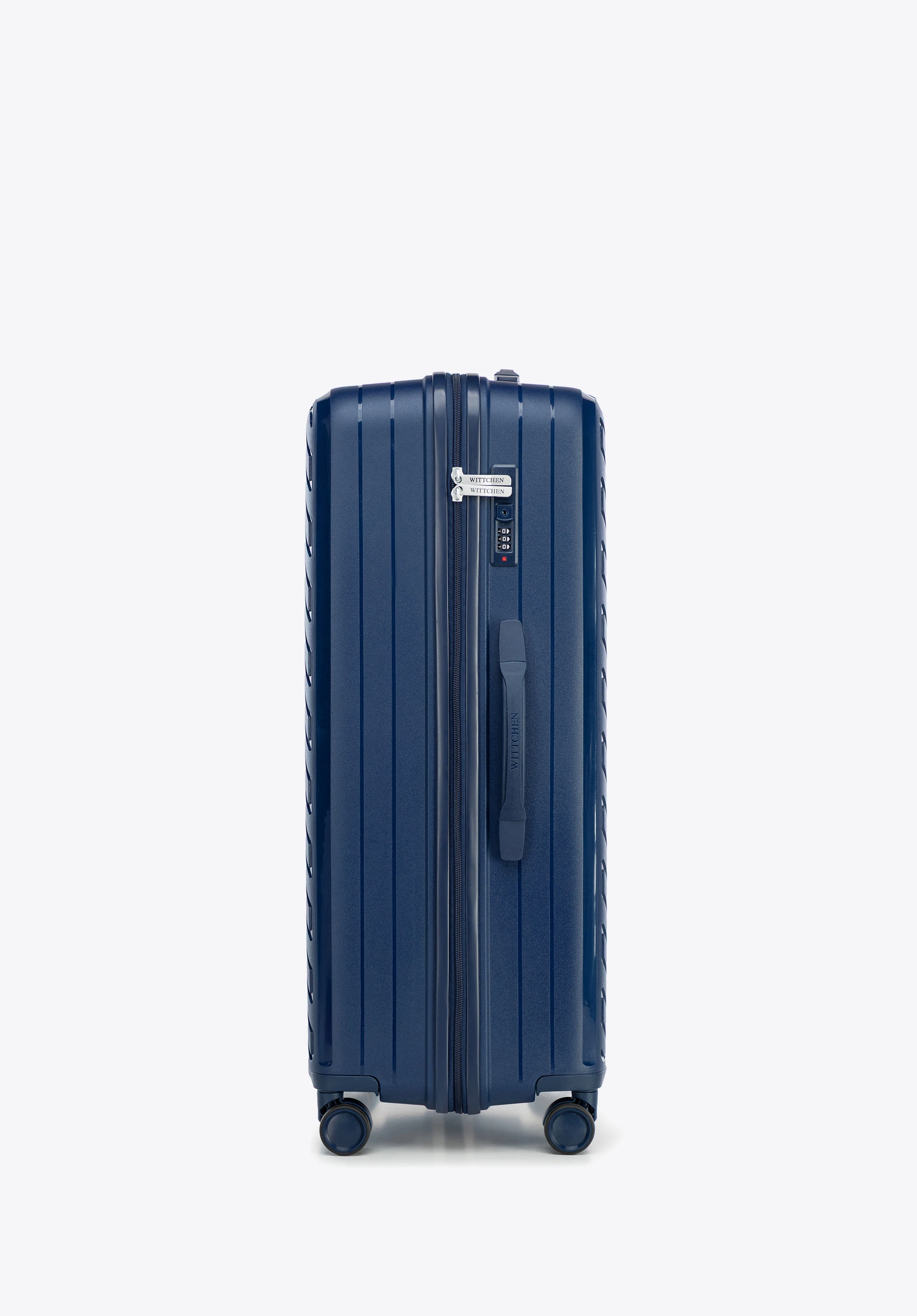 Duża walizka z polipropylenu w tłoczone paski to wybór na długie wakacje i dalekie podróże, kiedy potrzebujesz maksymalnej pojemności i pewnej ochrony zawartości. Wytrzymały polipropylen, zamek szyfrowy, dwie komory i podwójne kółka prowadzą bagaż stabilnie, nawet przy pełnym załadunku.