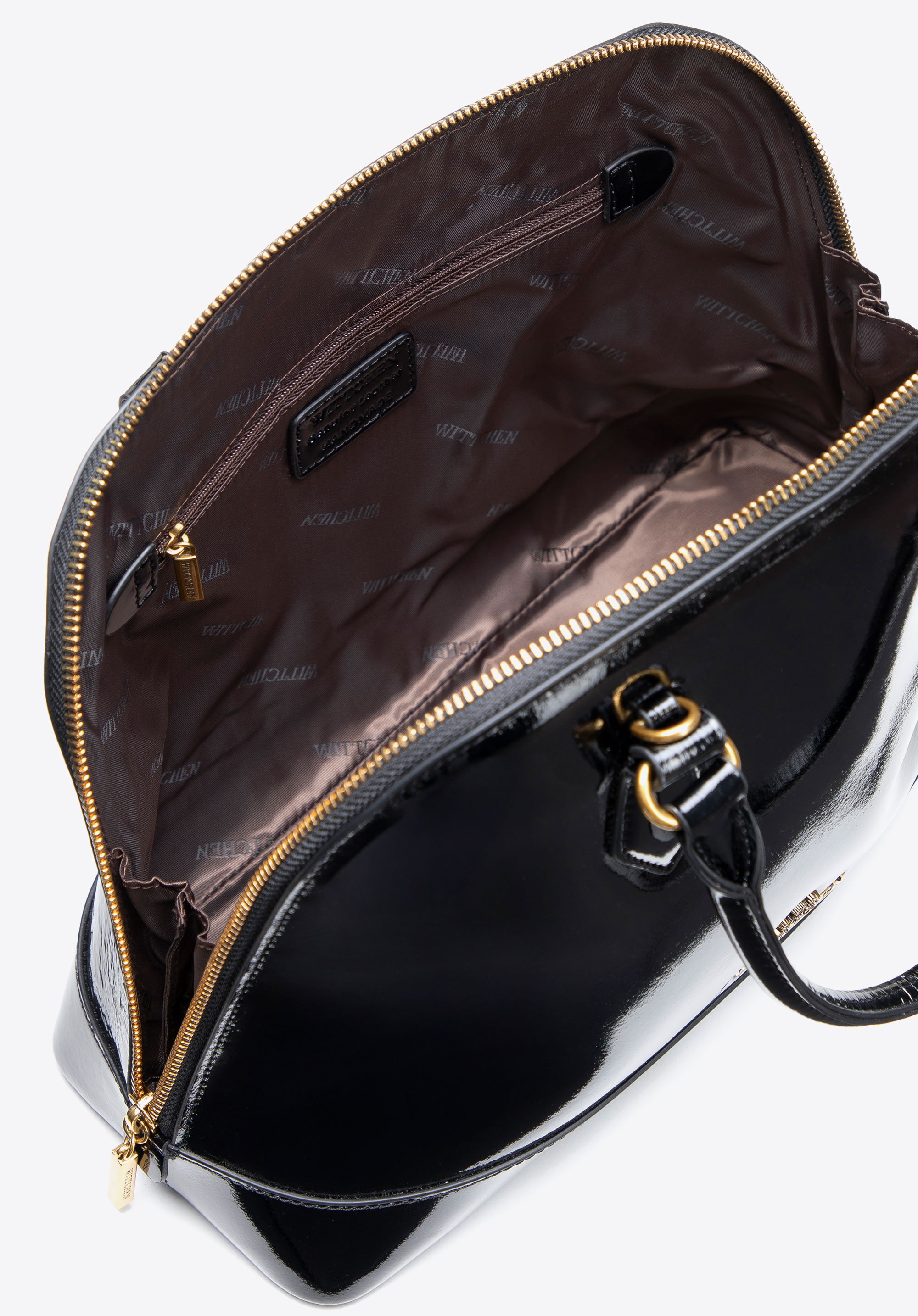 - Materiał: Korpus ze skóry lakierowanej zachwyci Cię luksusowym połyskiem i odpornością na codzienne użytkowanie, a miękkie wykończenia z imitacji skóry w rączkach, pasku i elementach wewnętrznych zapewnią Ci lekkość, wygodę i przyjemny kontakt z dłonią, jednocześnie chroniąc wnętrze torby przed zużyciem.