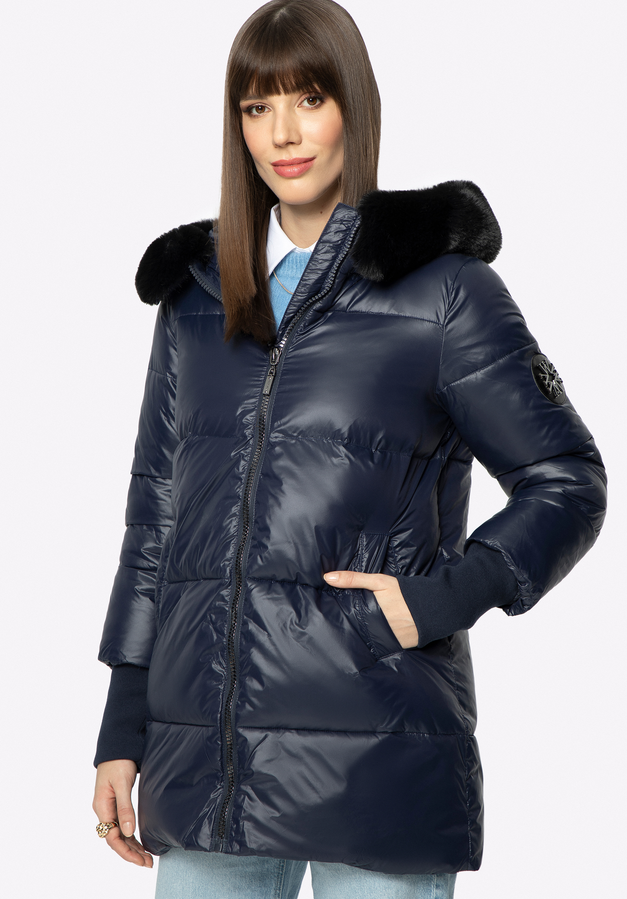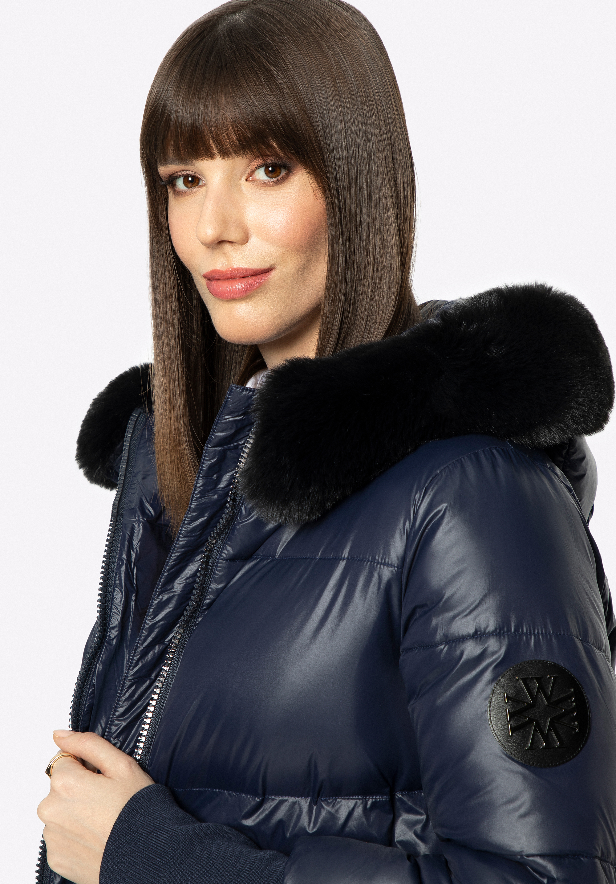 - fixed hood with detachable faux fur trim;