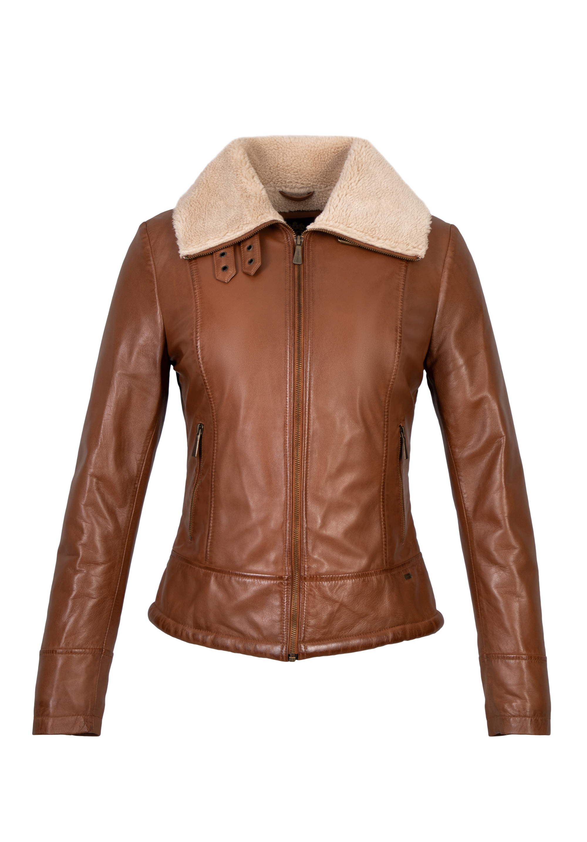 soft natural leather with faux shearling lining, this piece of garment is finished with a classic turn down collar with a