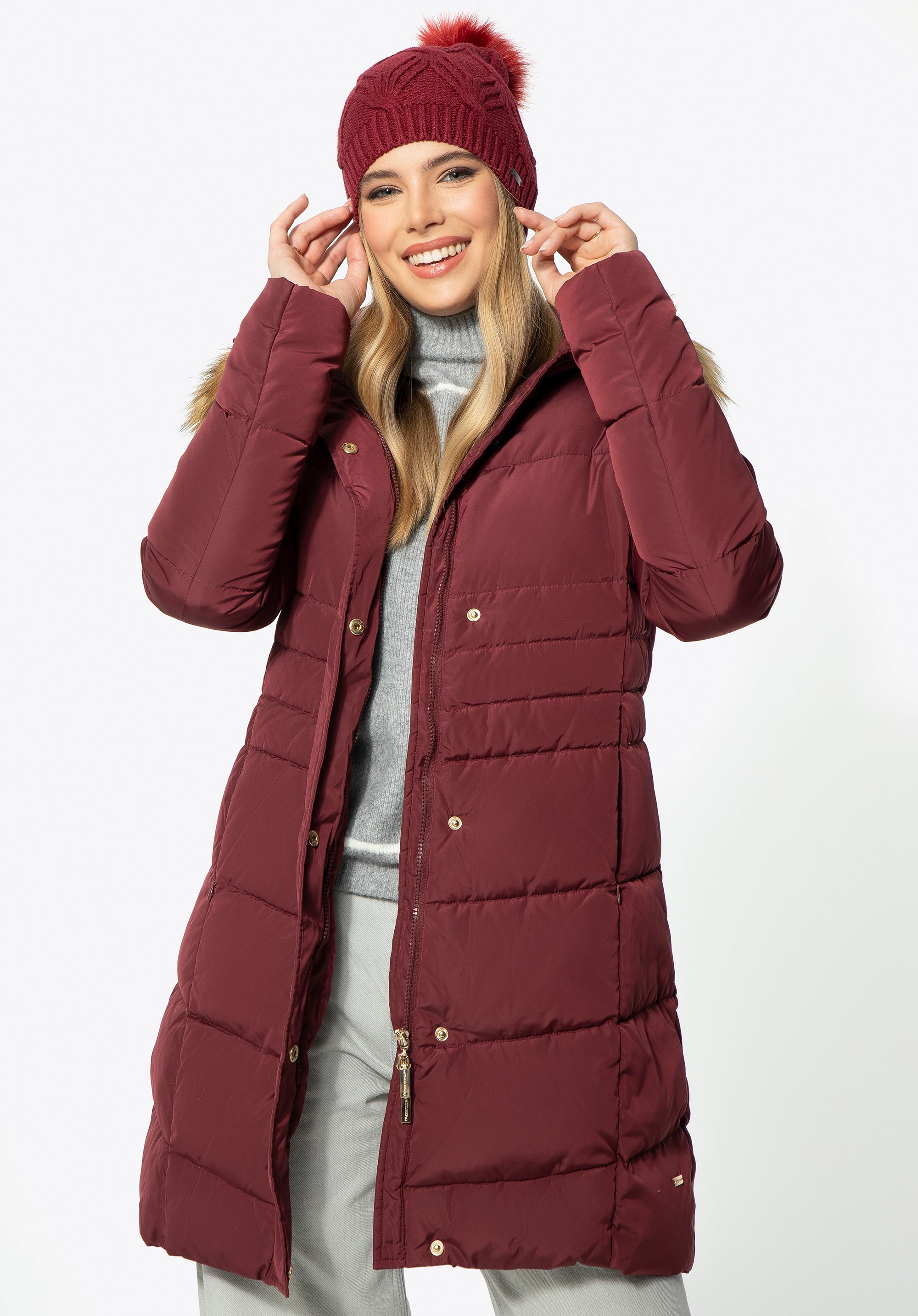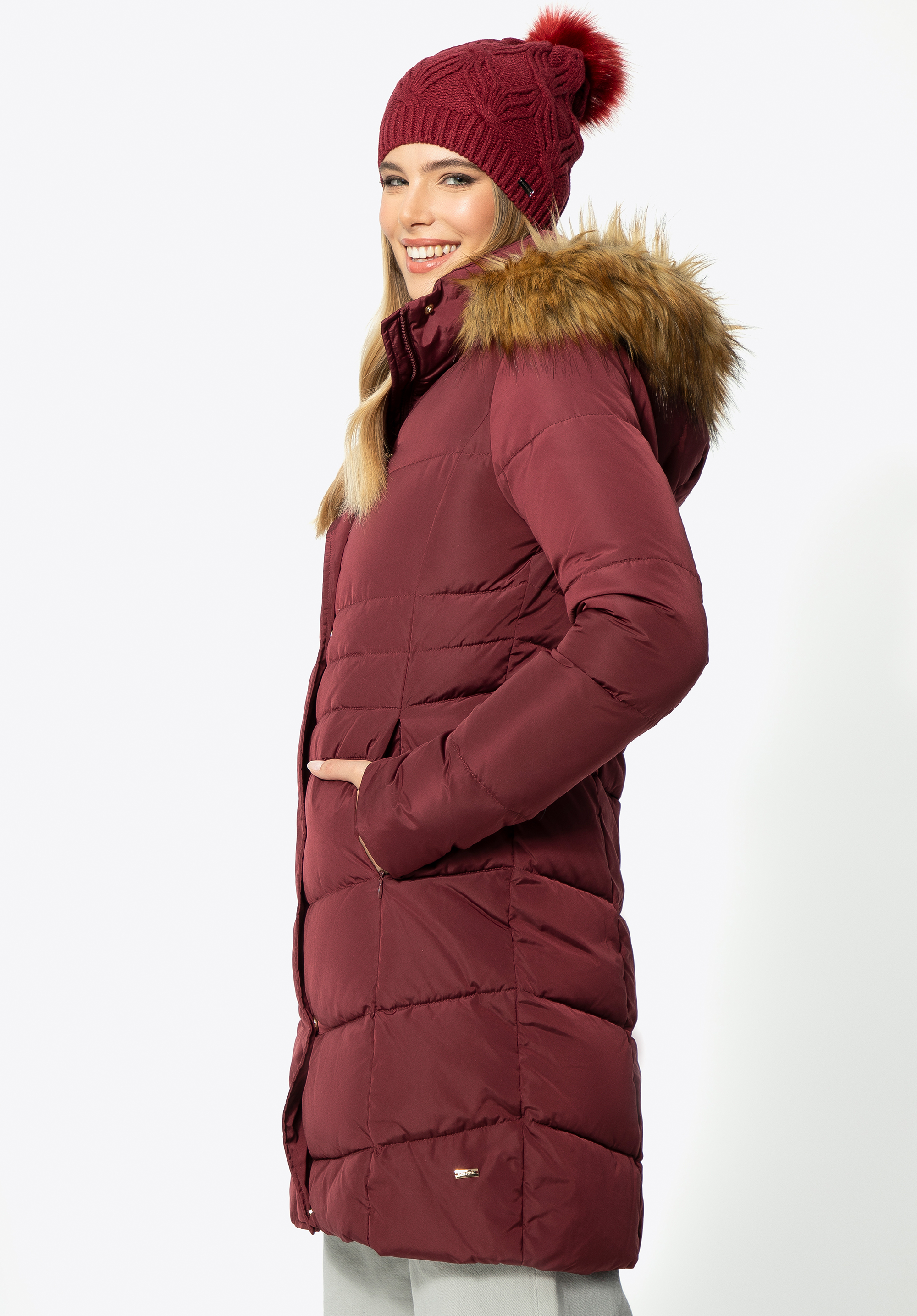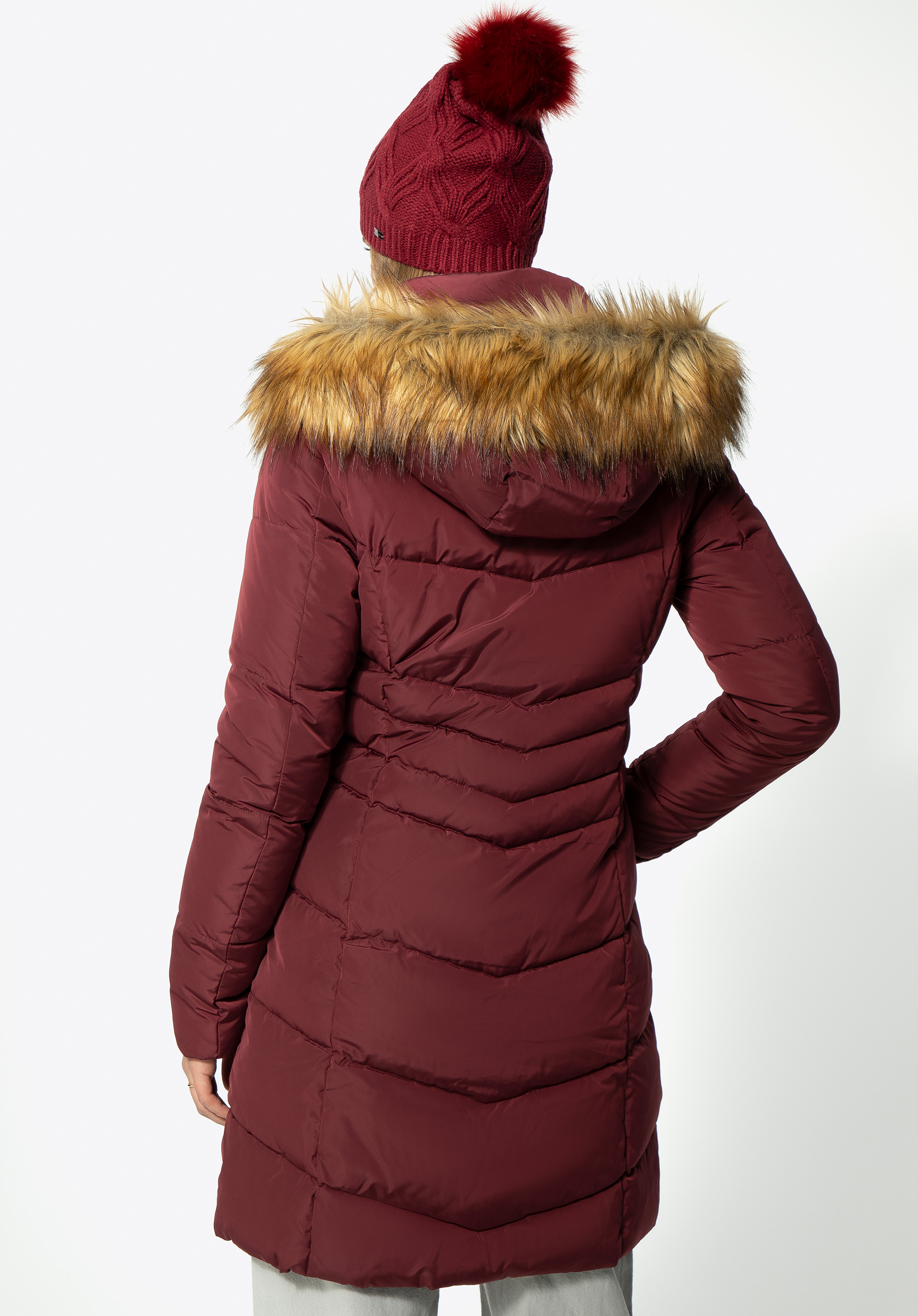 Warm and stylish jacket will keep you warm and toasty on autumn and winter days. Warm insulation - 70% duck down with duck feather - keeps you protected from the elements with elegant tailored design. Finished with a large faux fur trimmed hood, this piece of garment gives great protection in chilly weather. Keeping the cold at bay has been never easier with this stylish chevron quilted design. The fashionable length of the overcoat and its simple cut look exceptionally elegant and make the female silhouette look more delicate.