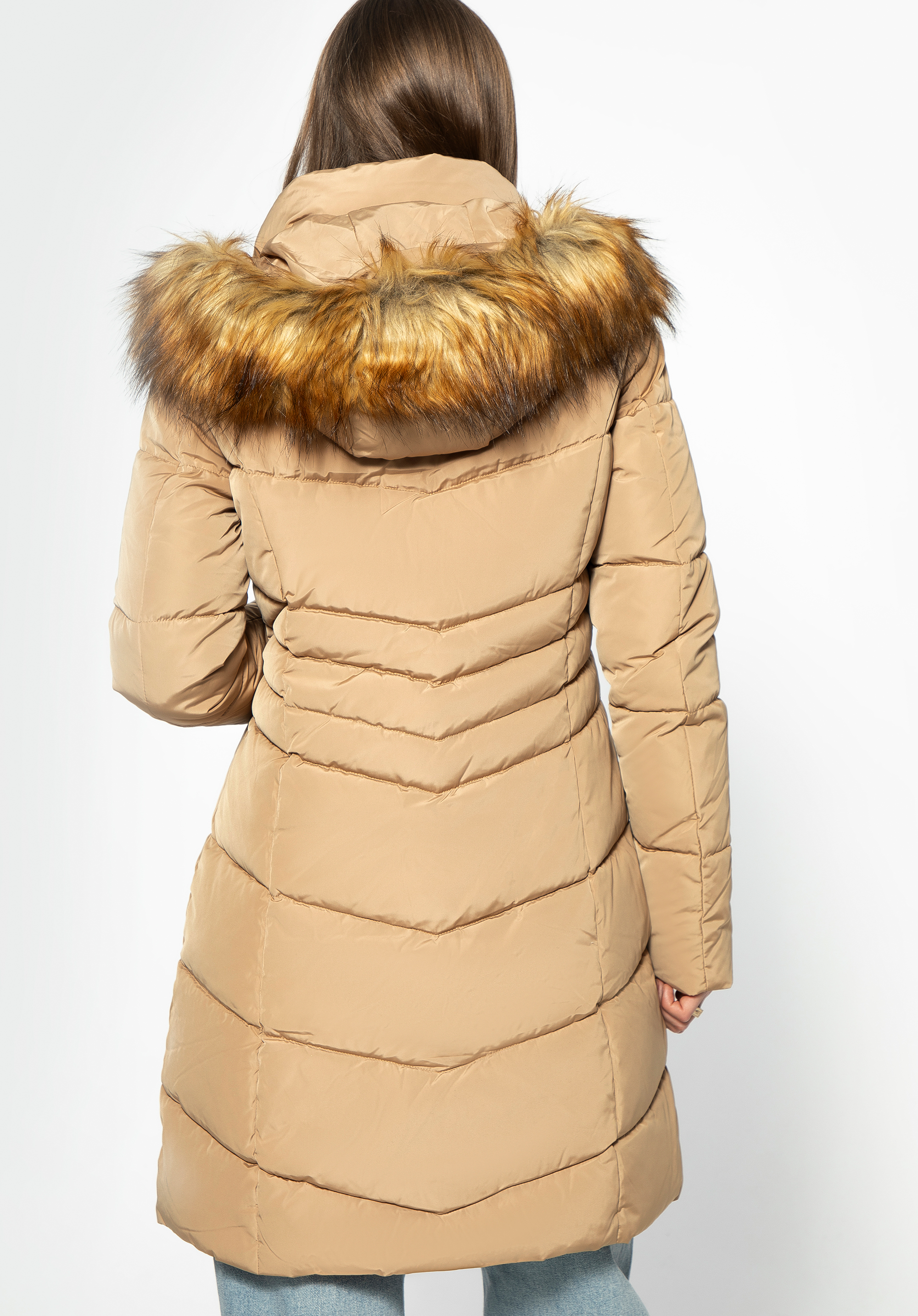 Warm and stylish jacket will keep you warm and toasty on autumn and winter days. Warm insulation - 70% duck down with duck feather - keeps you protected from the elements with elegant tailored design. Finished with a large faux fur trimmed hood, this piece of garment gives great protection in chilly weather. Keeping the cold at bay has been never easier with this stylish chevron quilted design. The fashionable length of the overcoat and its simple cut look exceptionally elegant and make the female silhouette look more delicate.