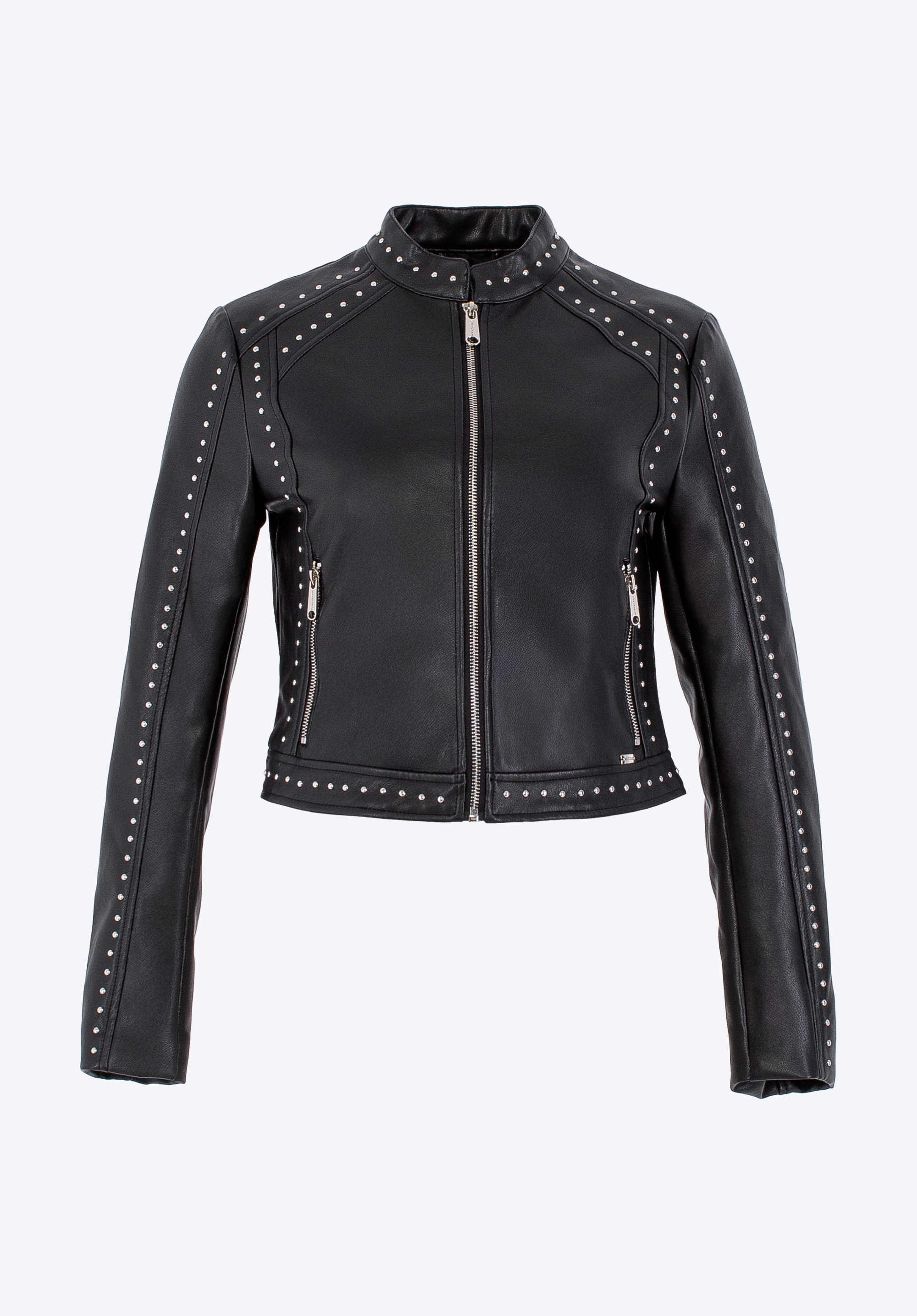 This jacket is a must-have for every woman who values a blend of classic and bold style. Made from faux leather, it combines modernity with elegance, while metal details – the brand logo on the side and zips – give it a unique character. Shiny studs on the sleeves, collar, and edges bring a bold, eye-catching detail to the design. The zip fastening, classic stand-up collar, and two zipped pockets ensure comfort and practicality in any situation.