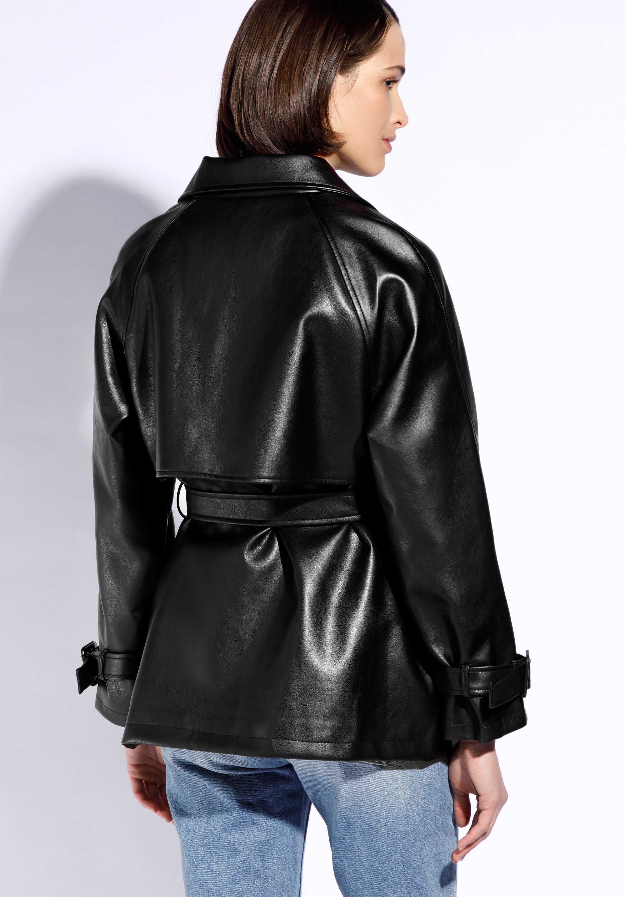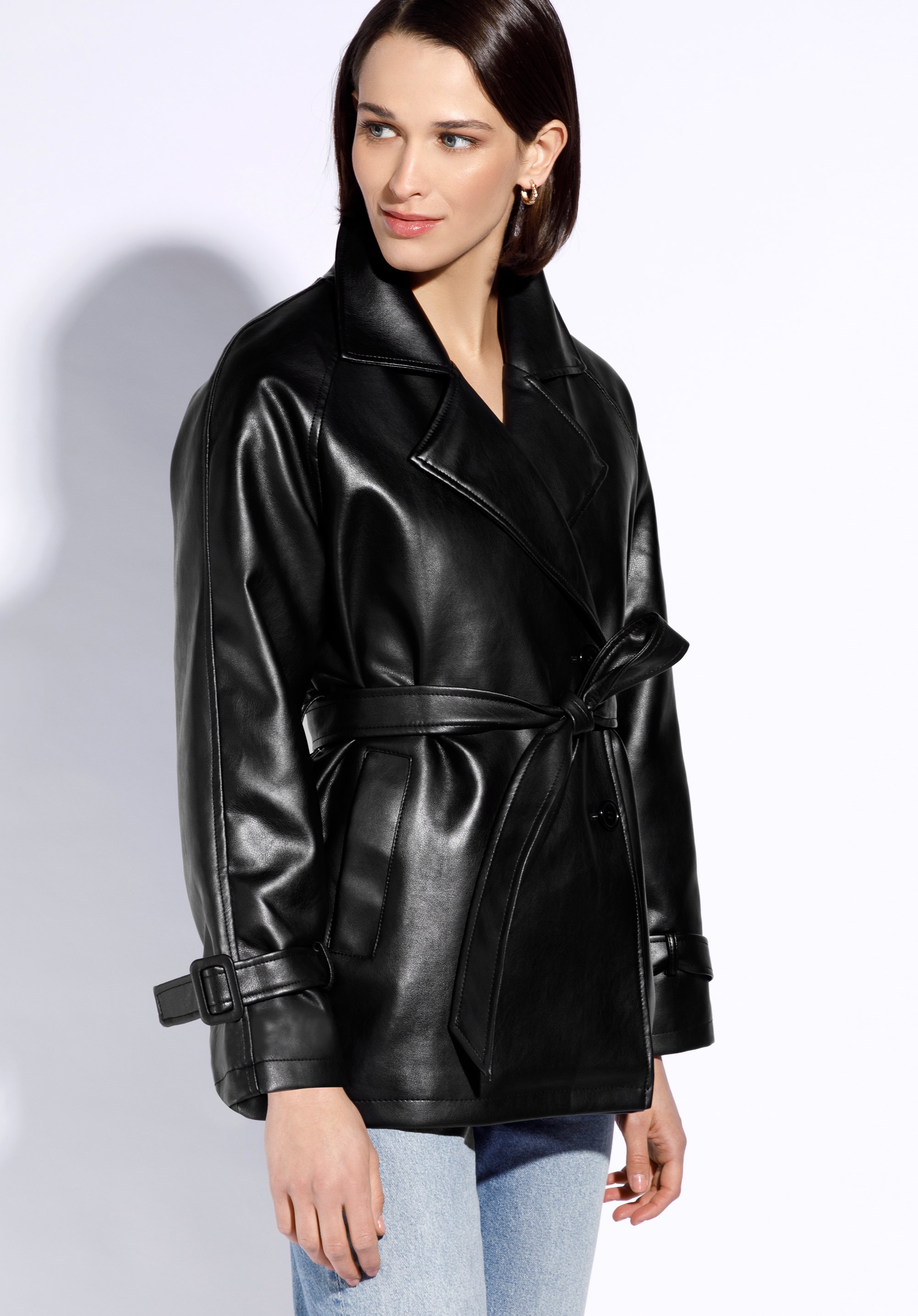 Women's faux leather jacket with a belt is a great choice for summer, autumn or spring.