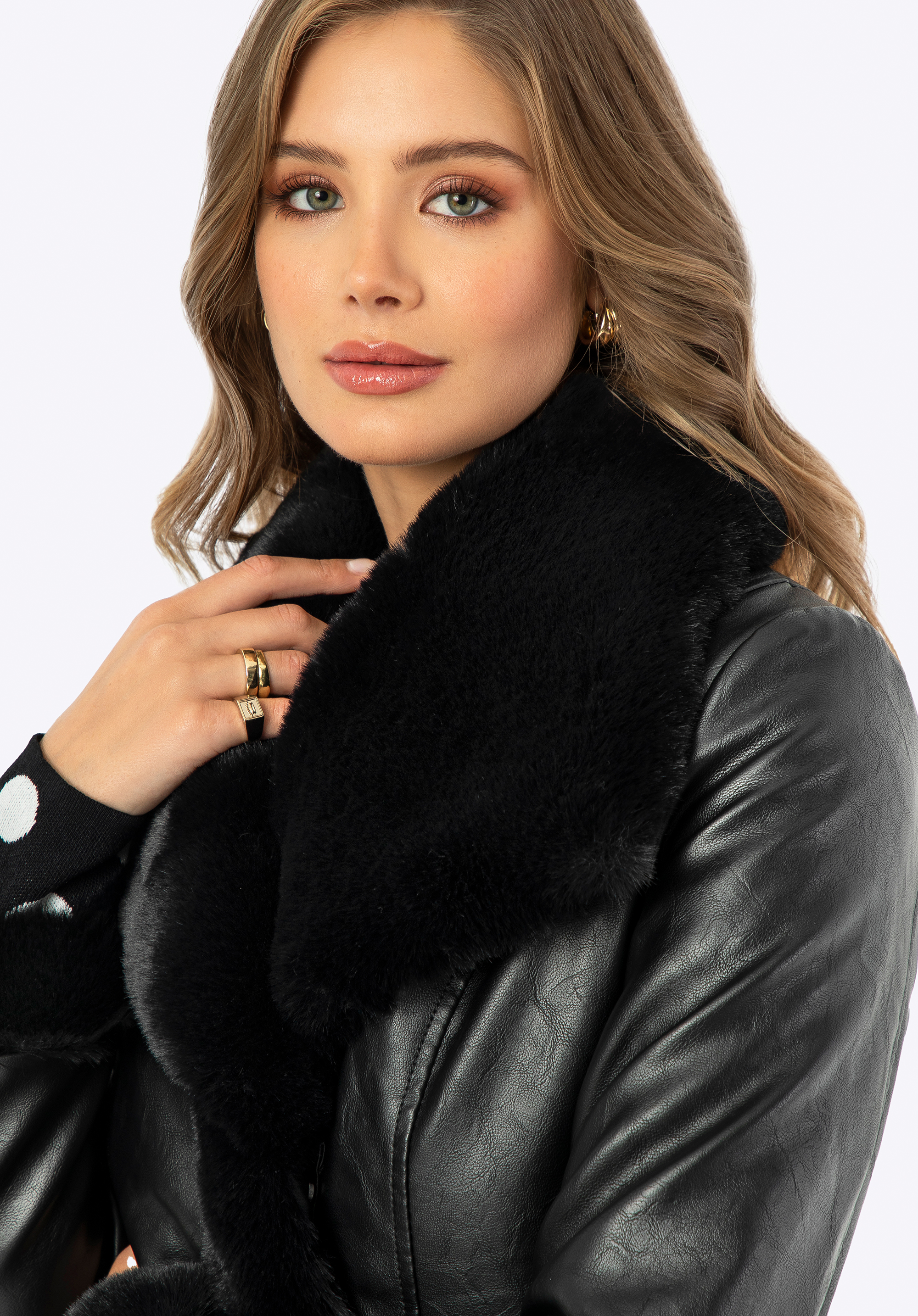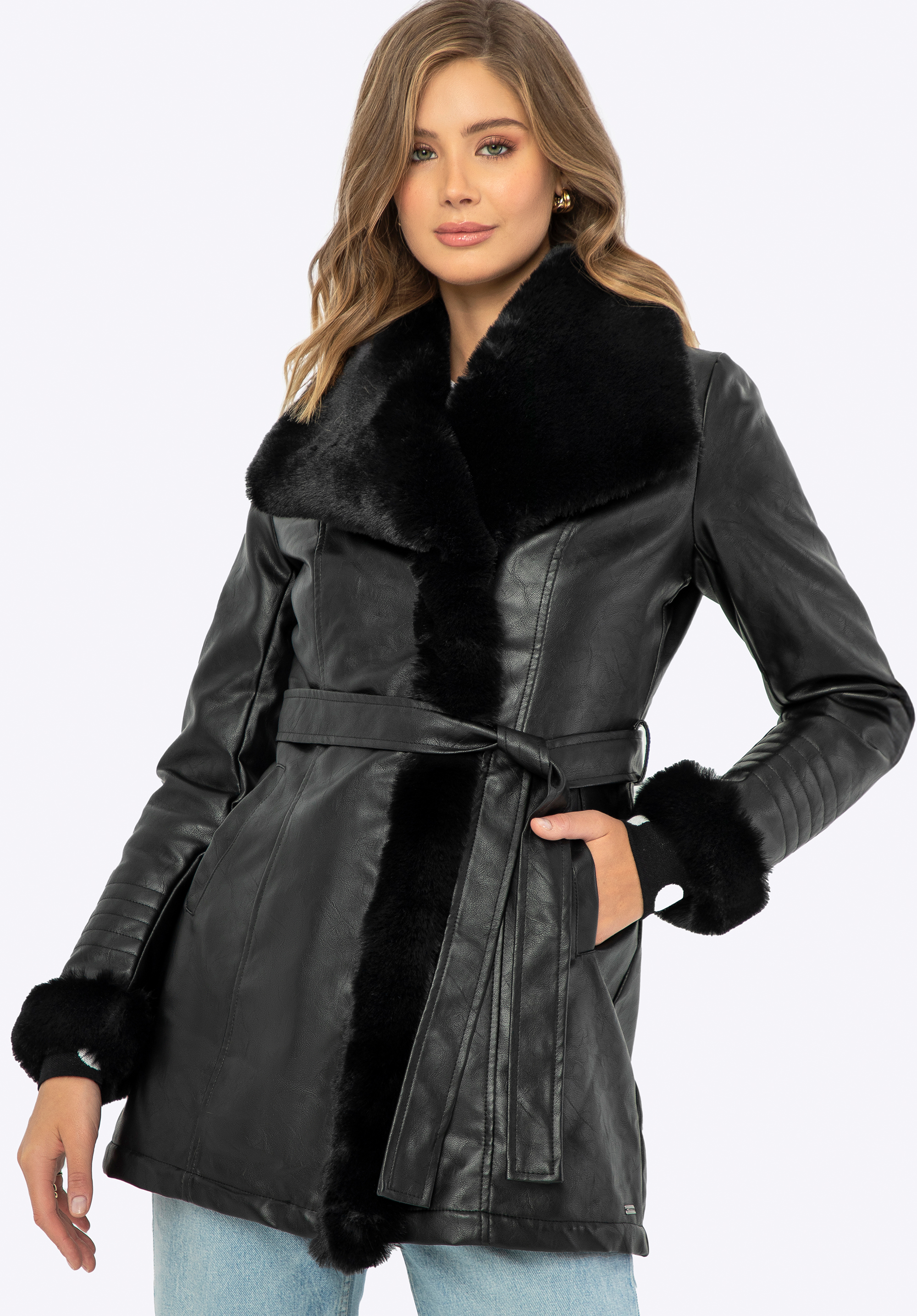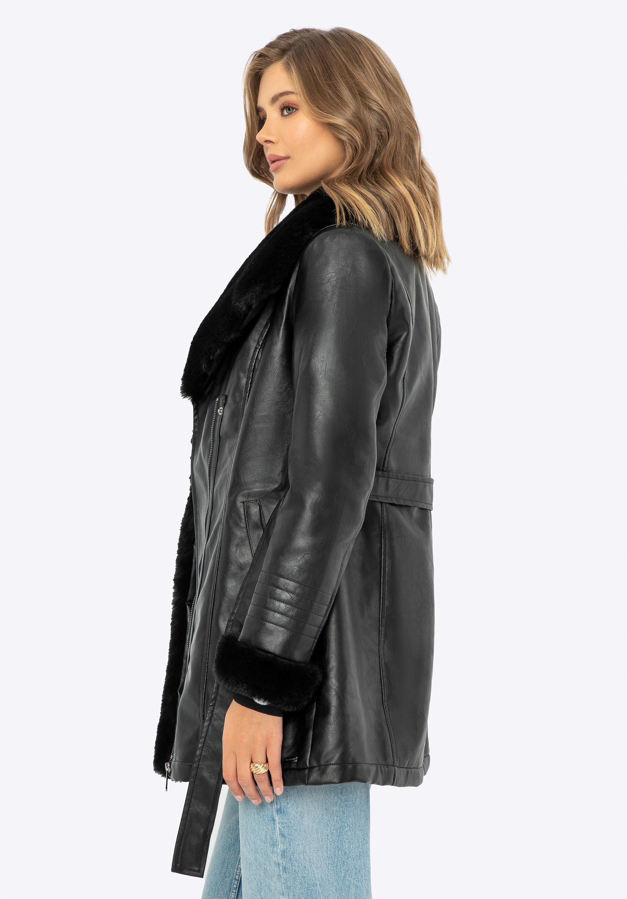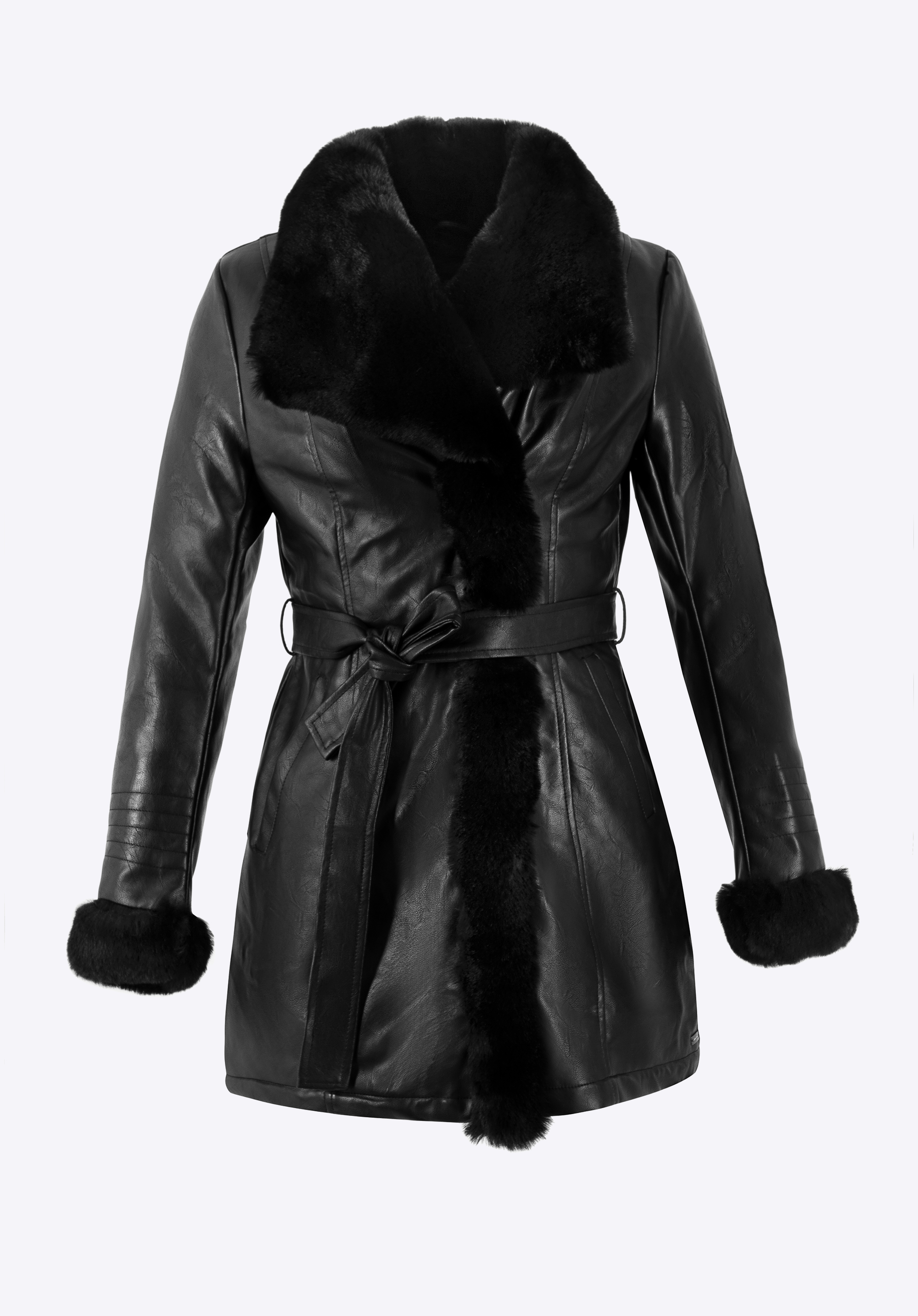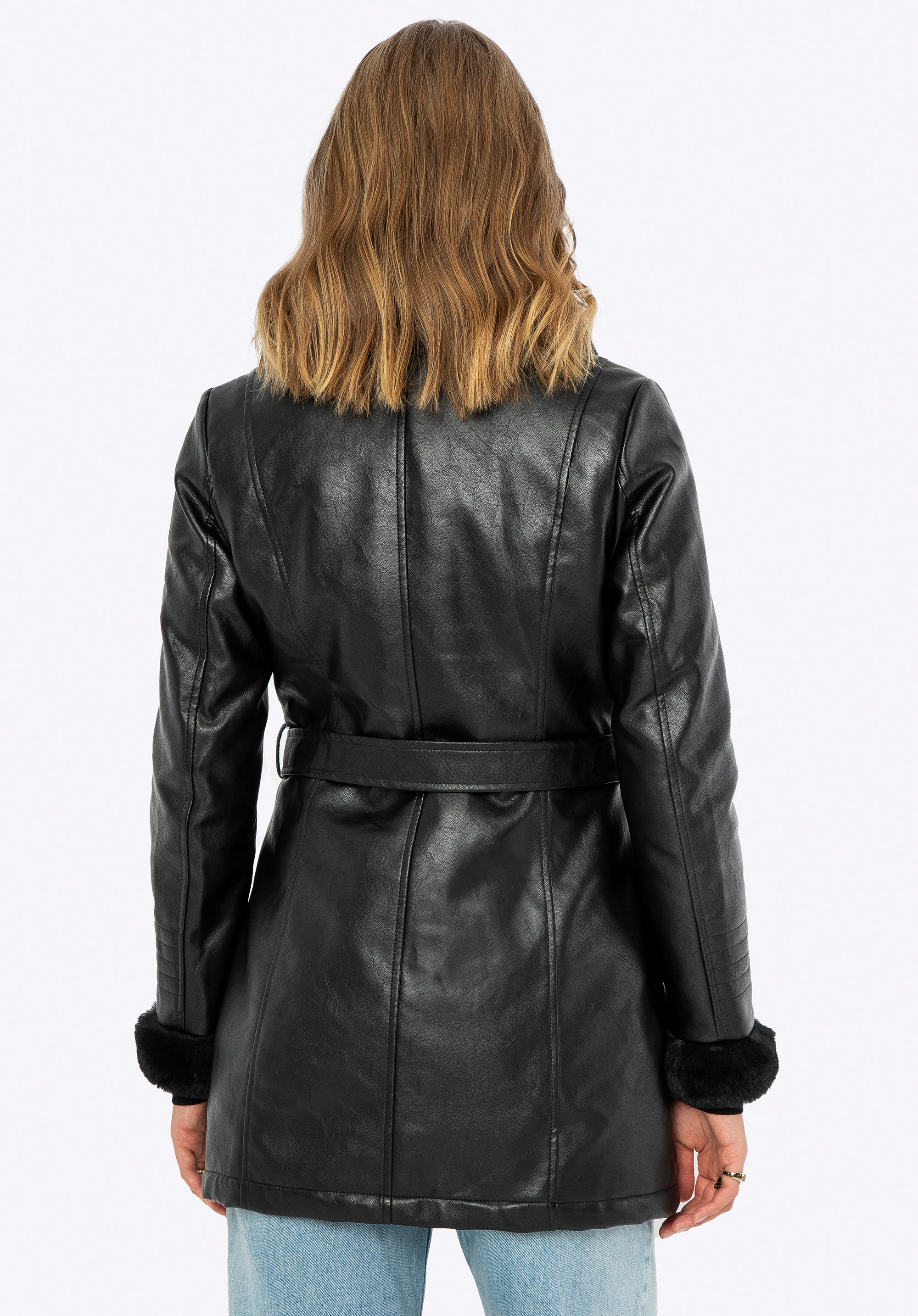 This women's coat in faux leather with a fur collar combines elegance and functionality. The fitted cut with a waist belt accentuates your silhouette, while subtle stitching on the sleeves enhances the coat's aesthetic. Practical slanted pockets offer space for small items or warming your hands, and additional internal snap fasteners on the zip ensure a better fit and protection against the cold.