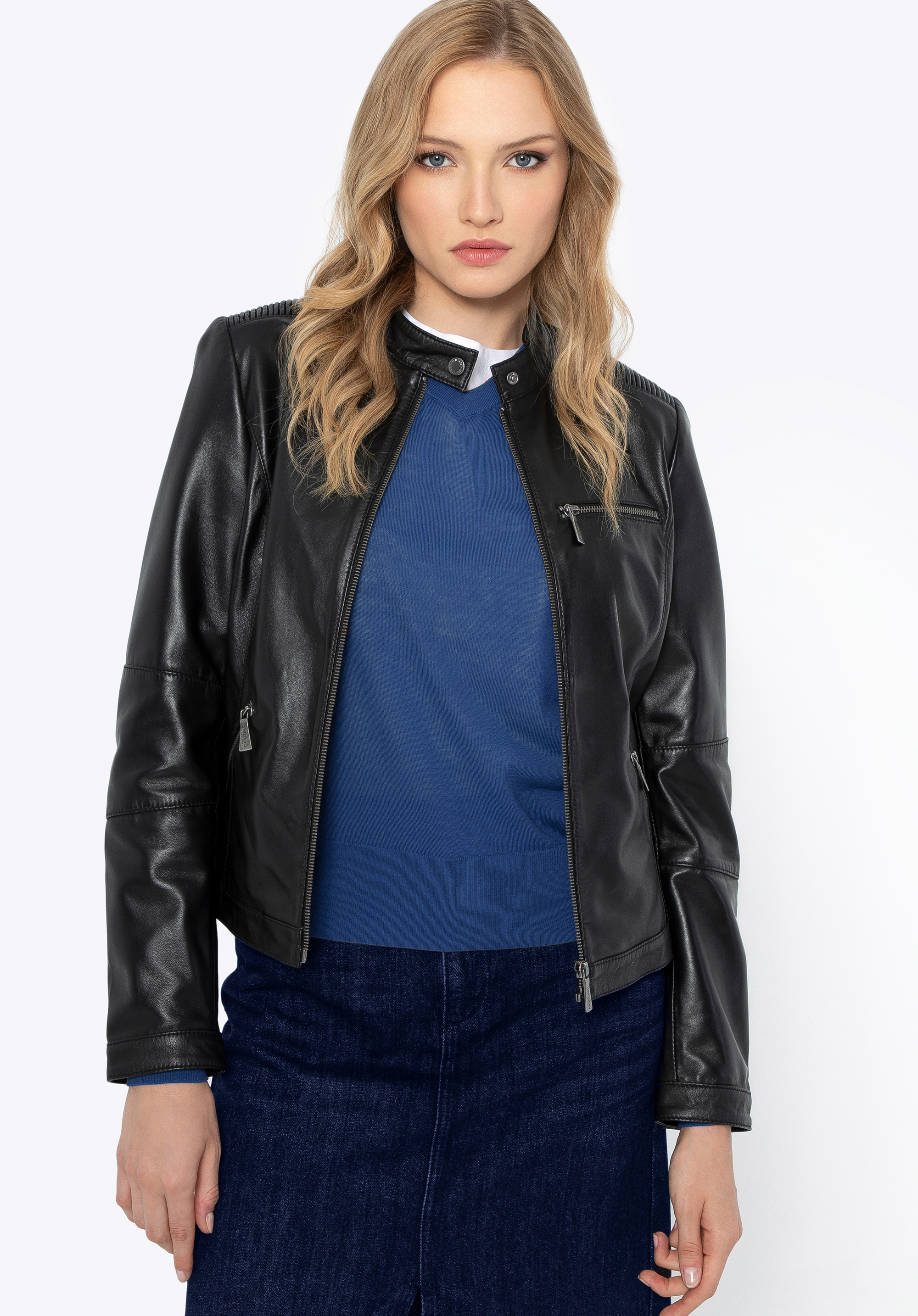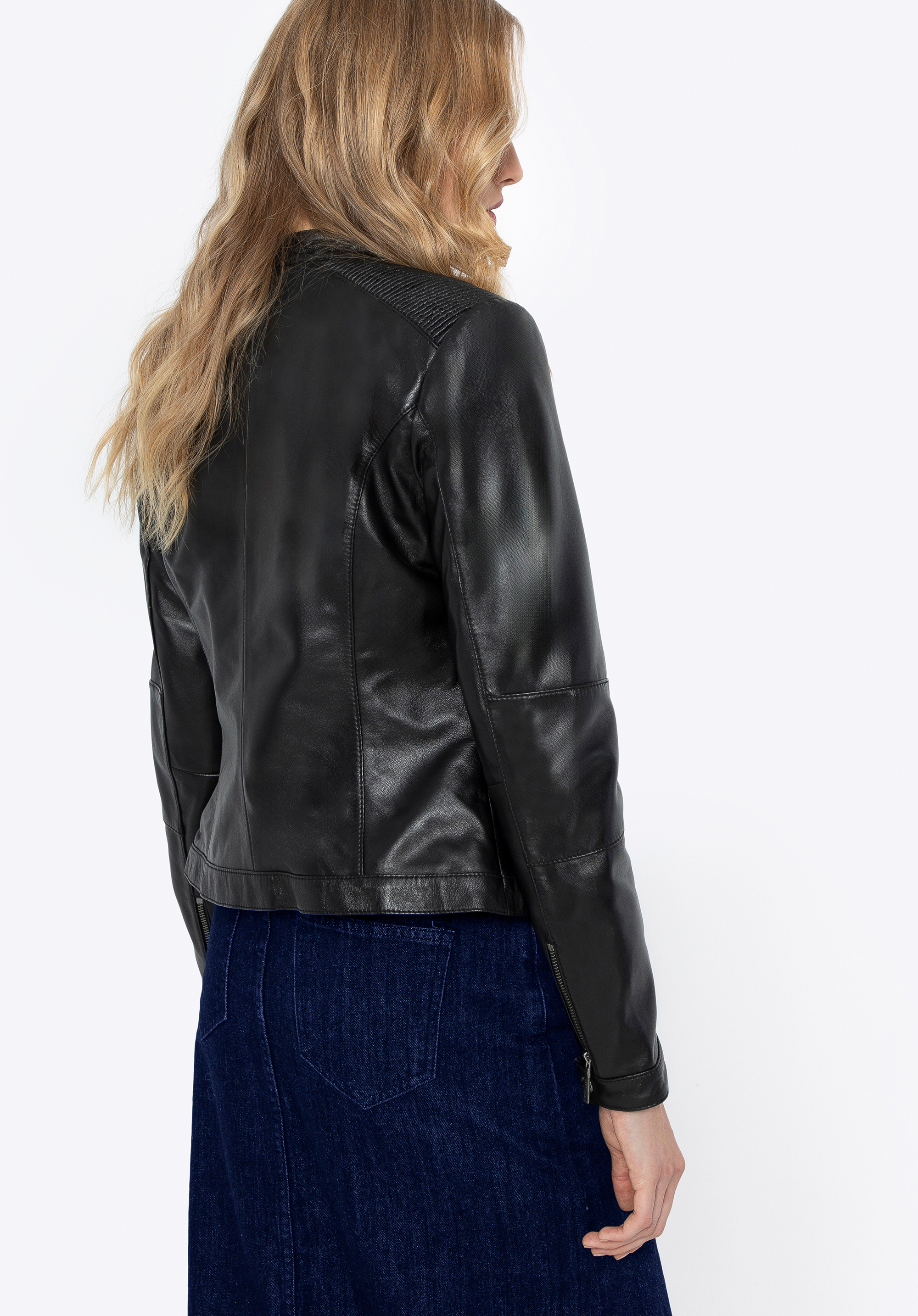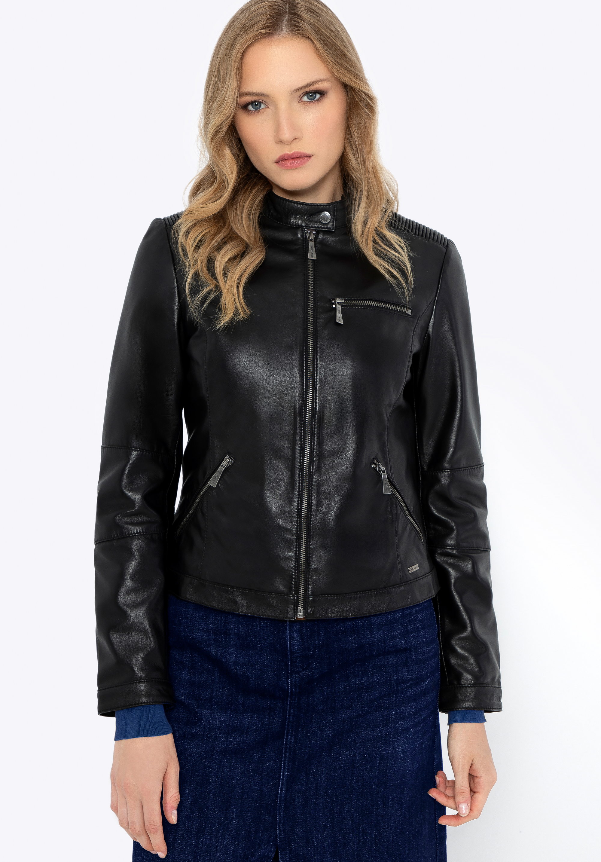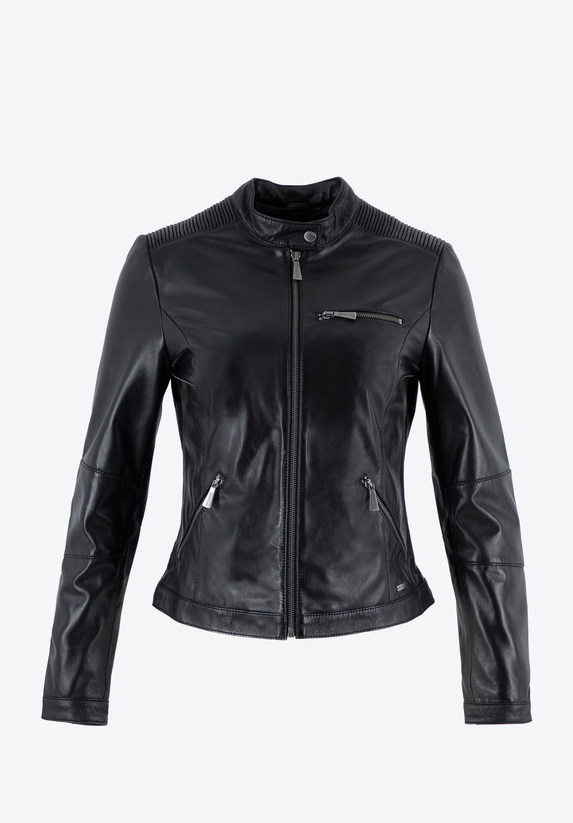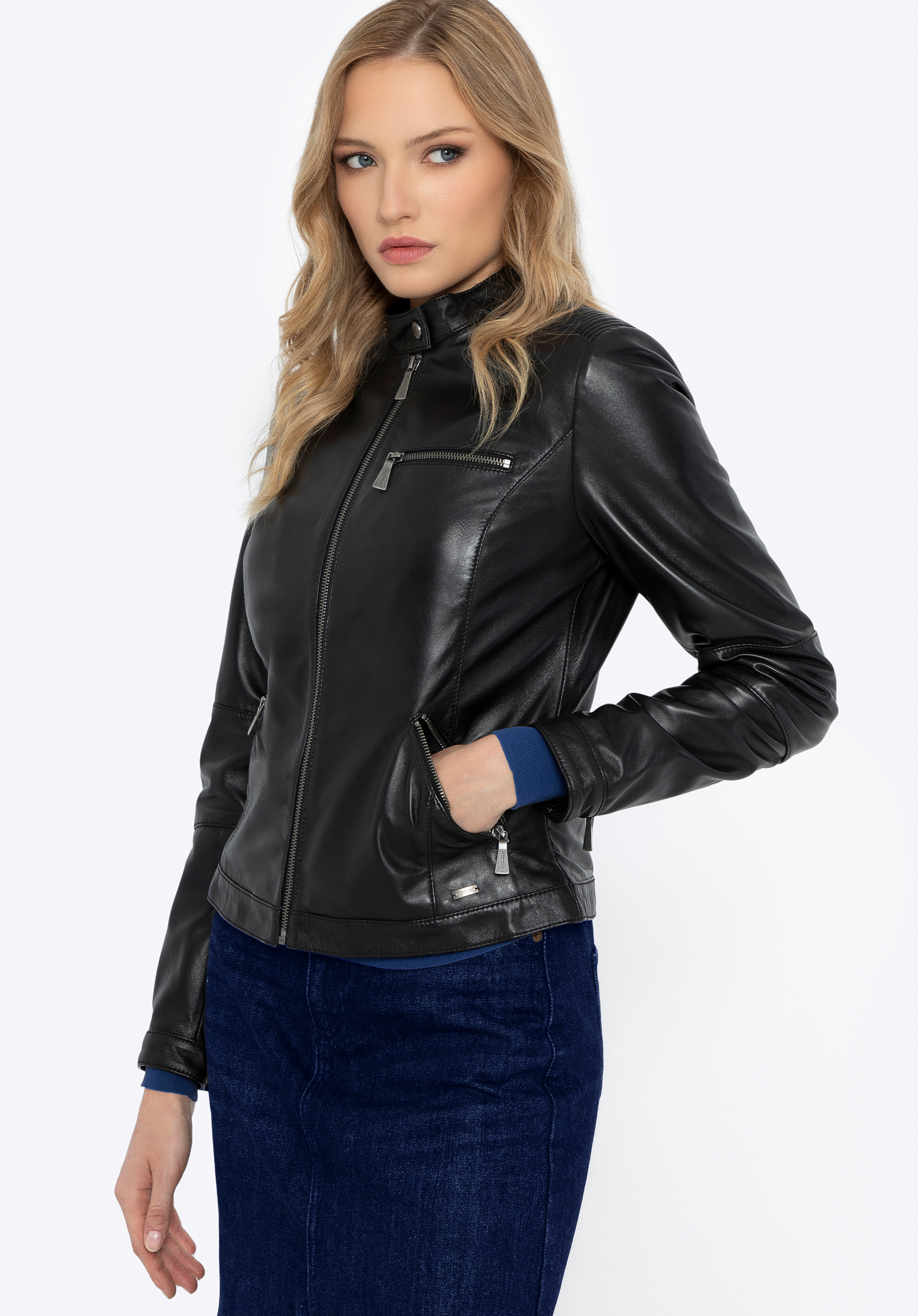 A leather jacket is an undisputed fashion staple. Its styling possibilities have expanded over the years, as it continues to reign on global fashion runways. It's worn by all women who value comfort, stylish appearance, functionality, and classic design. Made from high-quality sheepskin leather, it will ensure your comfort for many seasons. The jacket's tailored fit will certainly accentuate your figure. The jacket boasts stylish shoulder stitching, enhancing its contemporary and dynamic appearance. It features a front zip closure and two slanted front pockets. An additional deeper chest pocket combines both style and practicality. All pockets are secured with sleek silver zips. For added versatility, the sleeves have zip detailing with snap-button closures, allowing you to roll them up for a more casual look.
