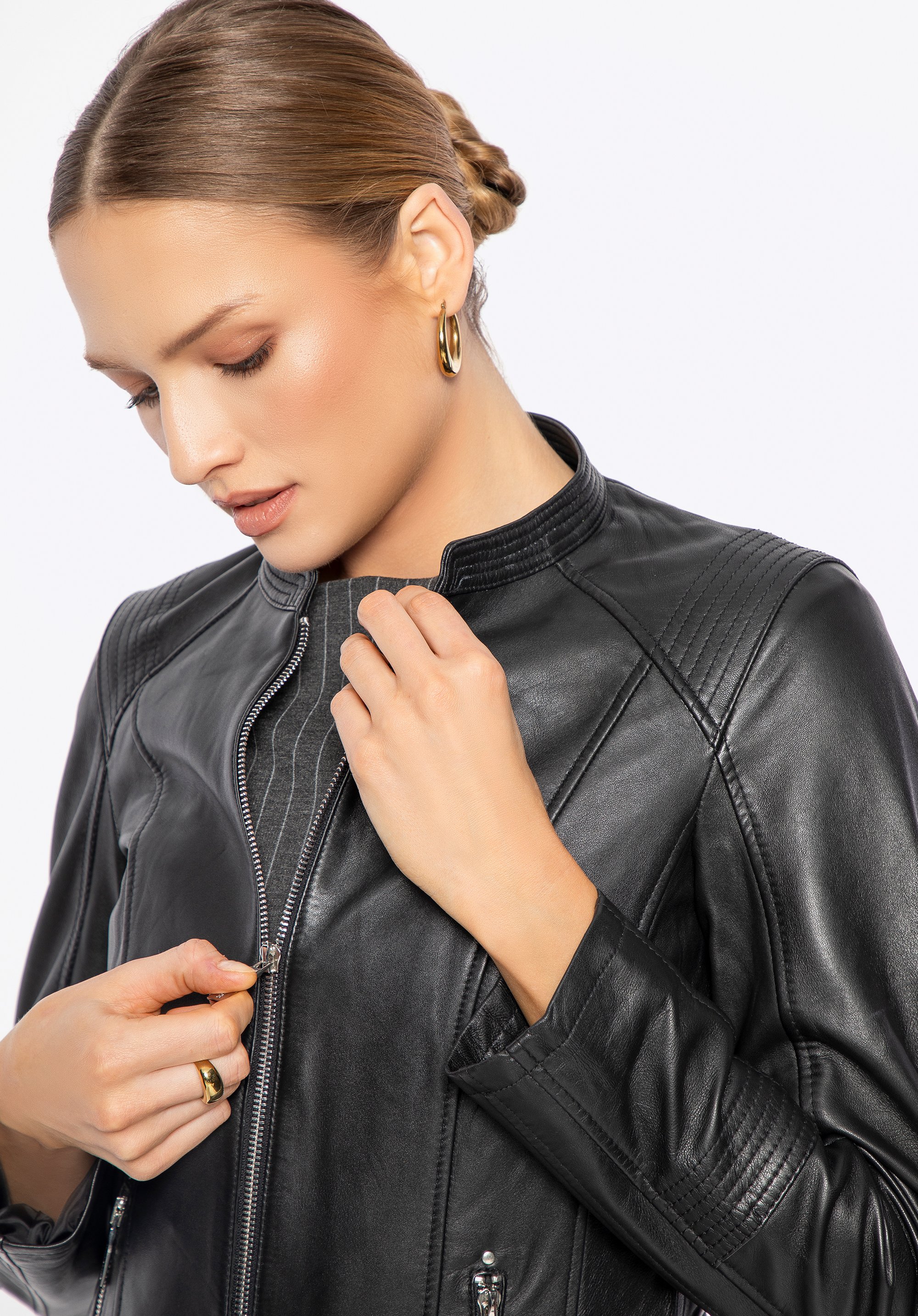 This jacket will become a staple in your wardrobe! Made from natural leather, it combines elegance with a hint of edgy character. Subtle details, such as the metal logo on the side and decorative studs on the pockets, give it a unique flair. Zip fastening, with a delicate stand-up collar and a tailored cut, perfectly accentuates the silhouette.