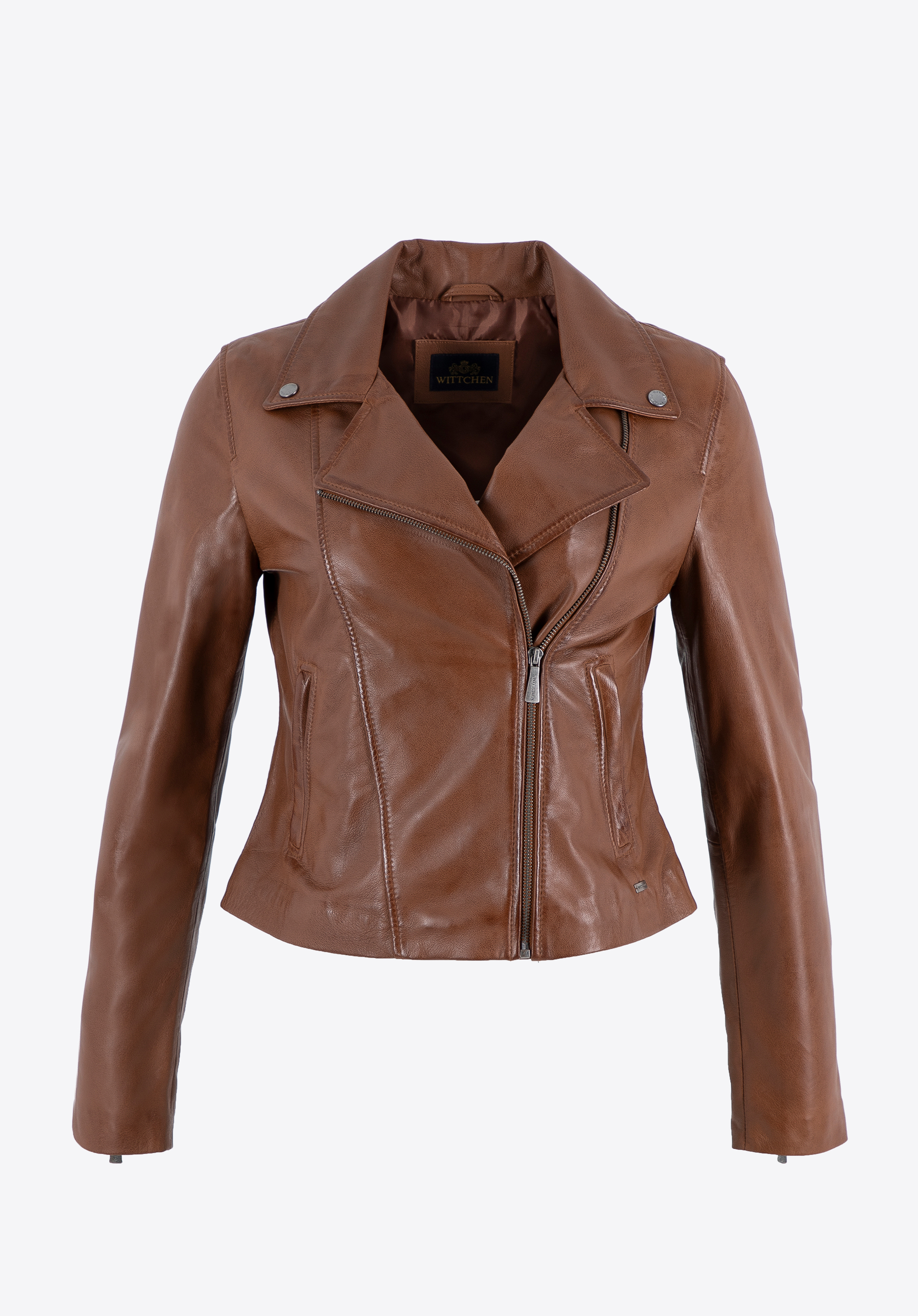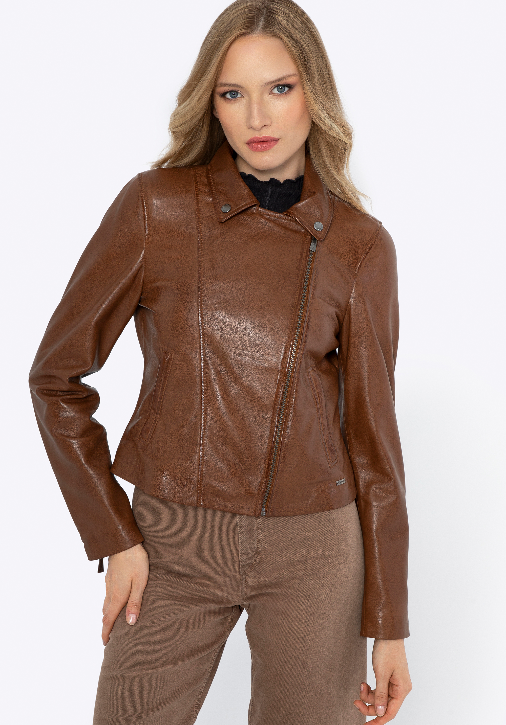 Step into the world of classic elegance with this women's jacket made from the finest quality sheepskin leather. This symbol of timeless style is not just a garment; it's a manifestation of individuality and self-confidence. The leather jacket is the definition of elegance in every inch. Two diagonal pockets add practicality and charm. The soft yet durable leather makes wearing it a pure pleasure, regardless of the circumstances. Functionality is a key feature of this biker jacket - the zipper ensures easy and comfortable fastening, while the two practical zippered pockets offer space for storing essential items. The stylish collar gives the jacket an elegant look, and the silver snaps on the collar add character. This is not just a jacket; it's an expression of your individual style and self-confidence.