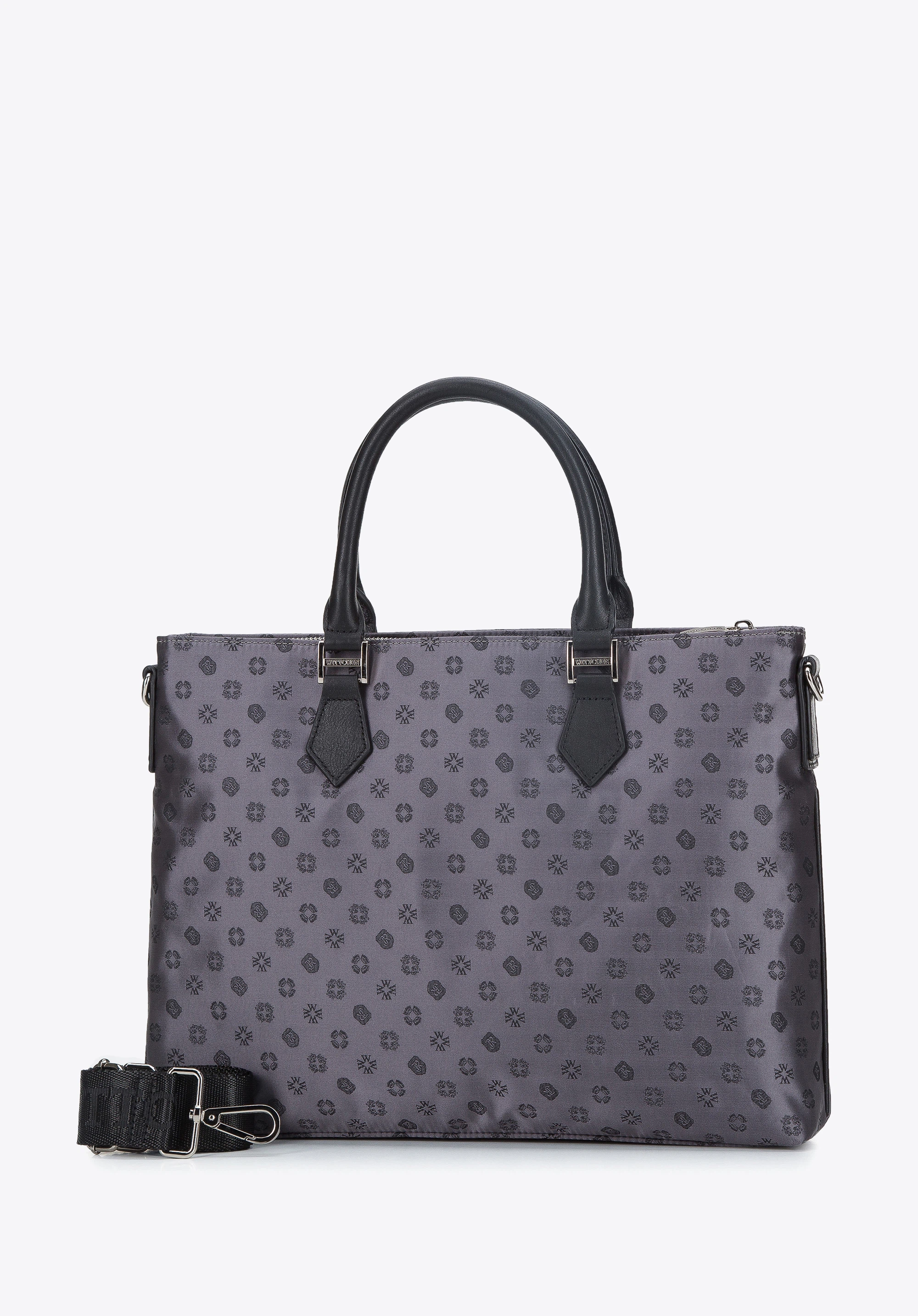 This lightweight laptop bag is the perfect accessory for a stylish woman. The shimmering fabric with natural leather trims adds a touch of elegance to your everyday look. Inside, there’s space for A4-sized documents and your daily essentials, and a softly padded compartment to fit a device up to 23 × 33 cm. Sleek and practical, it’s the kind of bag you’ll love to carry both to work and after hours. Women’s 12” laptop bag made from jacquard fabric with leather accents is a unique piece that will elevate your wardrobe.