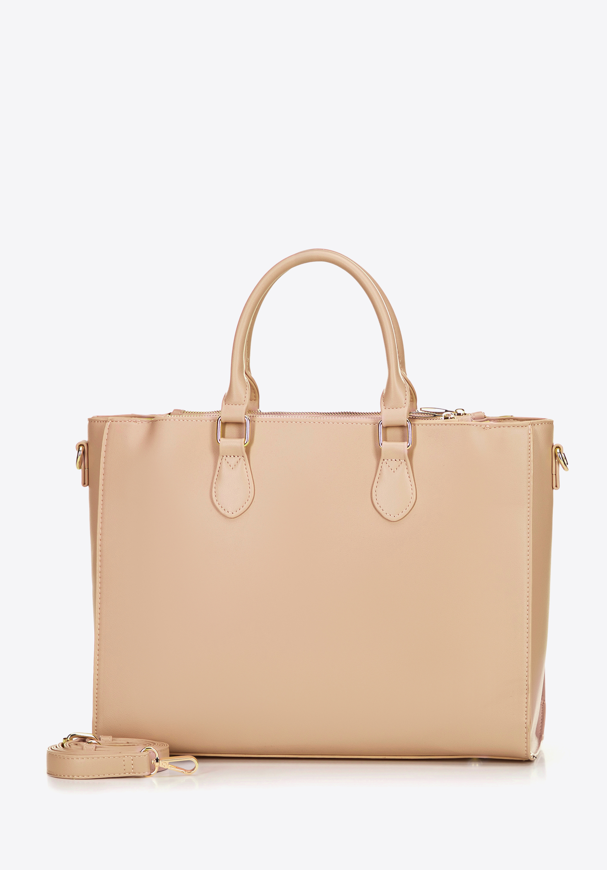Elegant laptop handbag made of faux leather that combines functionality with modern design. It features two handles and a detachable, adjustable strap, allowing you to customise the carrying method to suit your needs. The padded compartment fits a laptop with dimensions of 21 × 32 cm (14.5”). Four studs on the bottom protect the handbag from scratches, keeping it looking stylish for a long time. Ideal for you if you’re looking for a bag that combines style with everyday usability!