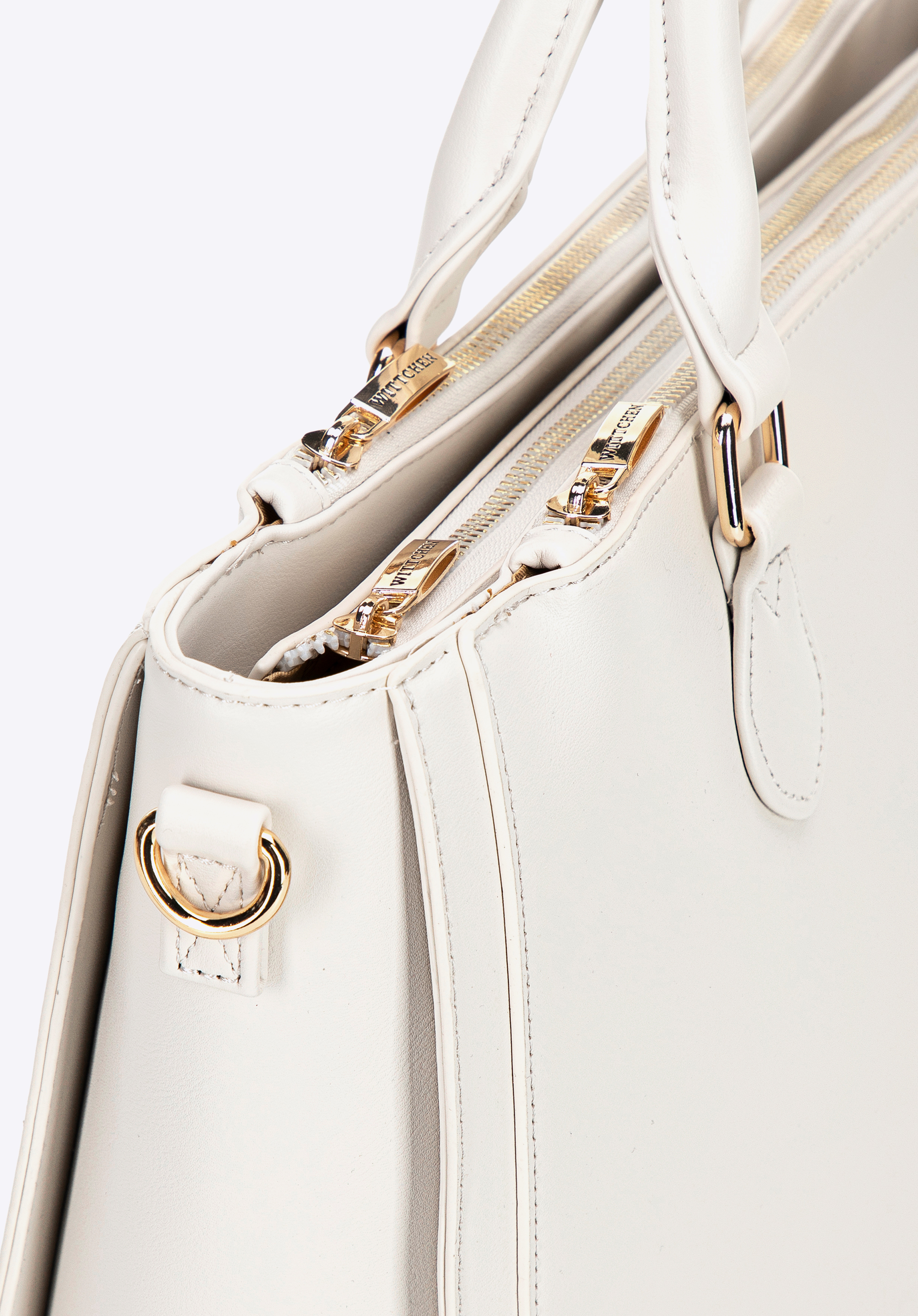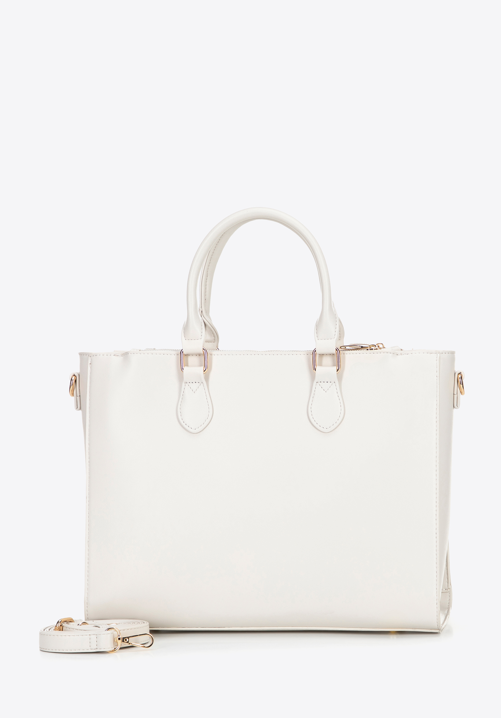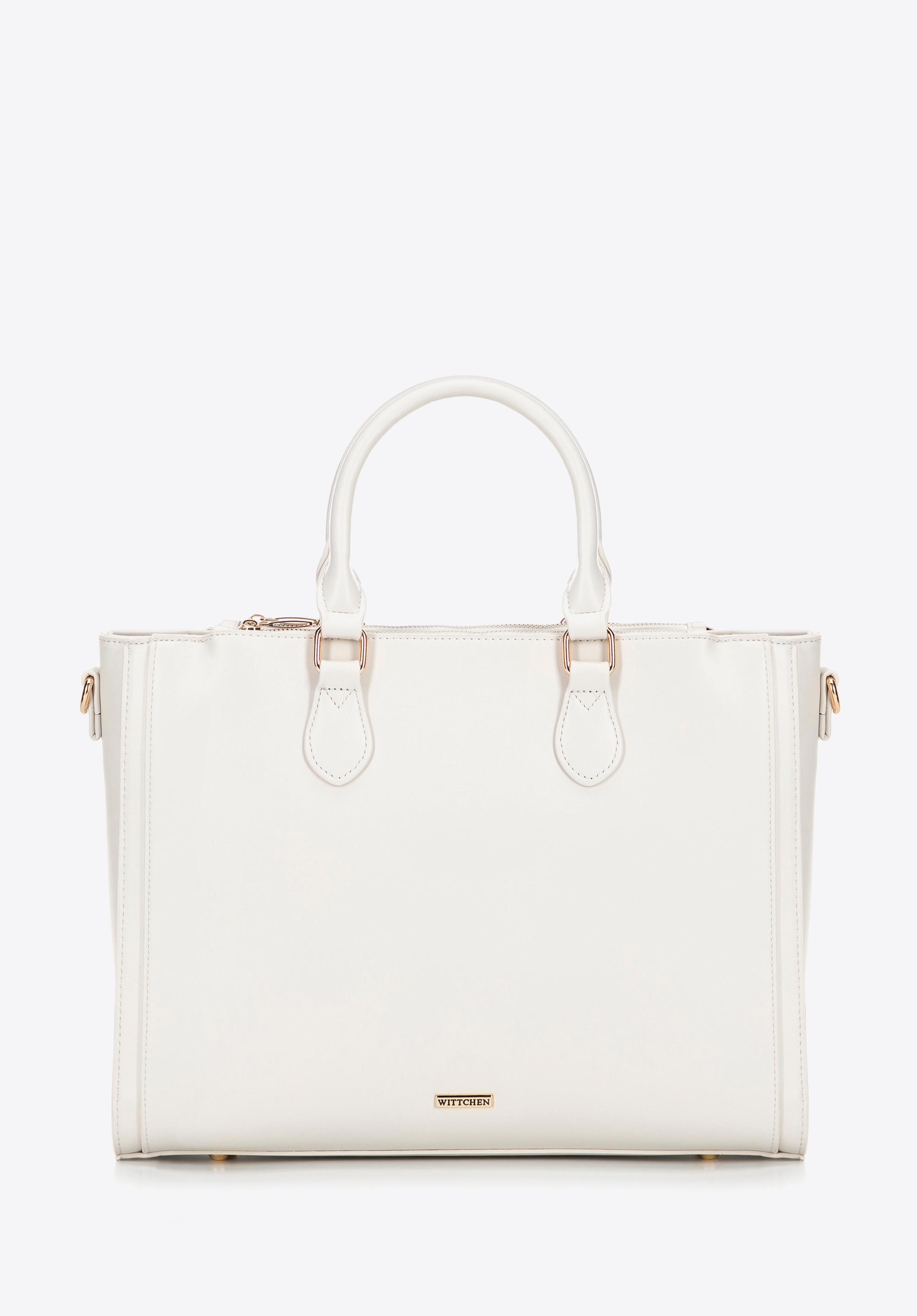 Elegant laptop handbag made of faux leather that combines functionality with modern design. It features two handles and a detachable, adjustable strap, allowing you to customise the carrying method to suit your needs. The padded compartment fits a laptop with dimensions of 21 × 32 cm (14.5”). Four studs on the bottom protect the handbag from scratches, keeping it looking stylish for a long time. Ideal for you if you’re looking for a bag that combines style with everyday usability!