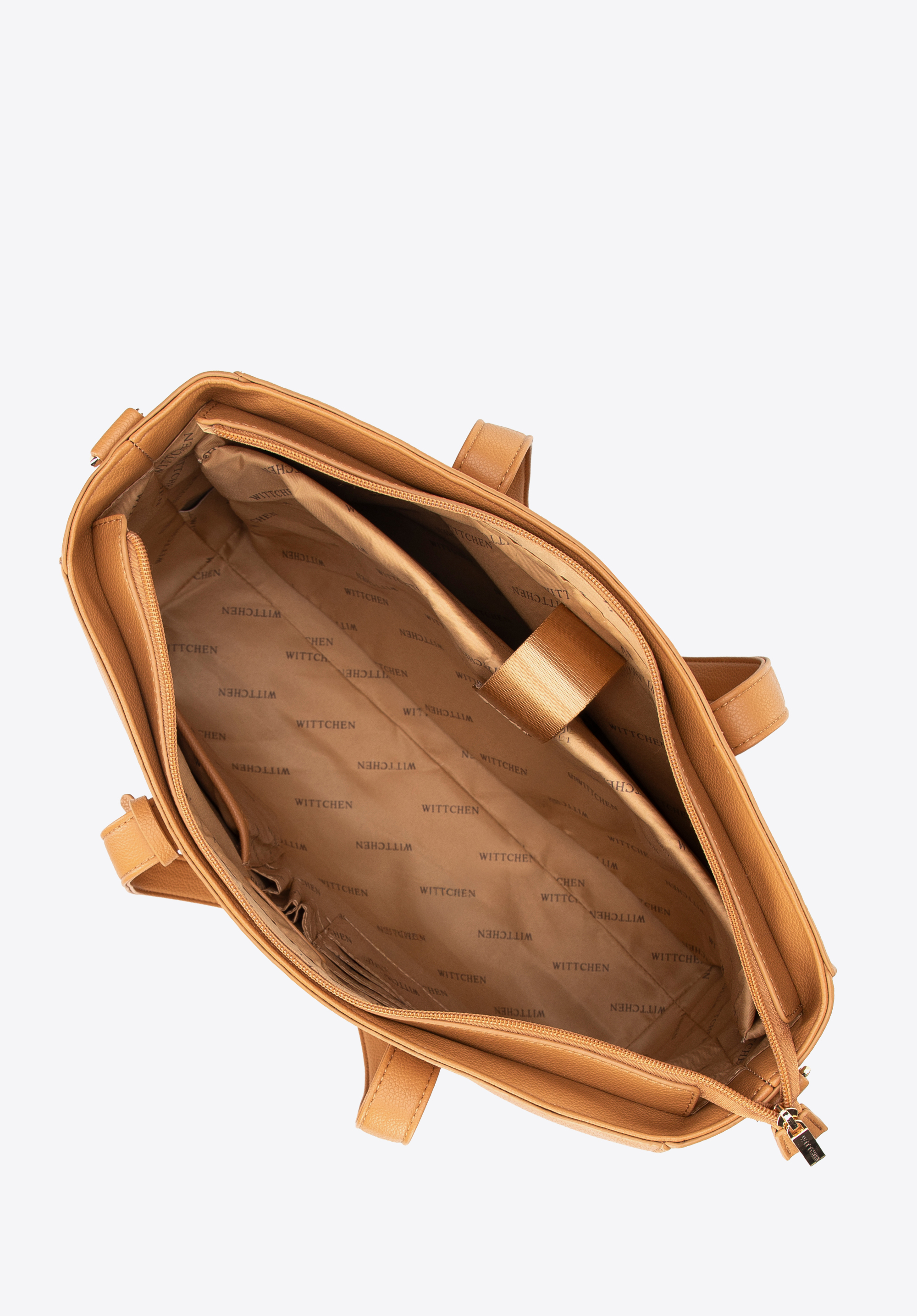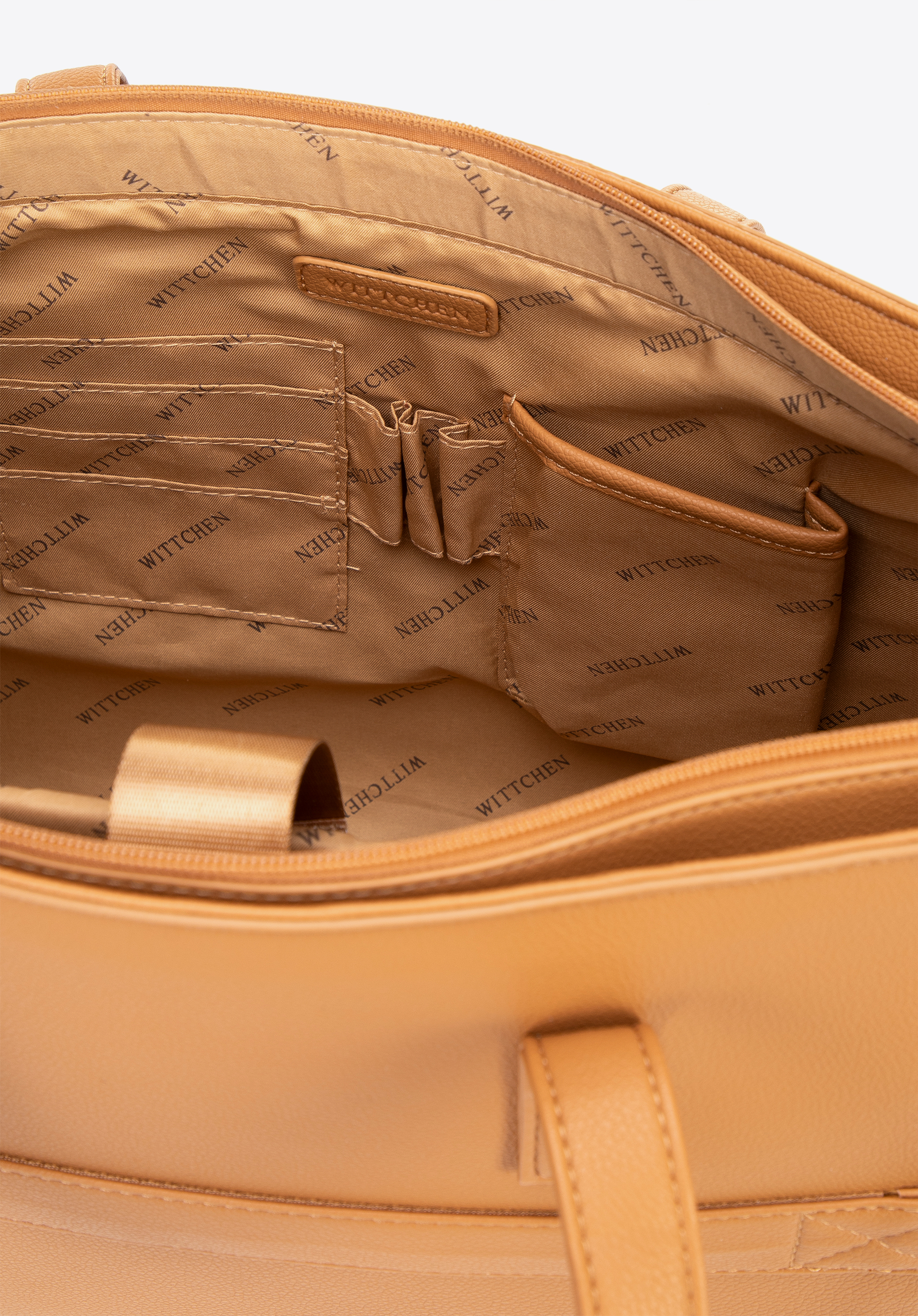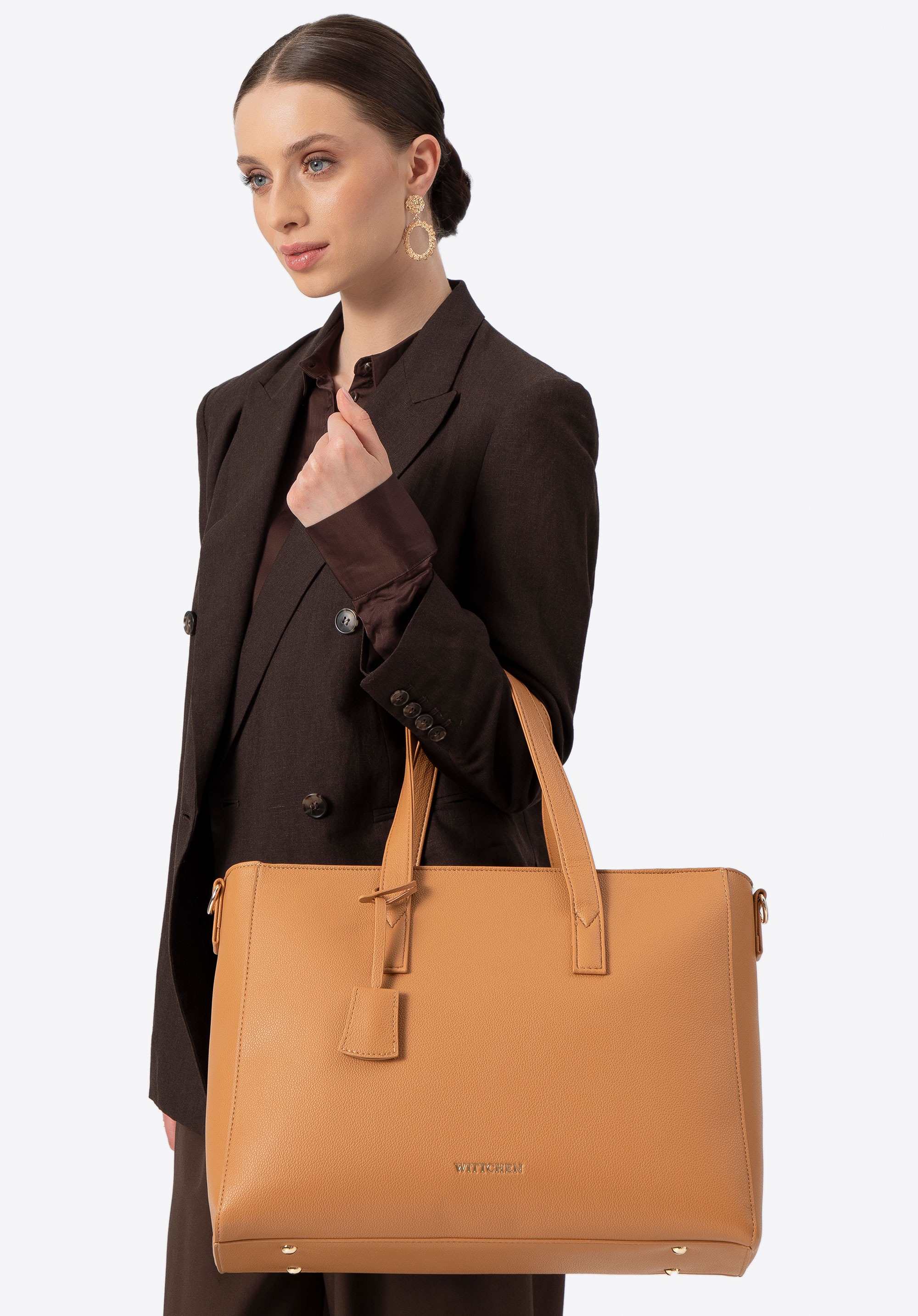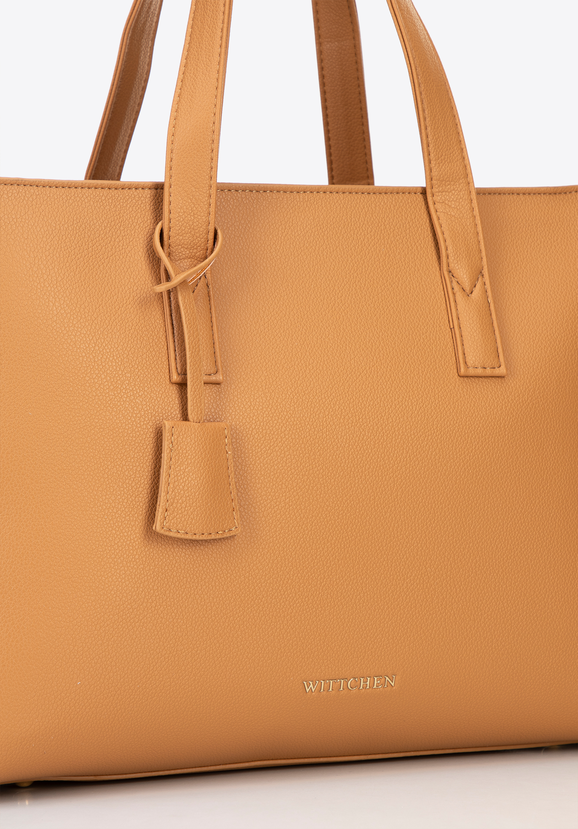 Our 16" laptop bag perfectly blends classic design with feminine elegance. Made of faux leather, it boasts a refined silhouette and subtle accents such as a detachable tassel on the handle. Fastened with a zip, it features a practical interior with a padded compartment for a 16" laptop (23 × 38 cm) and dedicated sections for small items and documents – everything in its place, always within reach.