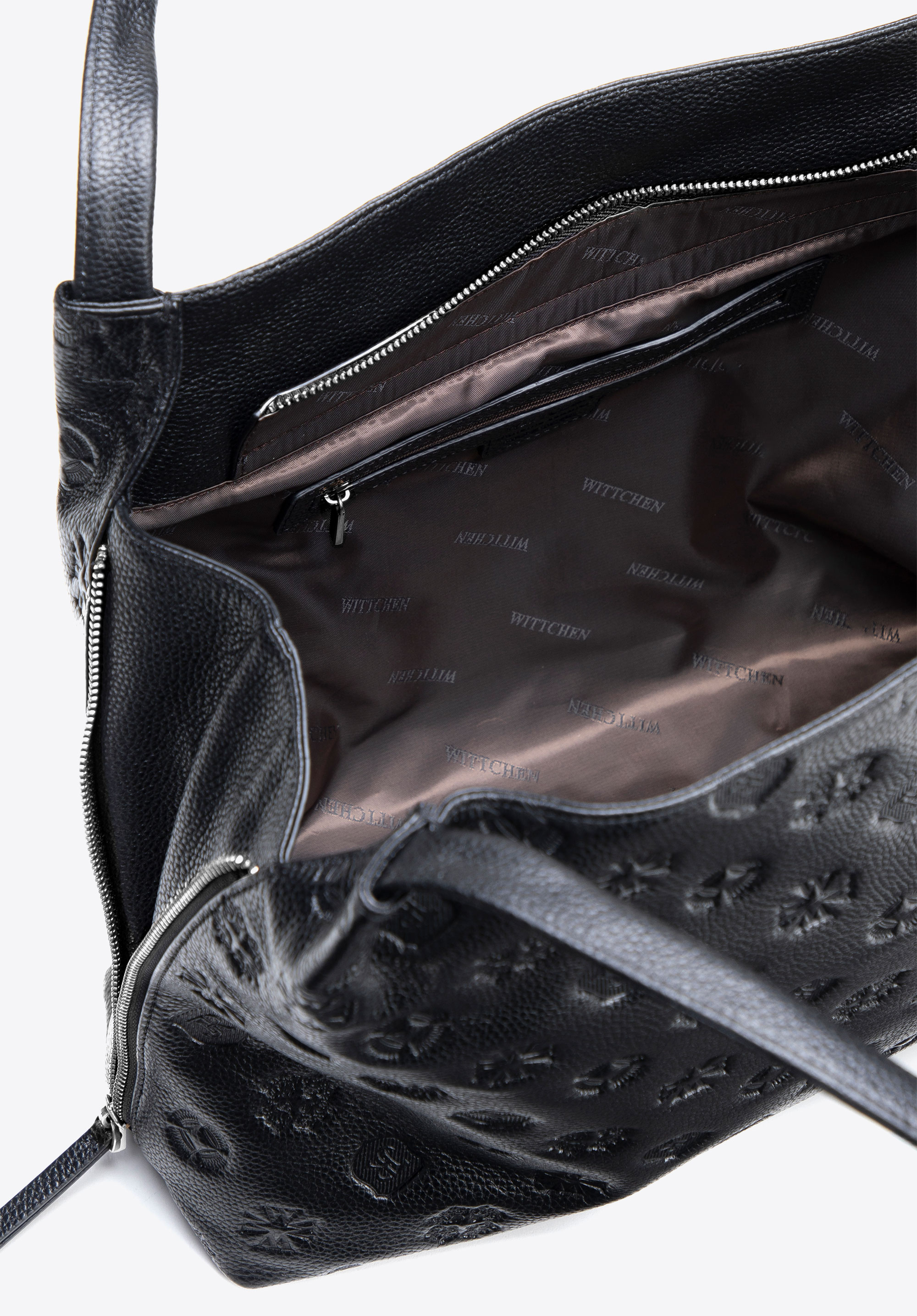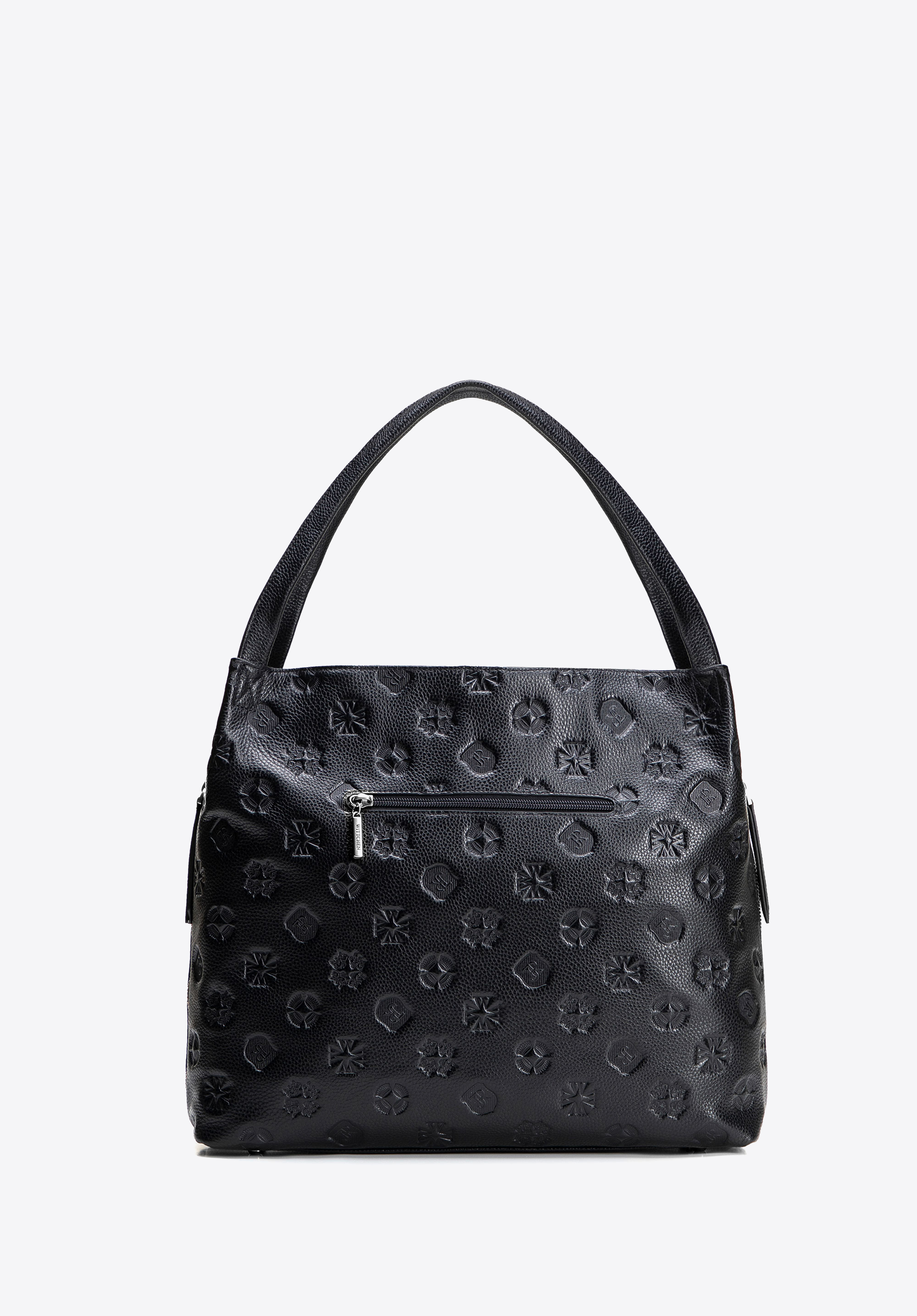 An elegant hobo bag made from natural leather and adorned with an embossed monogram – the perfect combination of style and functionality. It features a spacious zipped compartment, three internal pockets, including one with a zip, and side zips that allow for extra capacity. Thanks to its size, it fits A4 documents, making it an excellent choice for everyday use – whether for work, business meetings, or shopping.