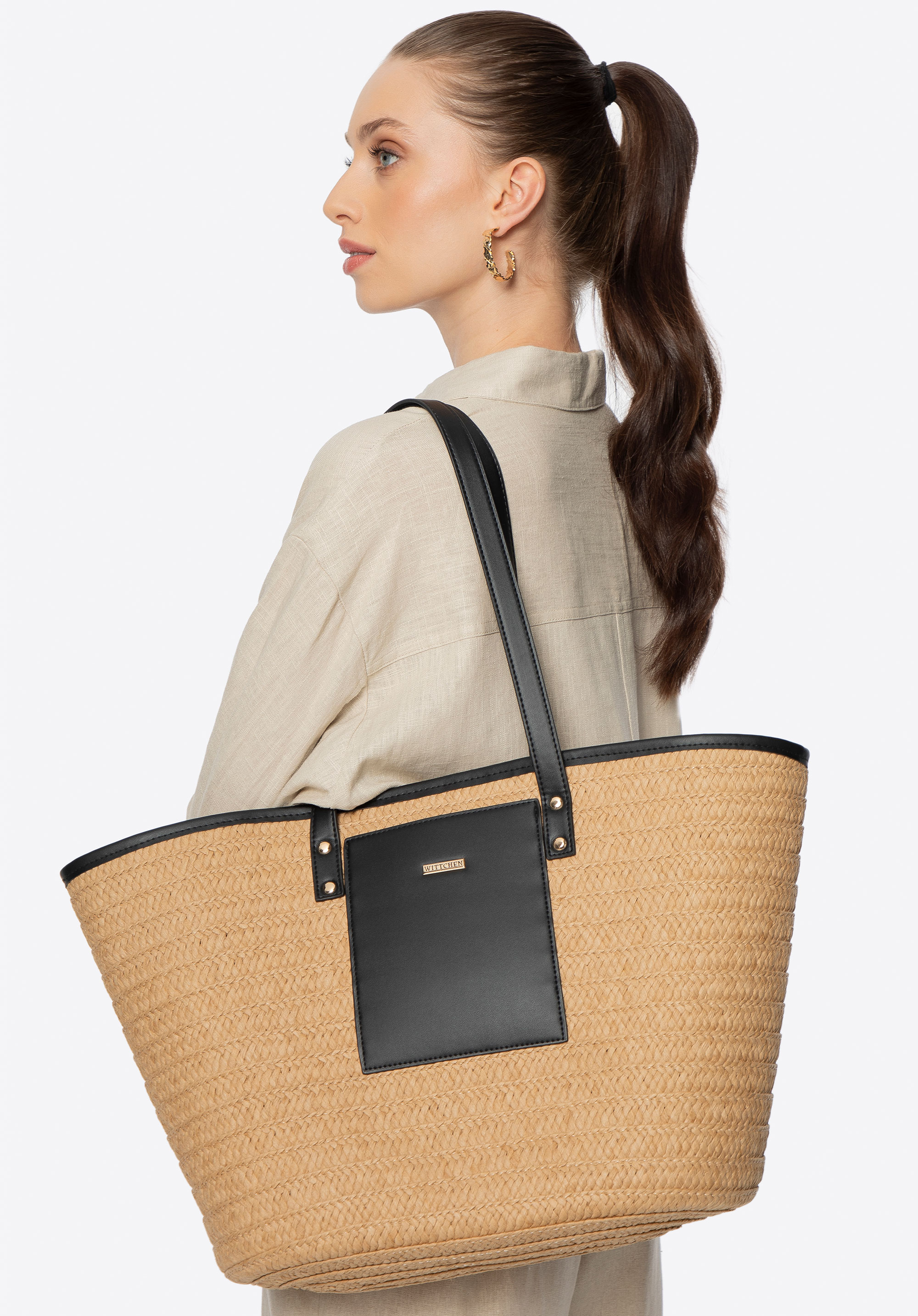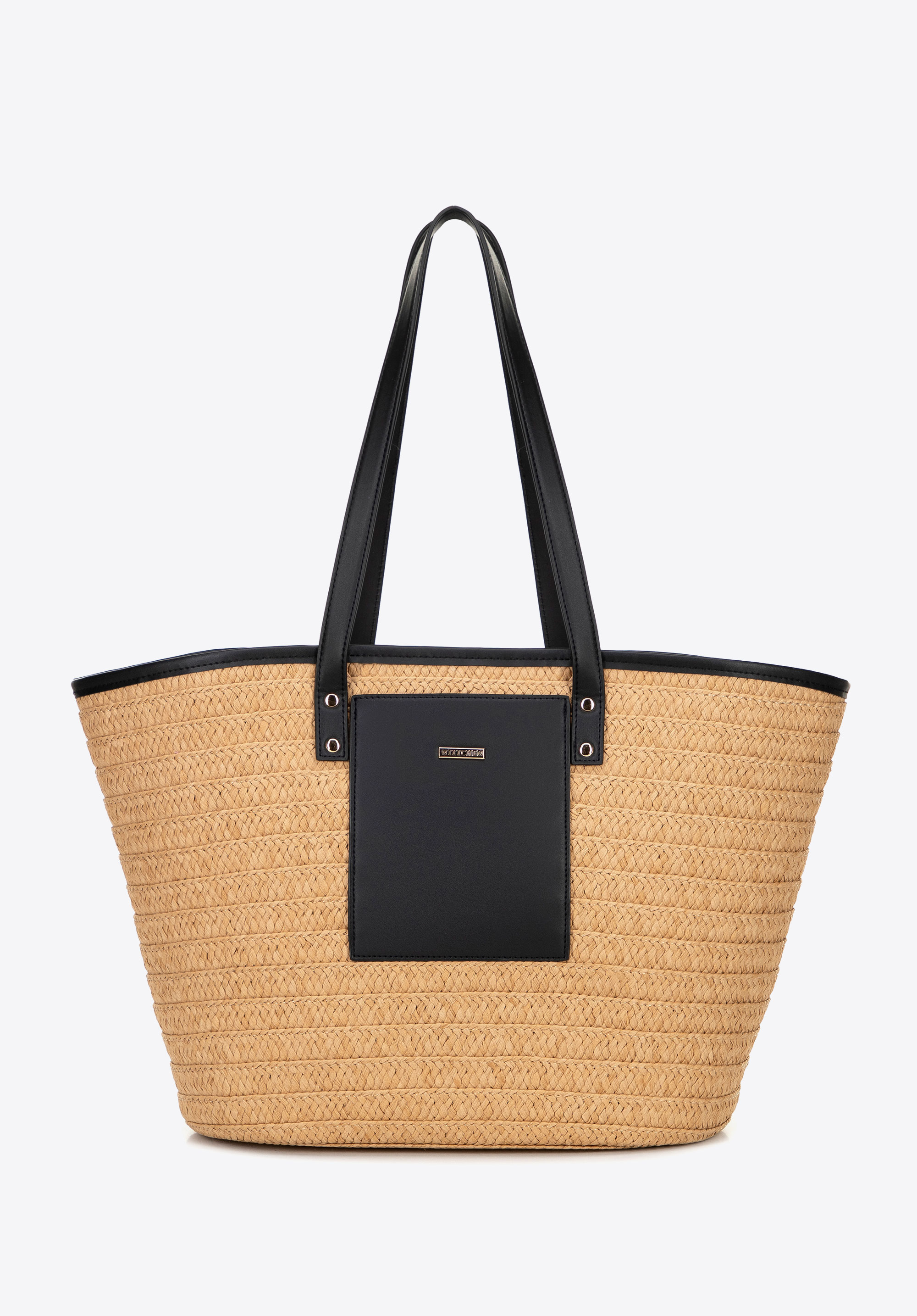 This women's handbag in a classic basket shape is a must-have accessory for summer, combining natural charm with everyday functionality. The body is made of lightweight paper straw, giving it a casual, breezy look that's perfect for warm days. The woven texture and reinforced bottom ensure durability and structure, even with frequent use. A faux leather front pocket with the brand’s logo adds a stylish finishing touch.
