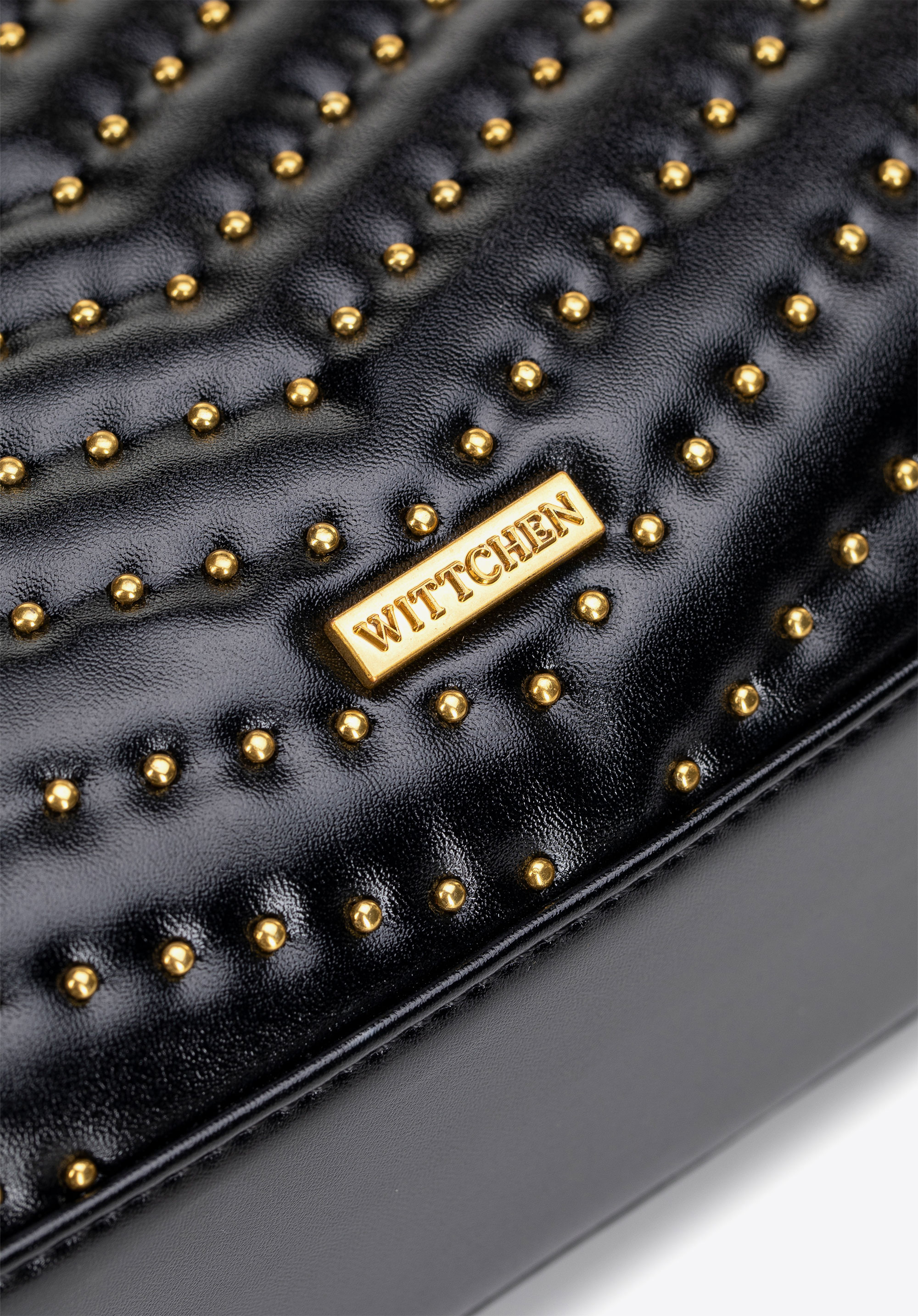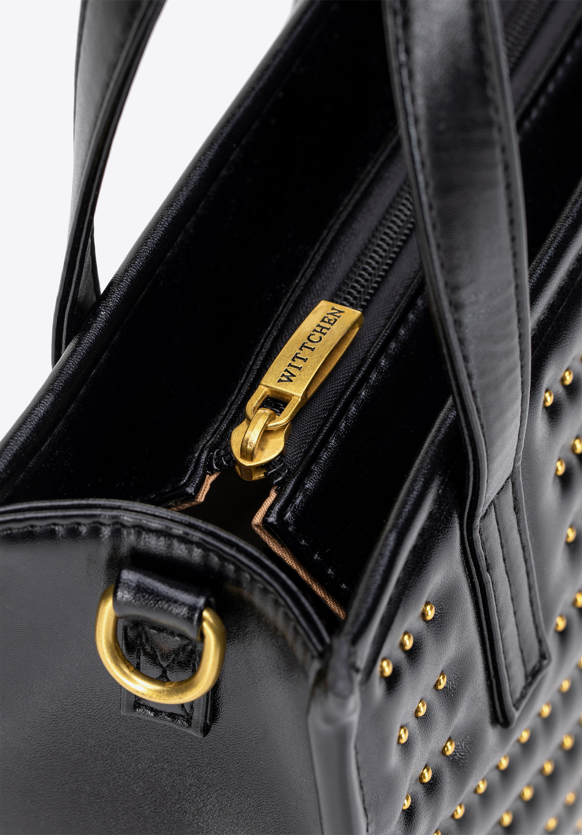 Discover this tote bag, which perfectly combines feminine elegance with practical design. Crafted from faux leather, it showcases refined craftsmanship and chic detailing. Decorative studs on the front add character and a contemporary touch, while the subtle brand logo emphasizes its premium appearance. Two handles allow convenient carrying by hand, and a adjustable, detachable strap lets you wear it your way, suiting both occasion and personal style.