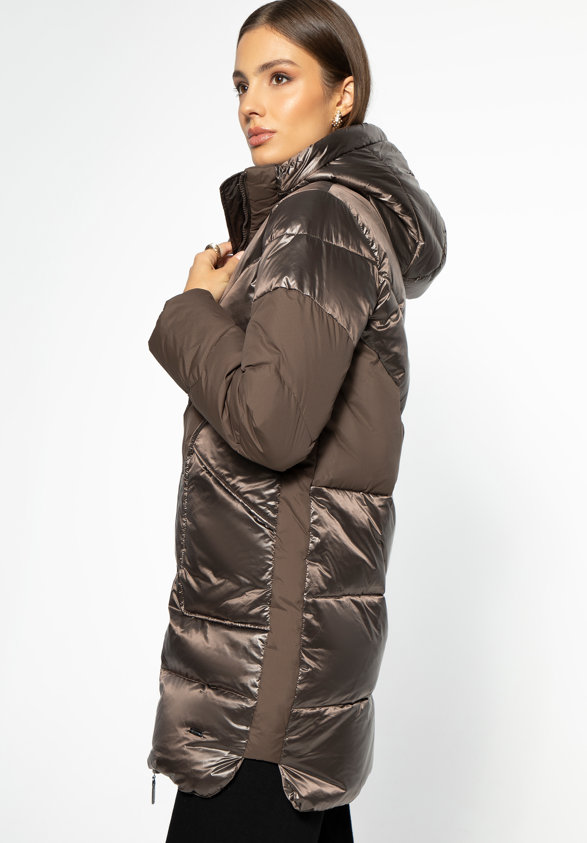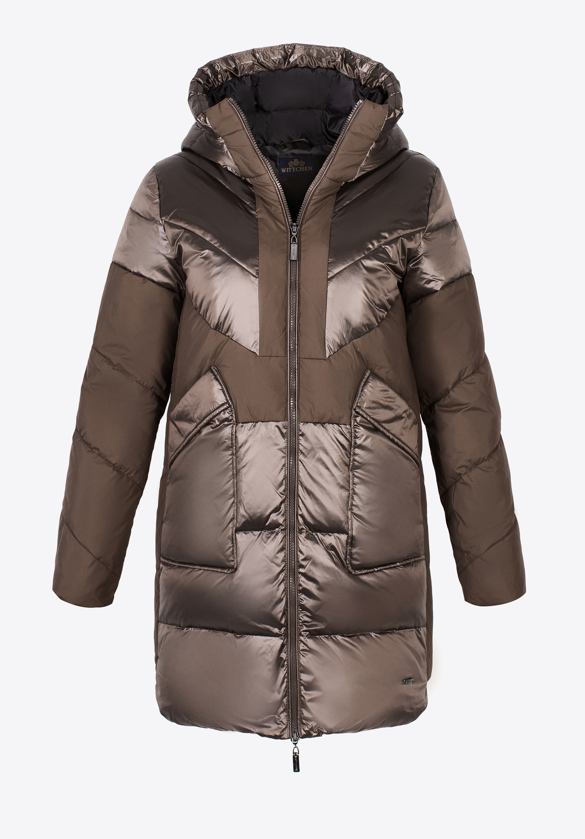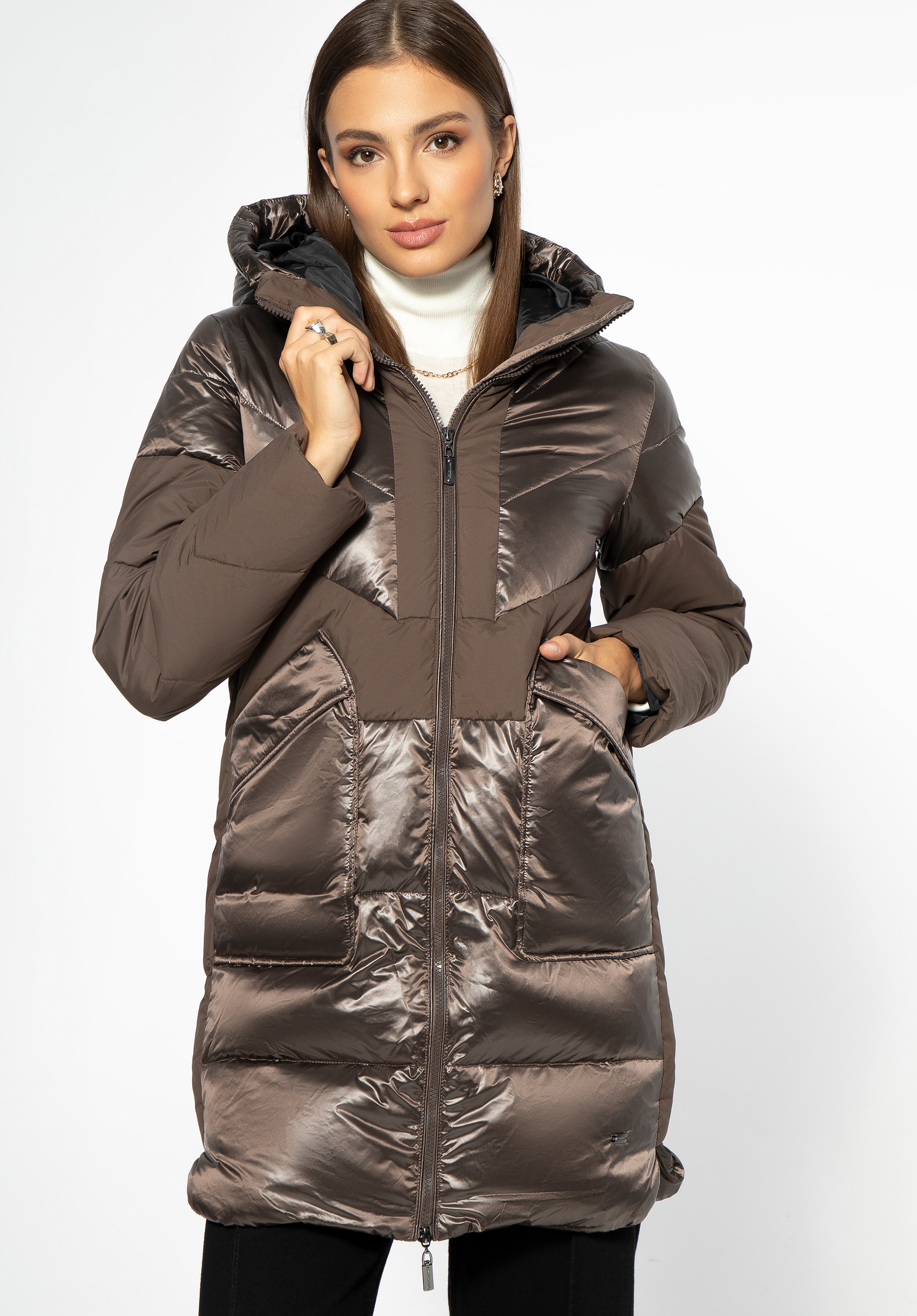 When cold season comes, this stylish down coat provides excellent head-to-knee warmth. Made from the highest quality lightweight and shiny nylon and polyester fabric with filling made of 70% duck down and 30% feathers, this mid-thigh length coat is wonderfully easy to wear. The fixed hood is handsomely-sized, adding a touch of wintry style. The practical length of the women's winter coat and its simple cut look exceptionally elegant and make the female silhouette look more delicate. This winter's must-have piece of clothing will protect you from the elements in style without being too bulky.