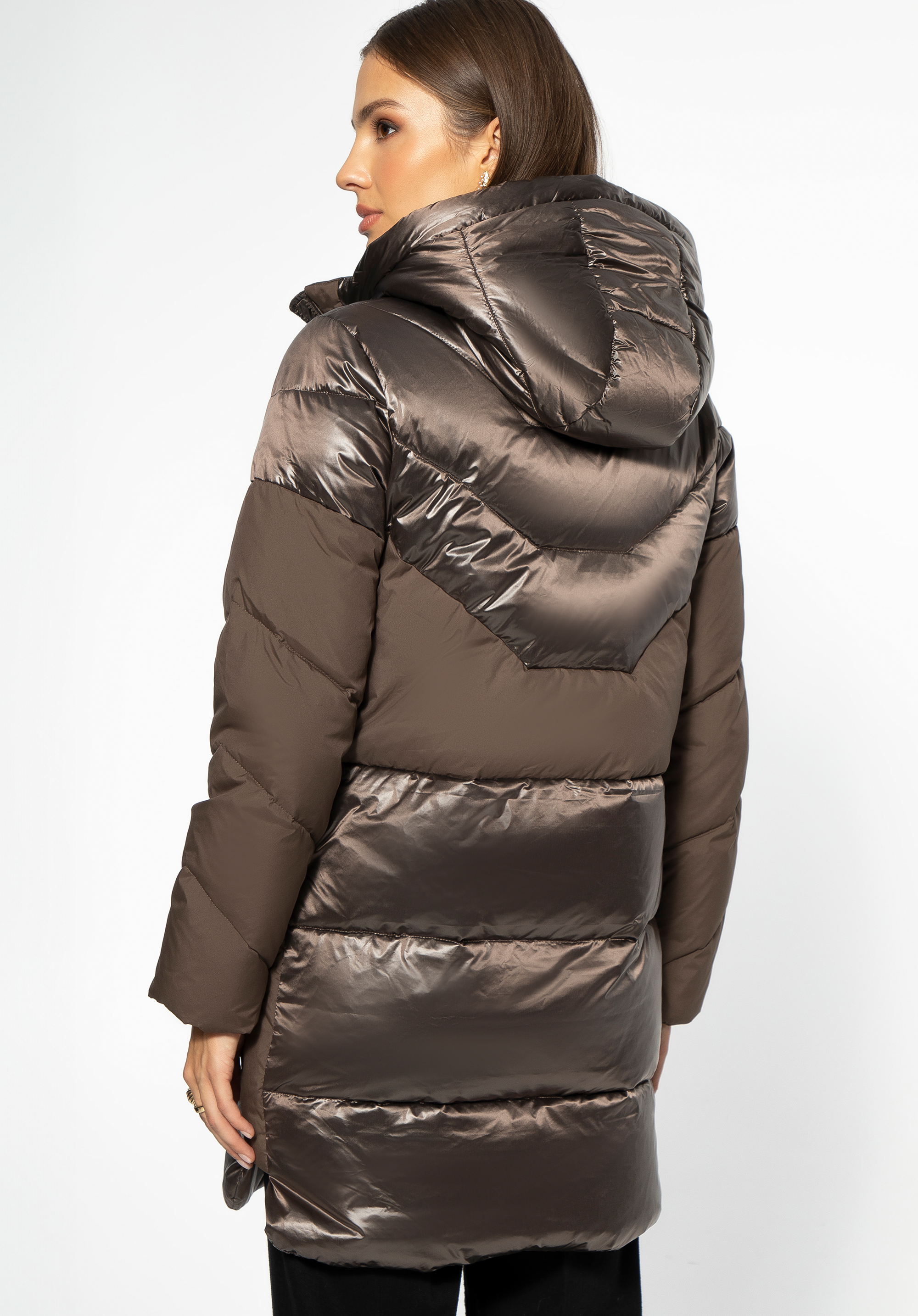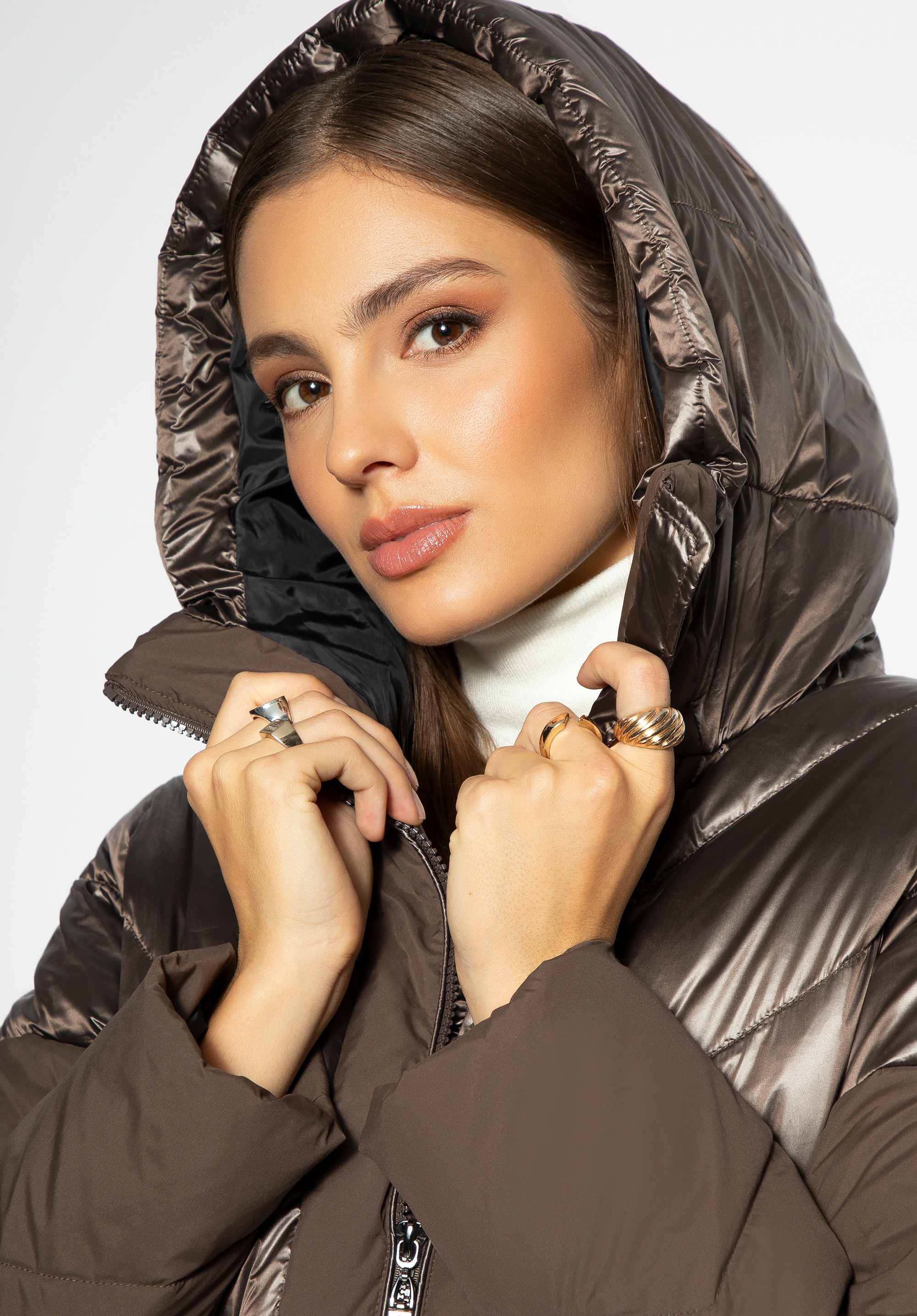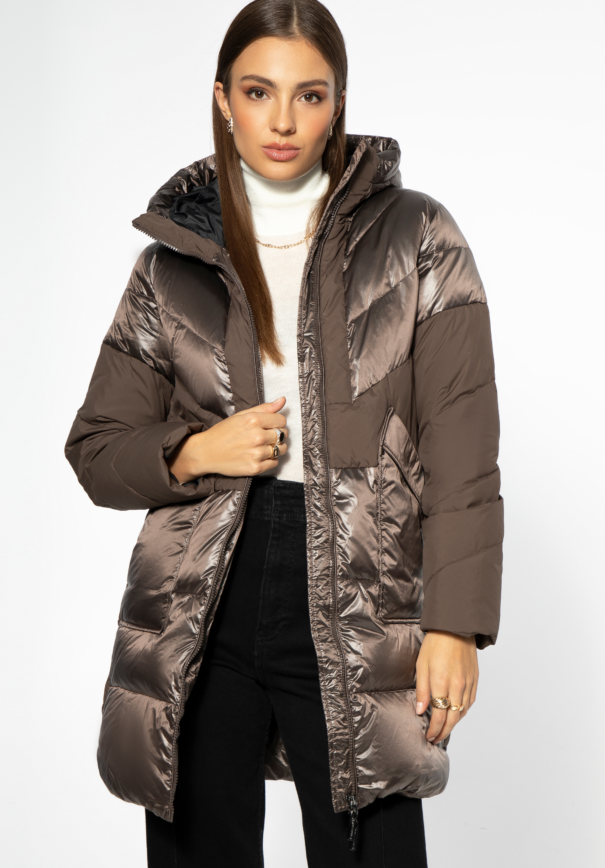 When cold season comes, this stylish down coat provides excellent head-to-knee warmth. Made from the highest quality lightweight and shiny nylon and polyester fabric with filling made of 70% duck down and 30% feathers, this mid-thigh length coat is wonderfully easy to wear. The fixed hood is handsomely-sized, adding a touch of wintry style. The practical length of the women's winter coat and its simple cut look exceptionally elegant and make the female silhouette look more delicate. This winter's must-have piece of clothing will protect you from the elements in style without being too bulky.