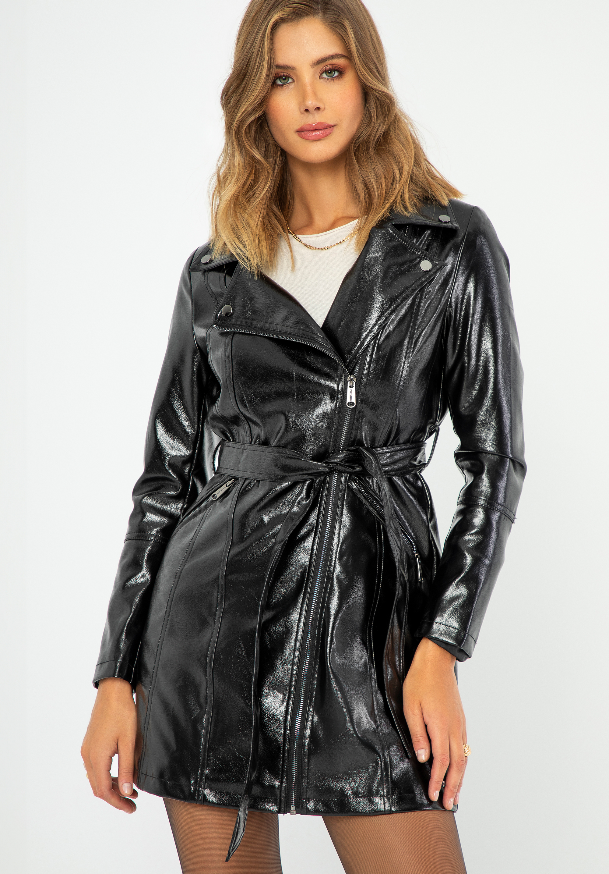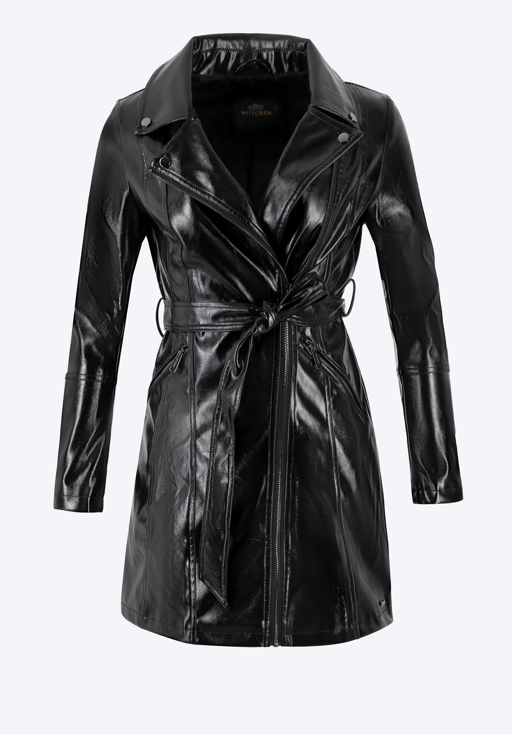 If you value elegance combined with contemporary style, this women's coat made in faux leather will become your new favourite. Designed for lovers of classic fashion, it combines a timeless silhouette with modern details that will elevate any outfit. Practical zipped pockets on the sides are perfect for warming your hands or storing small items. The stylish, adjustable belt at the waist allows for a perfect fit, accentuating your silhouette or creating a more relaxed, casual look.