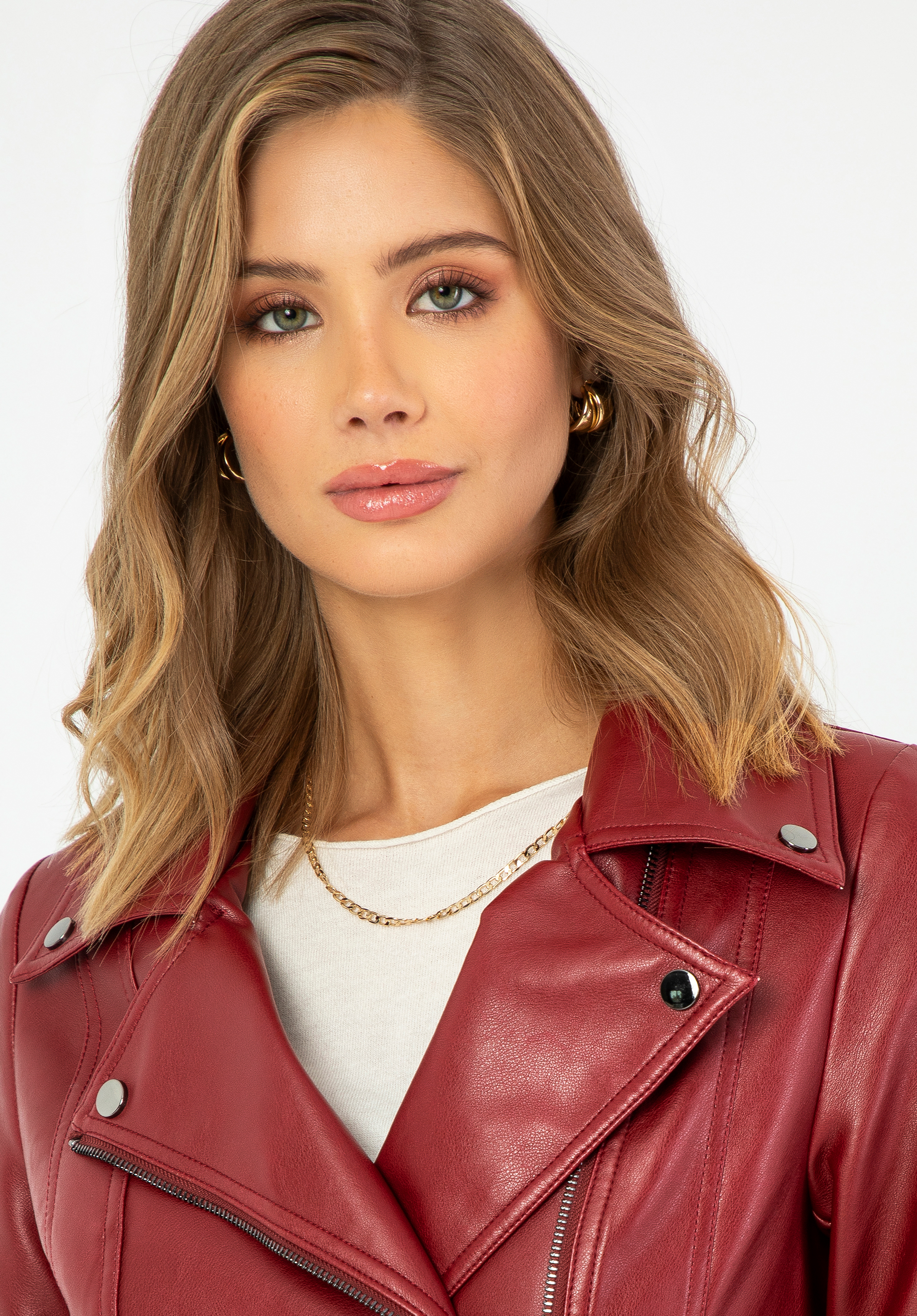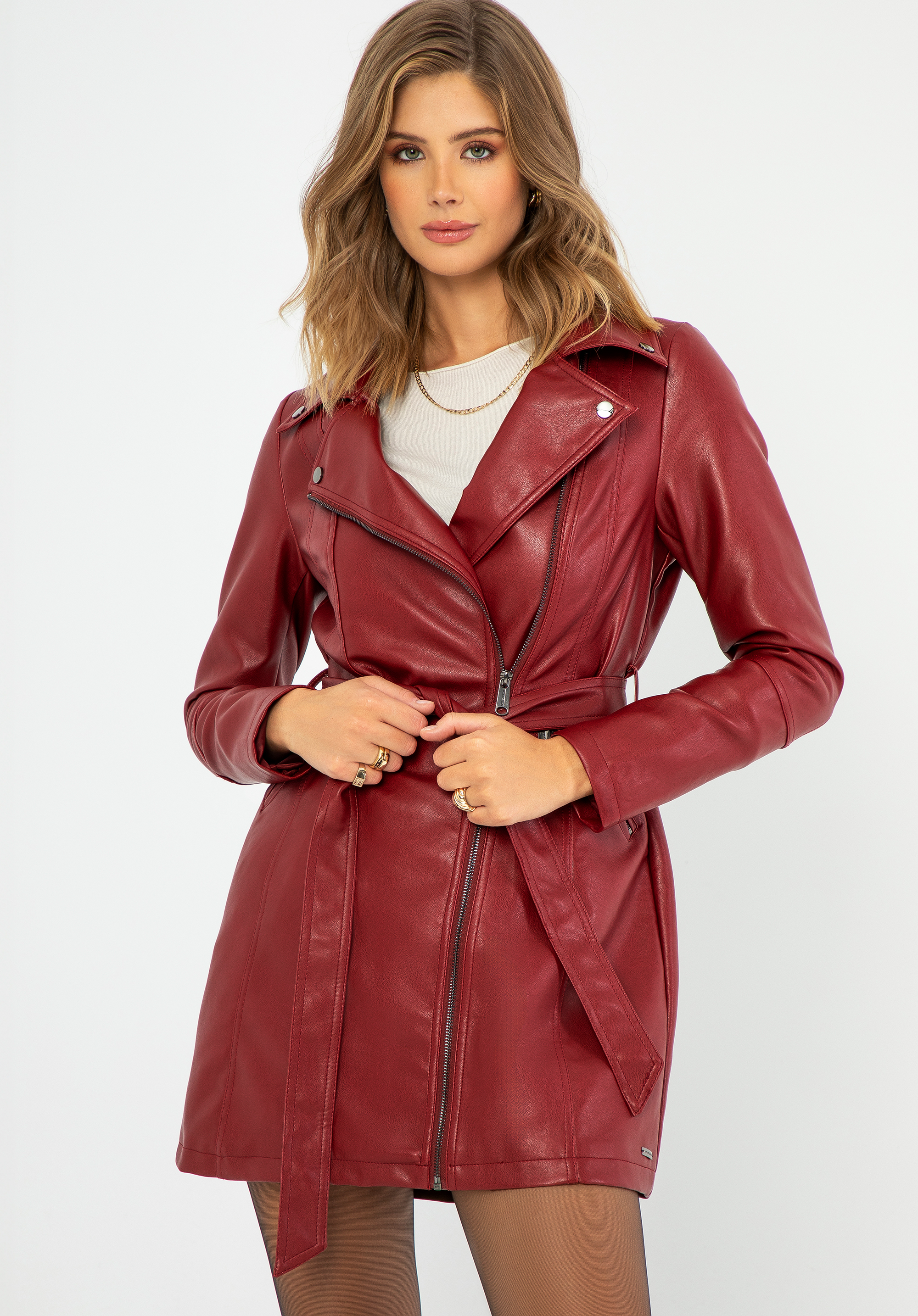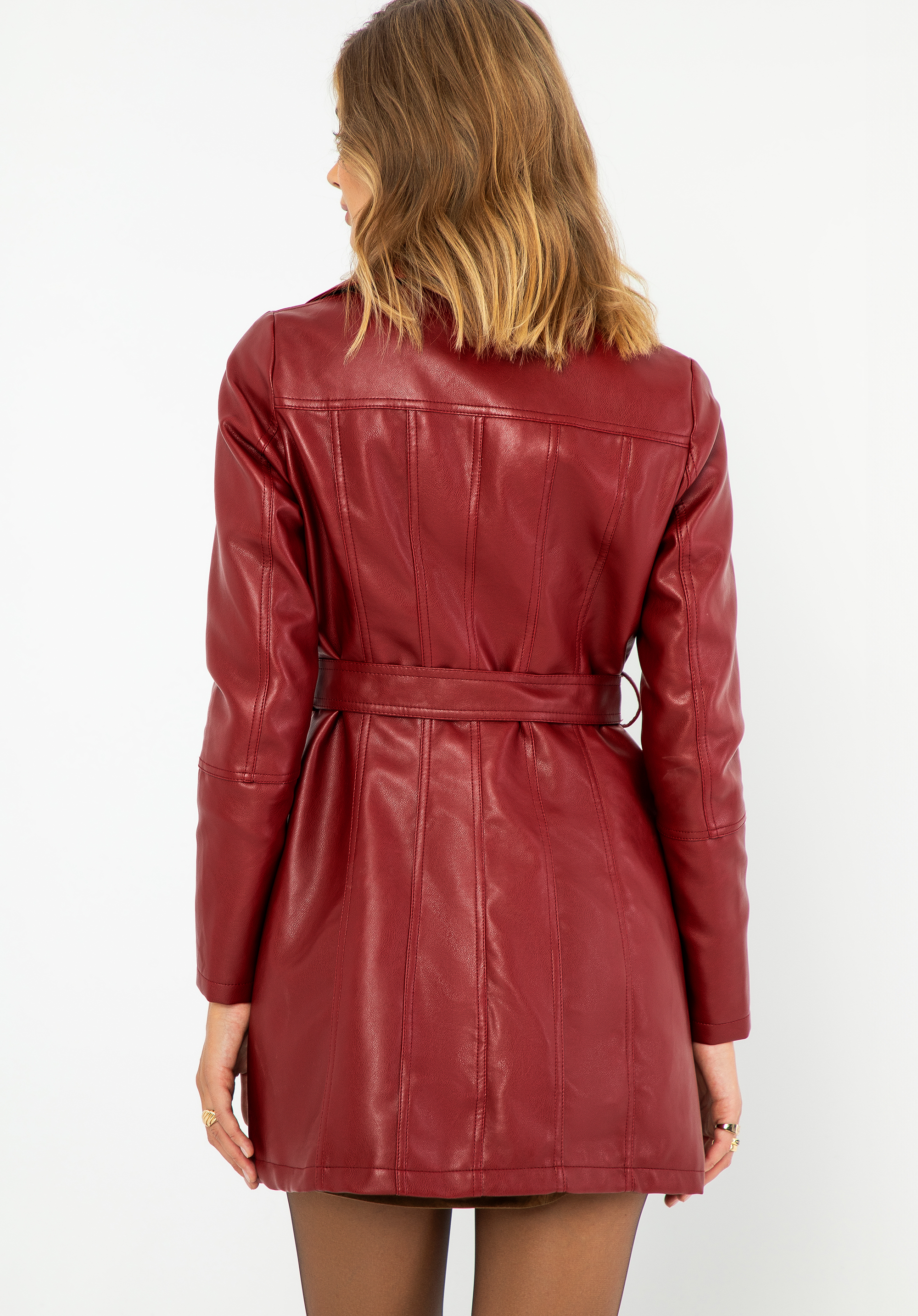 If you value elegance combined with contemporary style, this women's coat made in faux leather will become your new favourite. Designed for lovers of classic fashion, it combines a timeless silhouette with modern details that will elevate any outfit. Practical zipped pockets on the sides are perfect for warming your hands or storing small items. The stylish, adjustable belt at the waist allows for a perfect fit, accentuating your silhouette or creating a more relaxed, casual look.