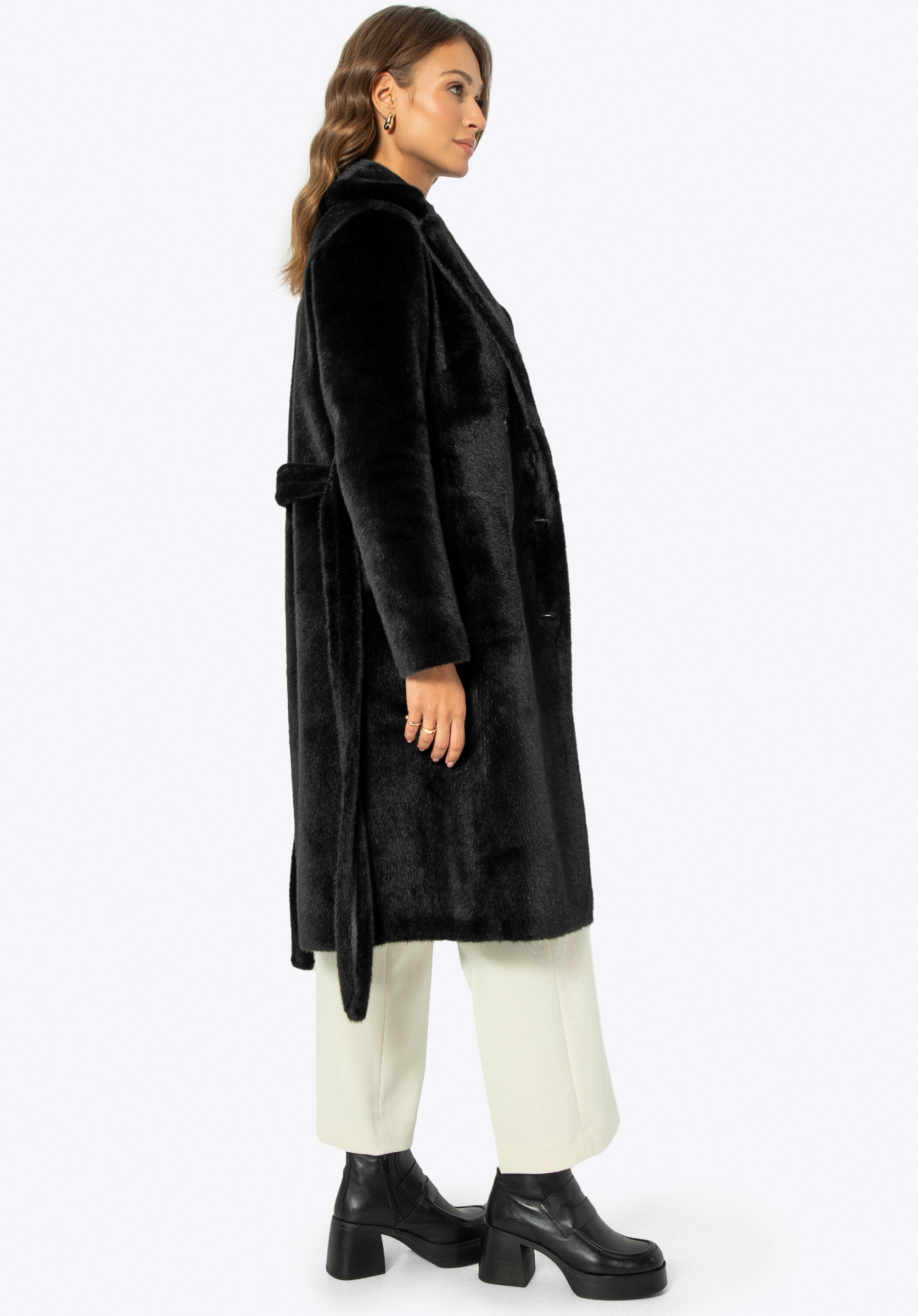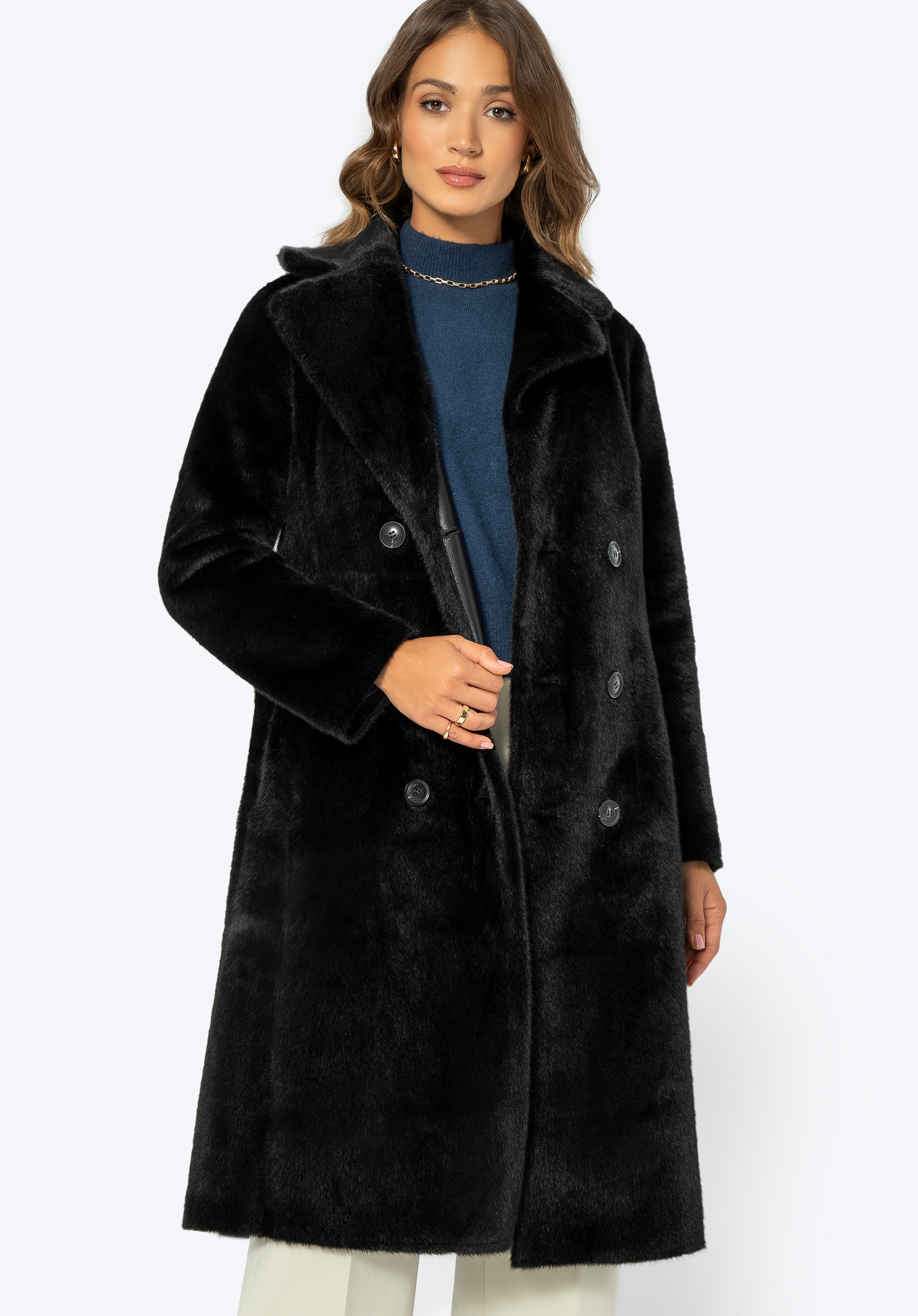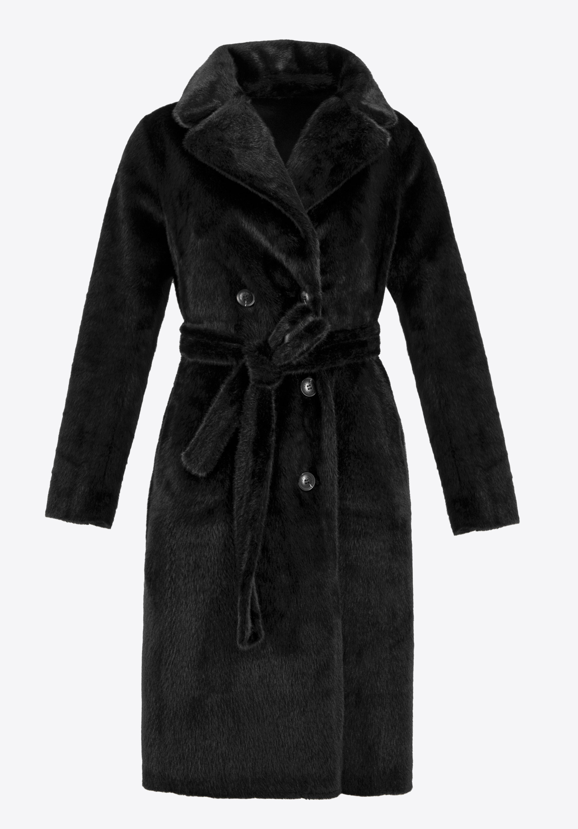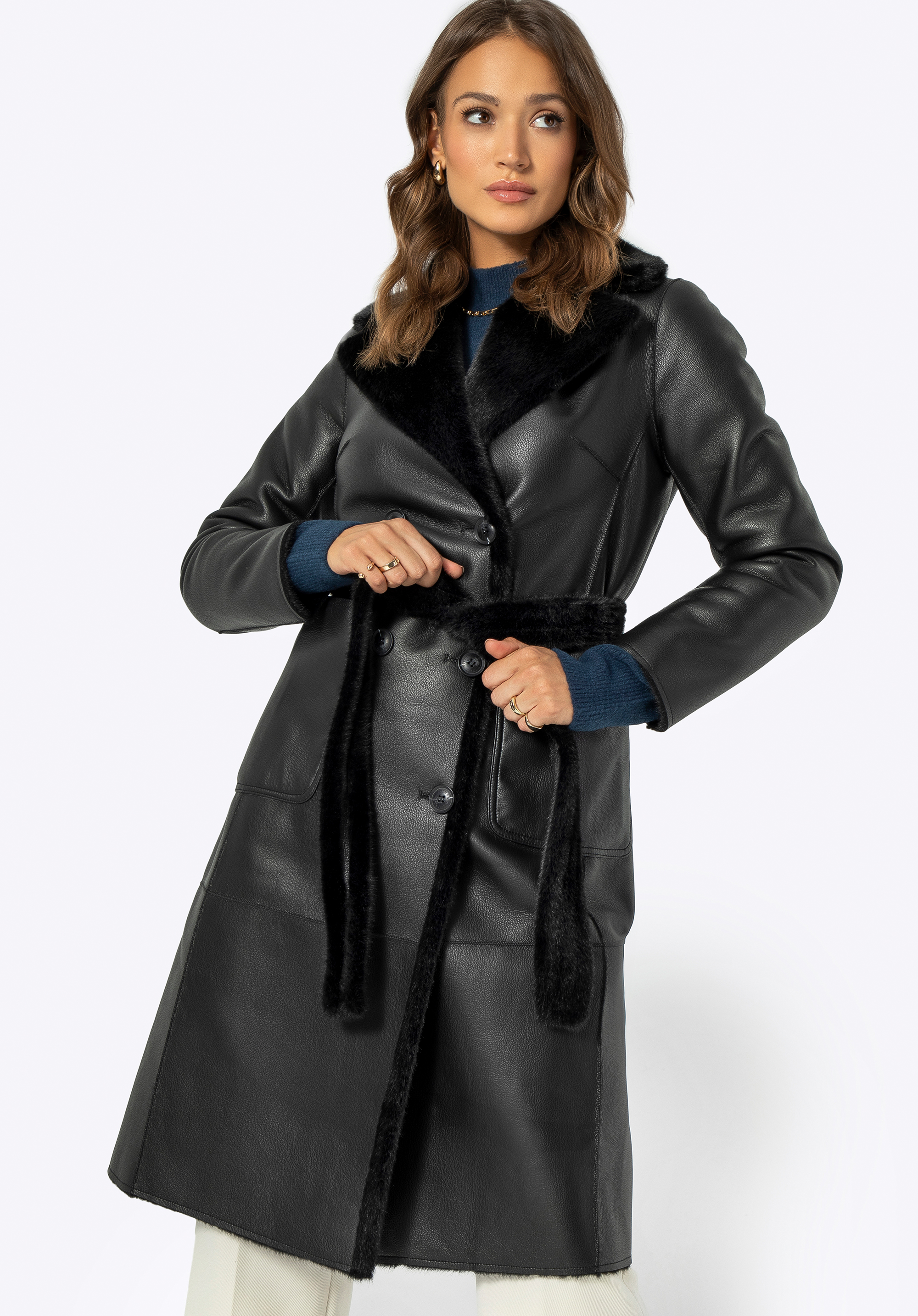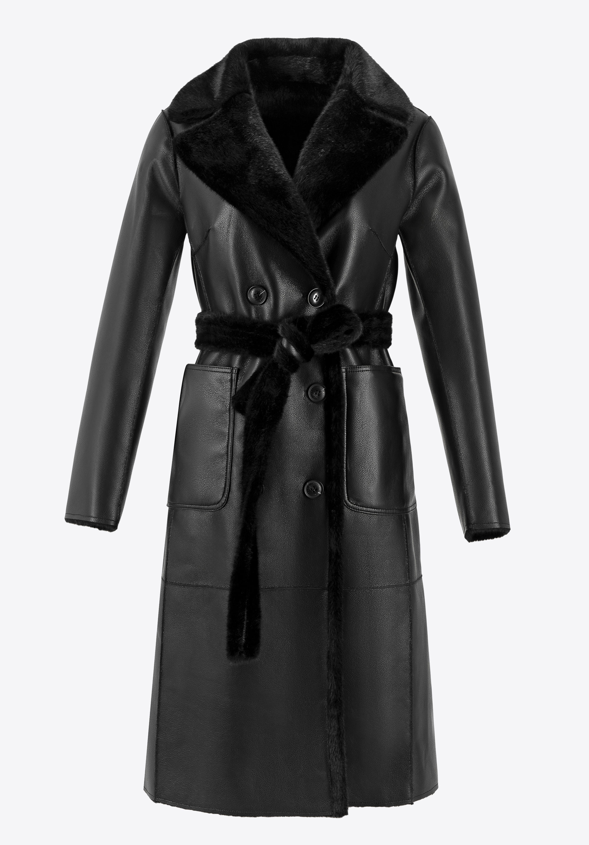 If you value unique clothing, we have something perfect for you! This eye-catching women's coat is a favourite among style enthusiasts, offering versatile looks for any occasion. This design offers two styles in one: luxurious faux fur on one side and elegant faux leather on the other. The long-line design provides excellent protection against the cold, whilst the double-breasted buttoning adds class and elegance. The coat features practical vertical inside pockets made of polyester and external patch pockets in faux leather, perfect for storing small items. The waist is accentuated by a faux fur belt, and the fold-over collar guarantees additional comfort and warmth. This reversible coat is the ideal choice for winter days!