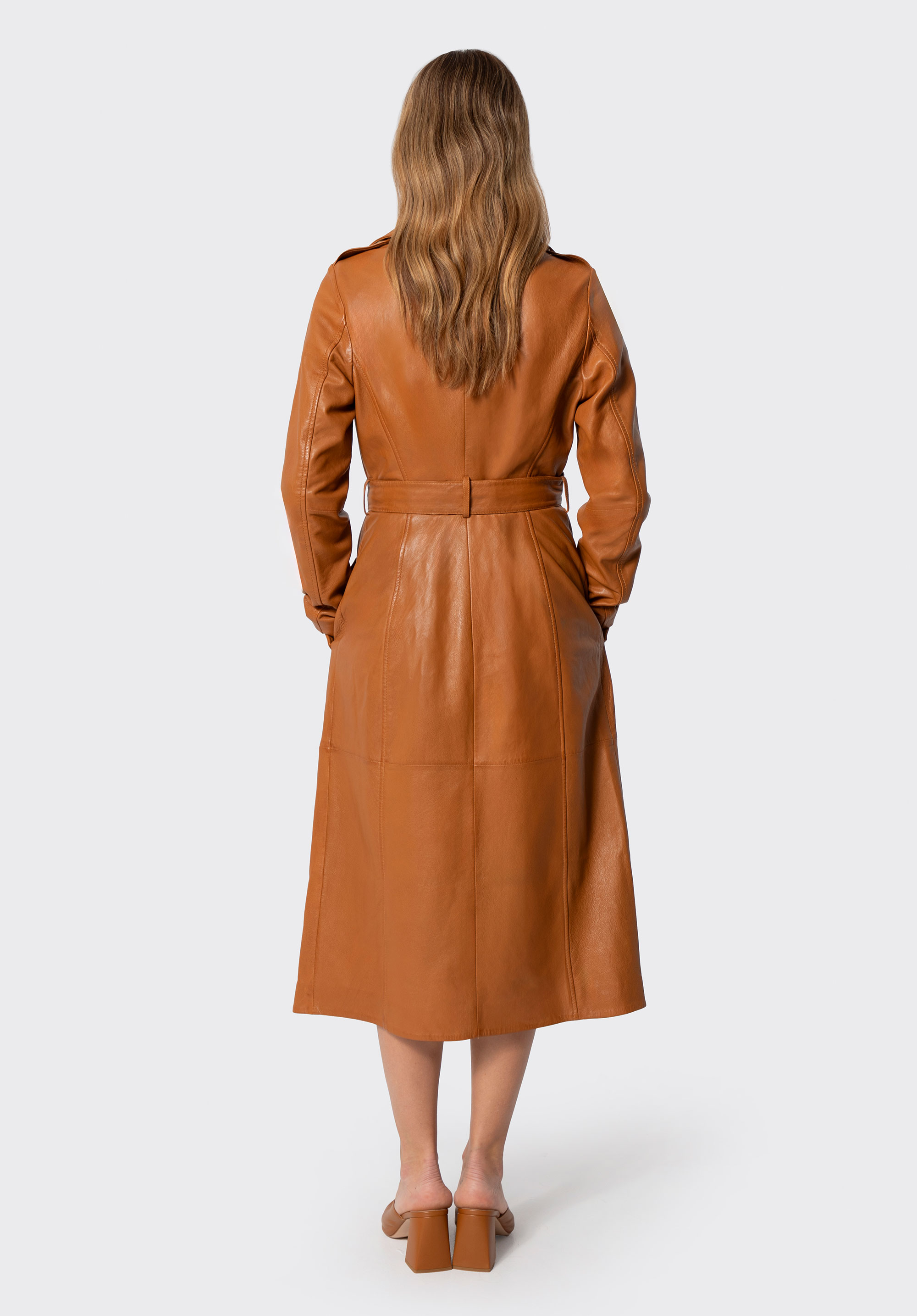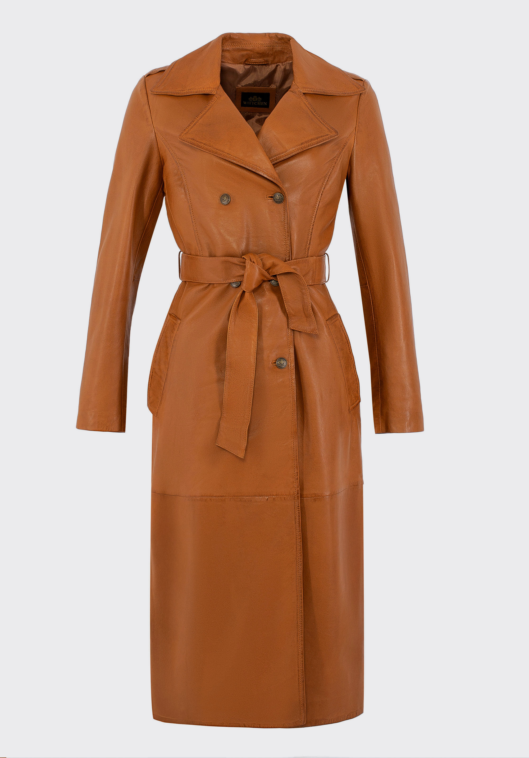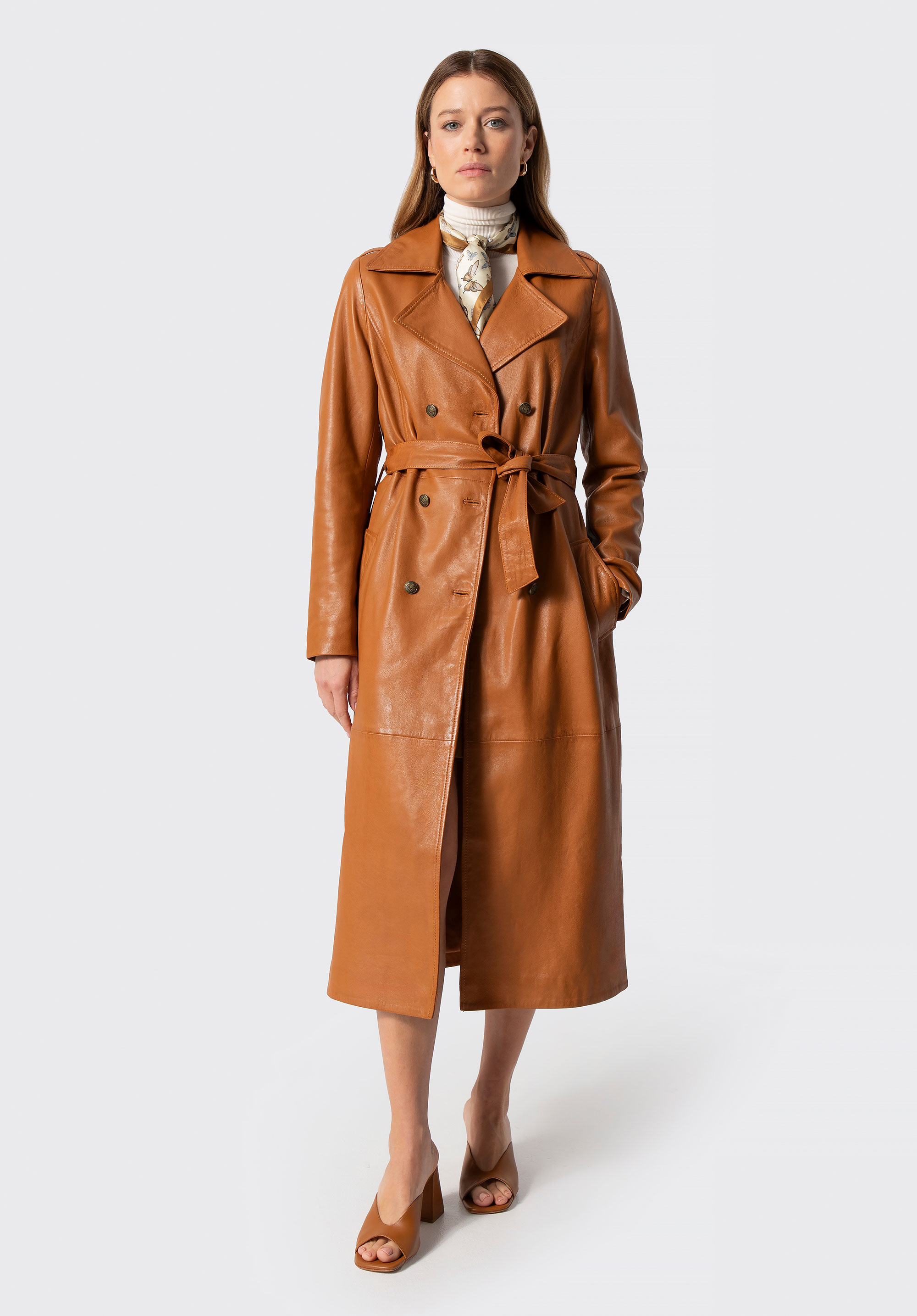 Discover the must-have piece of the season – our women’s coat made of natural sheepskin leather is a timeless classic with a modern edge. It’s designed to turn heads and elevate every outfit with unmatched elegance. Featuring metal logo buttons, a double-breasted front and a notched collar, this coat is not just an outerwear piece – it’s an investment in your personal style. Shoulder epaulettes add structure and character, while the waist belt allows for a perfectly tailored silhouette.