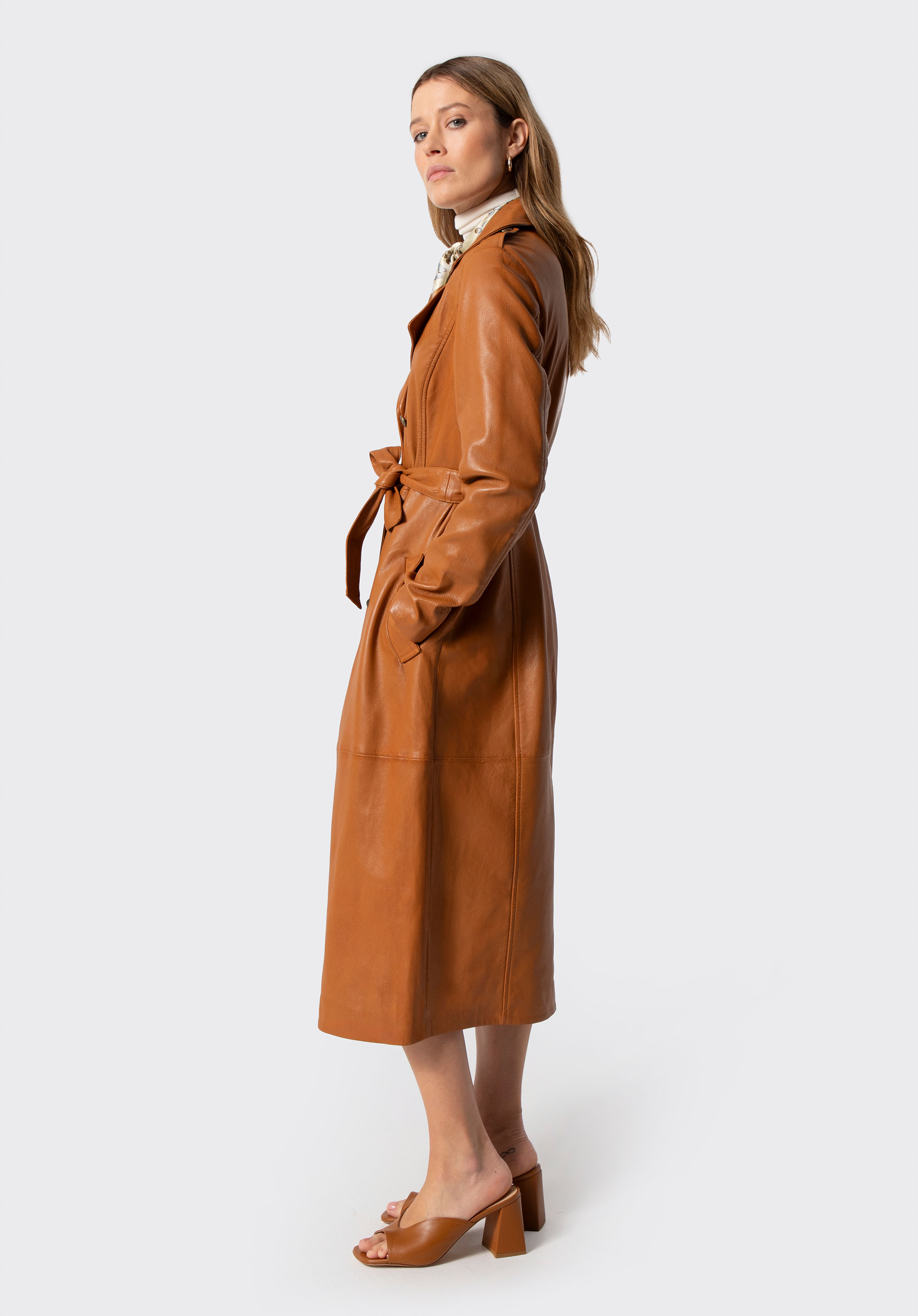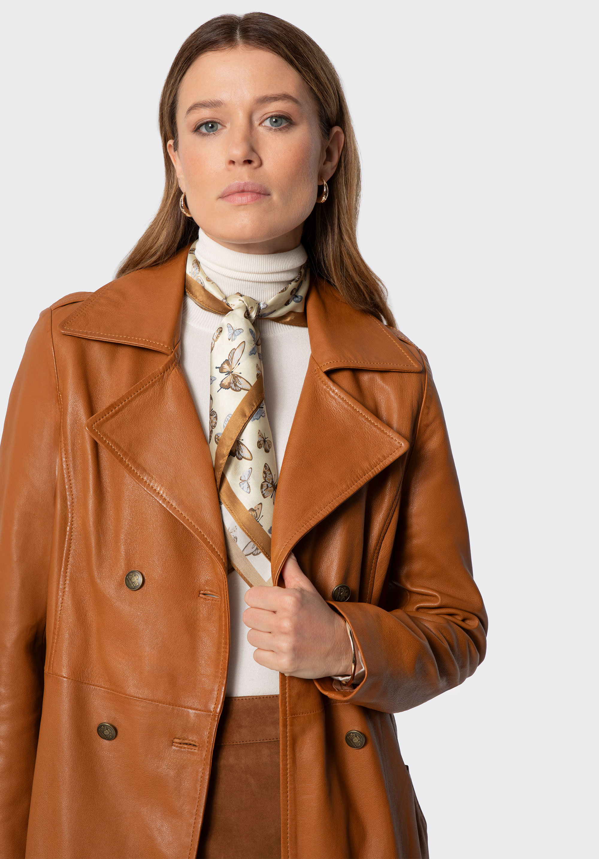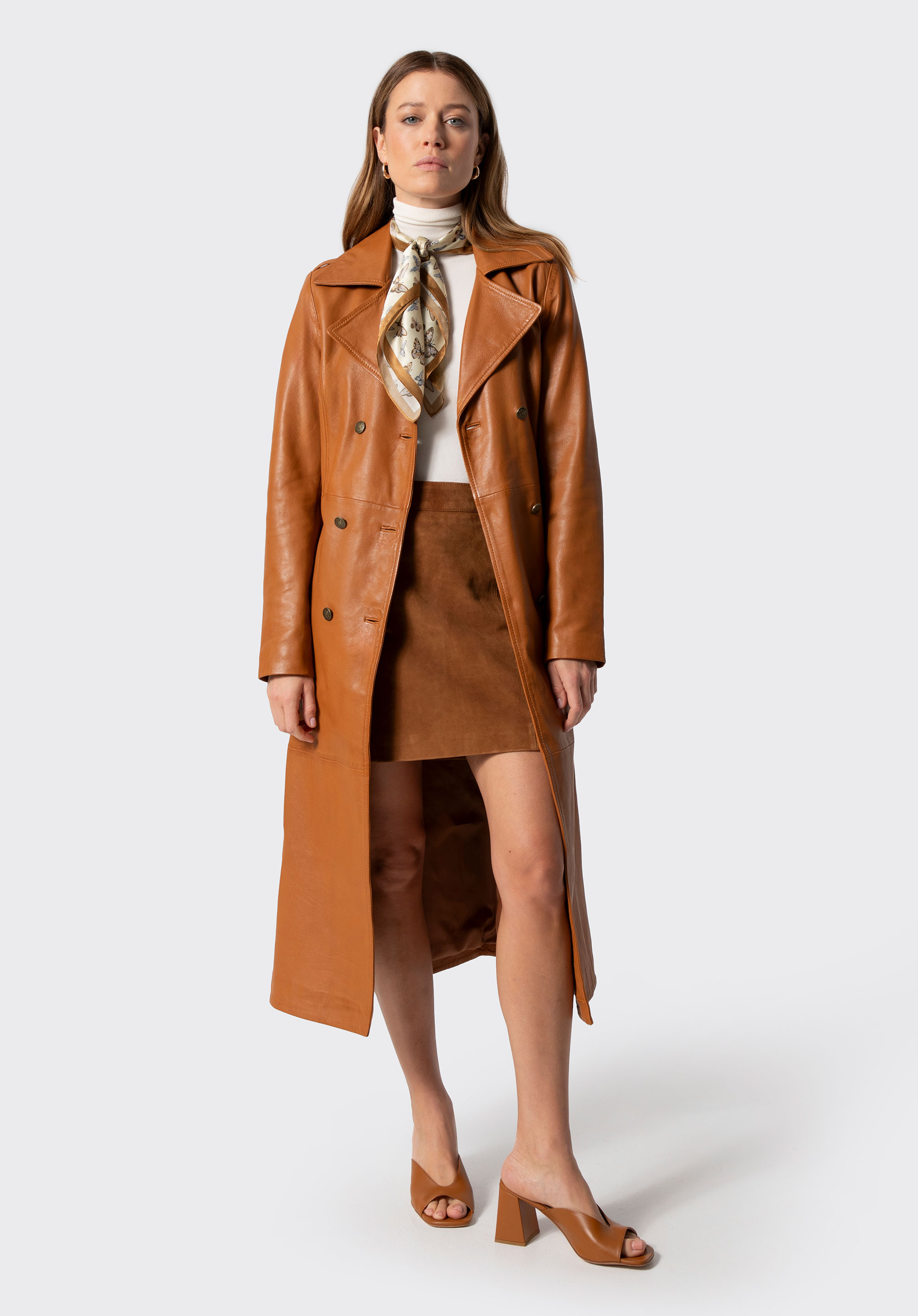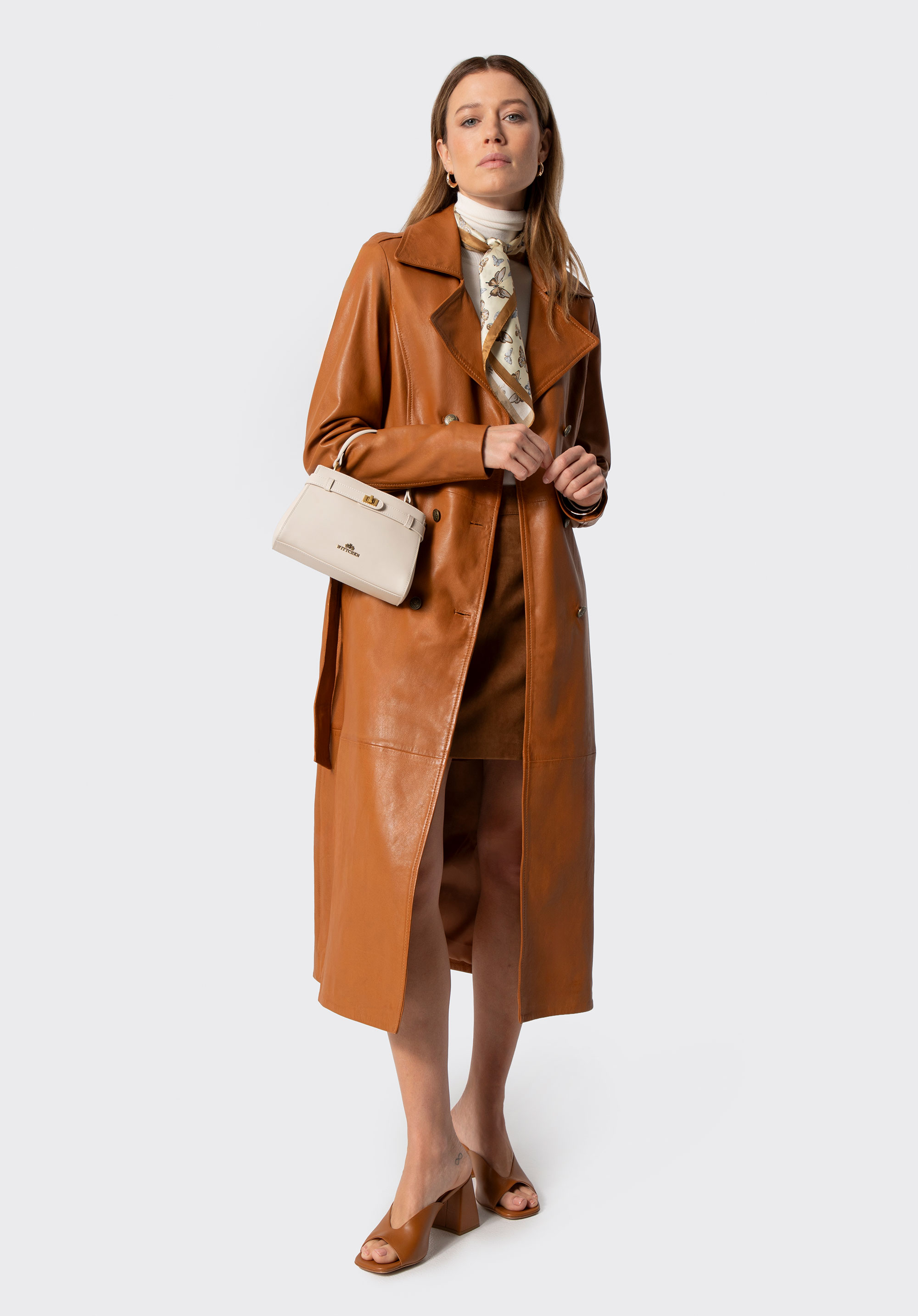 Discover the must-have piece of the season – our women’s coat made of natural sheepskin leather is a timeless classic with a modern edge. It’s designed to turn heads and elevate every outfit with unmatched elegance. Featuring metal logo buttons, a double-breasted front and a notched collar, this coat is not just an outerwear piece – it’s an investment in your personal style. Shoulder epaulettes add structure and character, while the waist belt allows for a perfectly tailored silhouette.