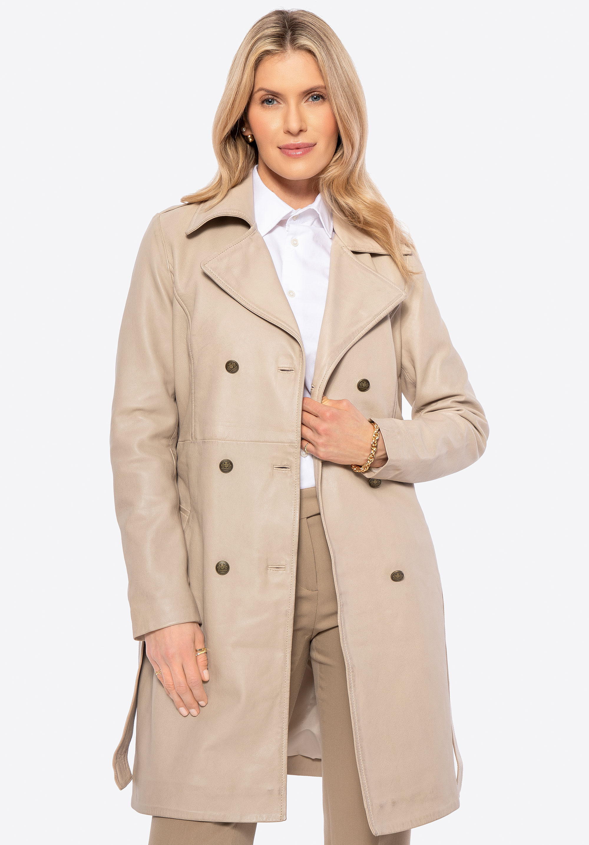 When classic meets modern, a captivating design is born. This exceptional coat made from natural sheepskin leather is a blend of timeless elegance and bold design. The logo buttons accentuate its exclusivity, while the turnover collar adds a touch of sophisticated twist. The fitted cut and waist belt beautifully shape the silhouette, enhancing feminine curves.