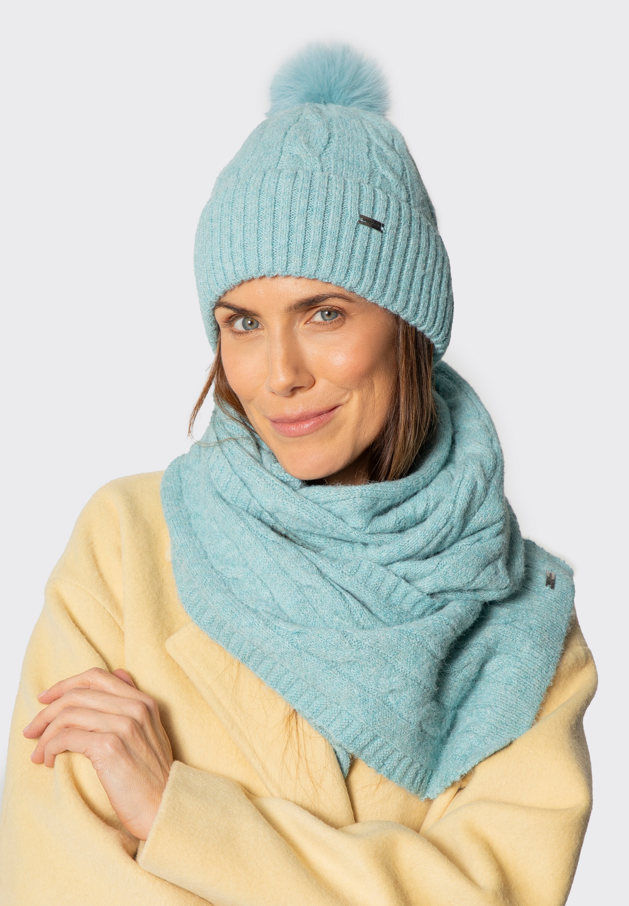 Winter set with a touch of elegance — cable-knit hat with pompom and matching scarf