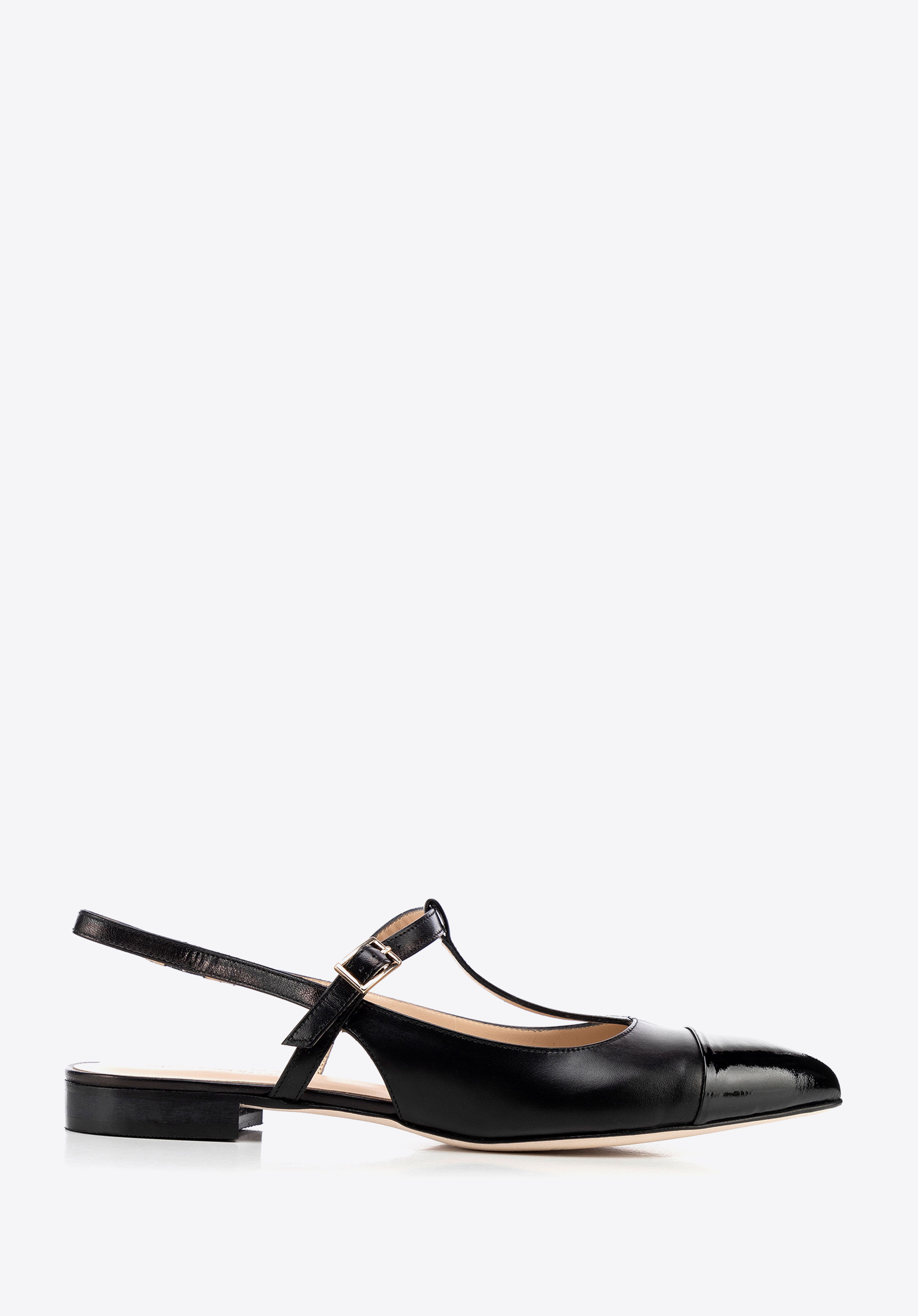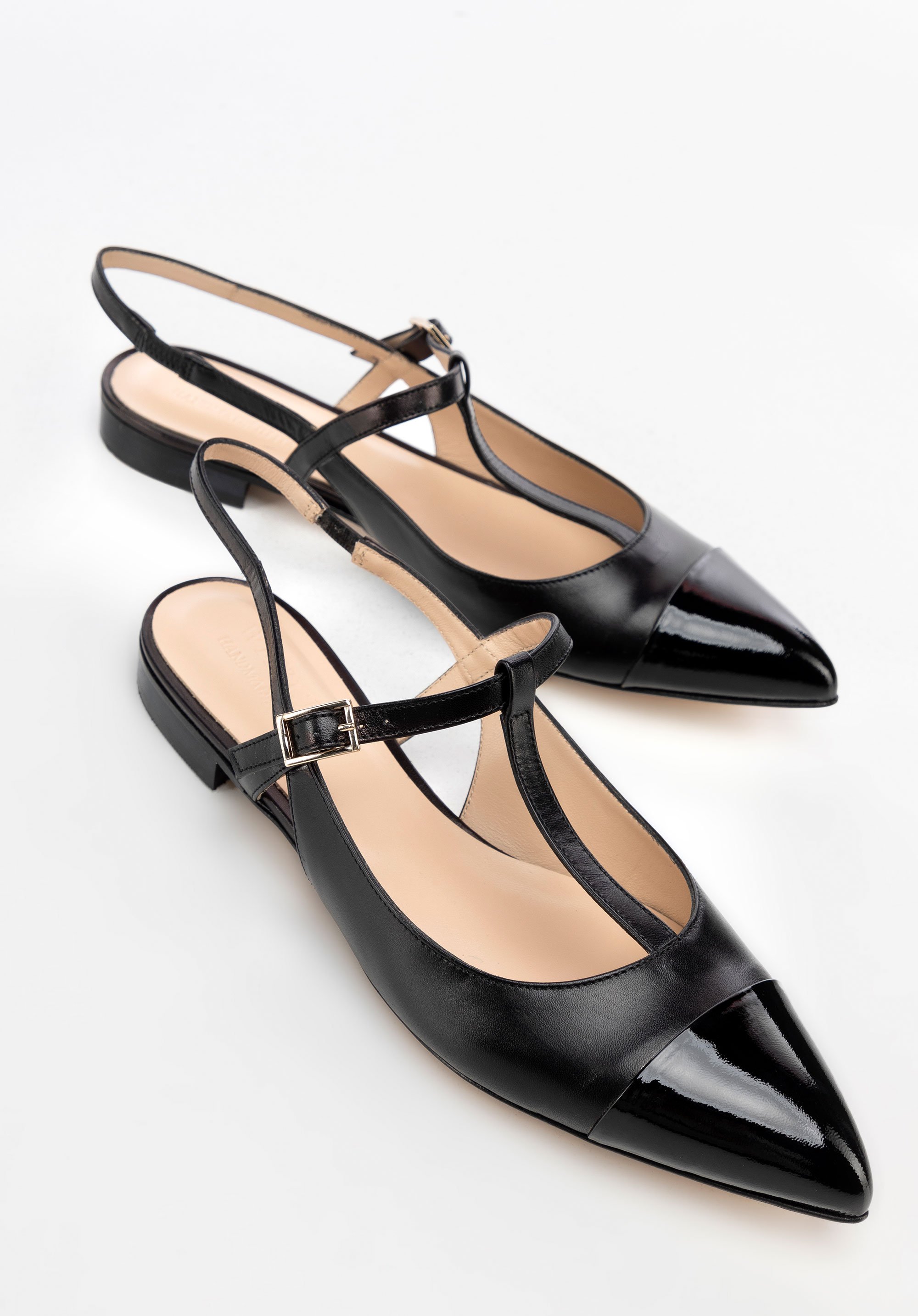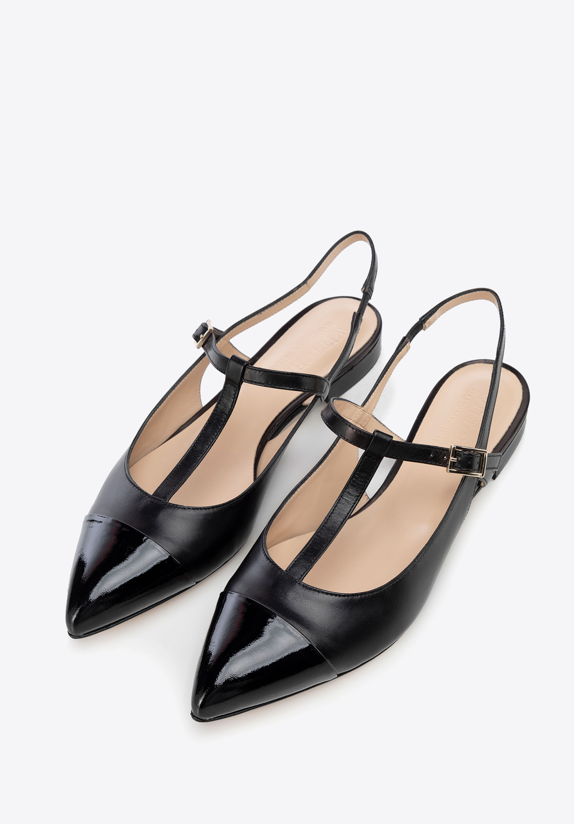 These unique ballerina flats blend classic style with a modern twist. Made entirely from natural leather, they offer excellent wearing comfort. The contrast between matte and patent leather adds a touch of sophisticated twist. A pointed toe creates the illusion of longer legs, while delicate buckle-fastened straps ensure a perfect fit. With an open heel and flat sole, they combine elegance and comfort, perfect for both everyday wear and special occasions.