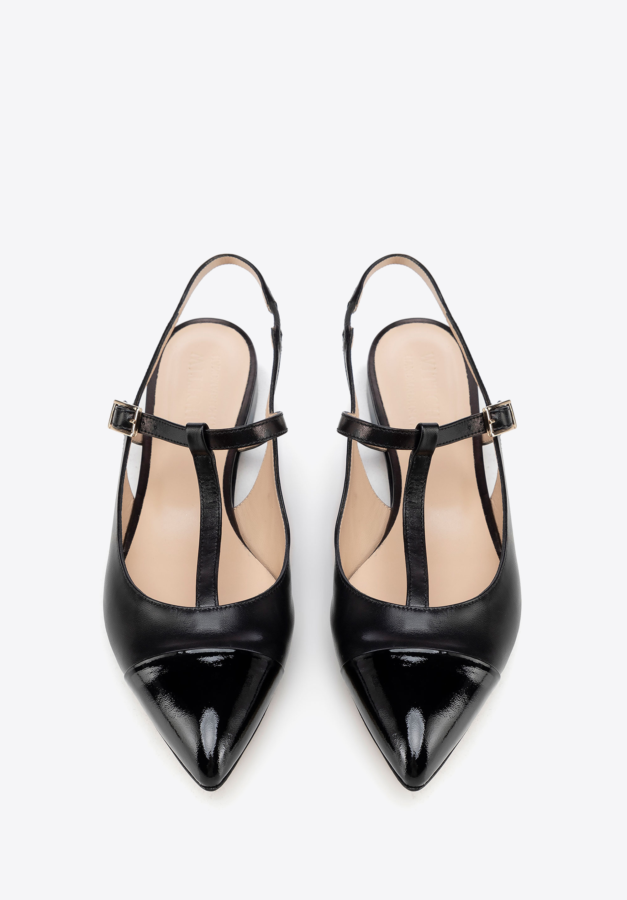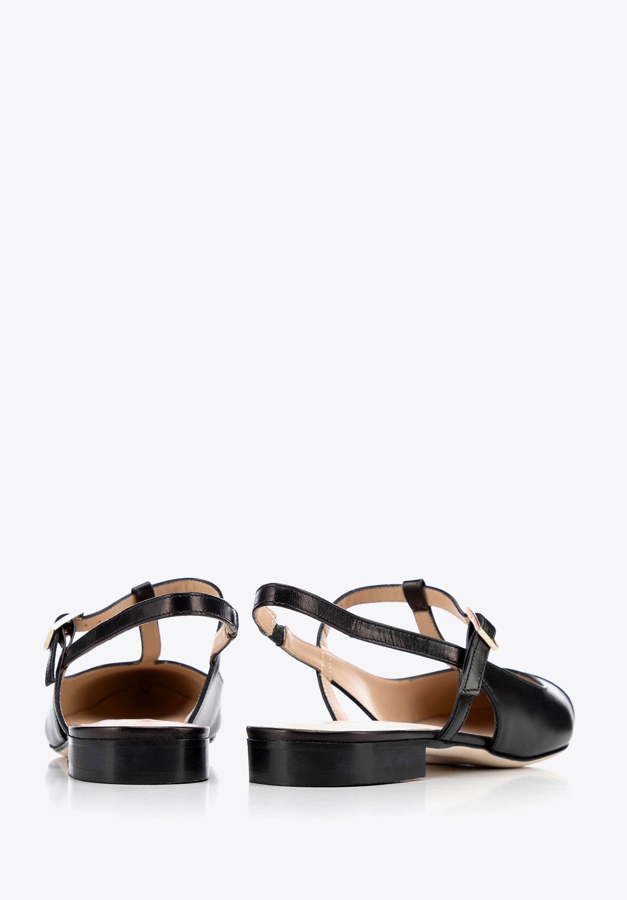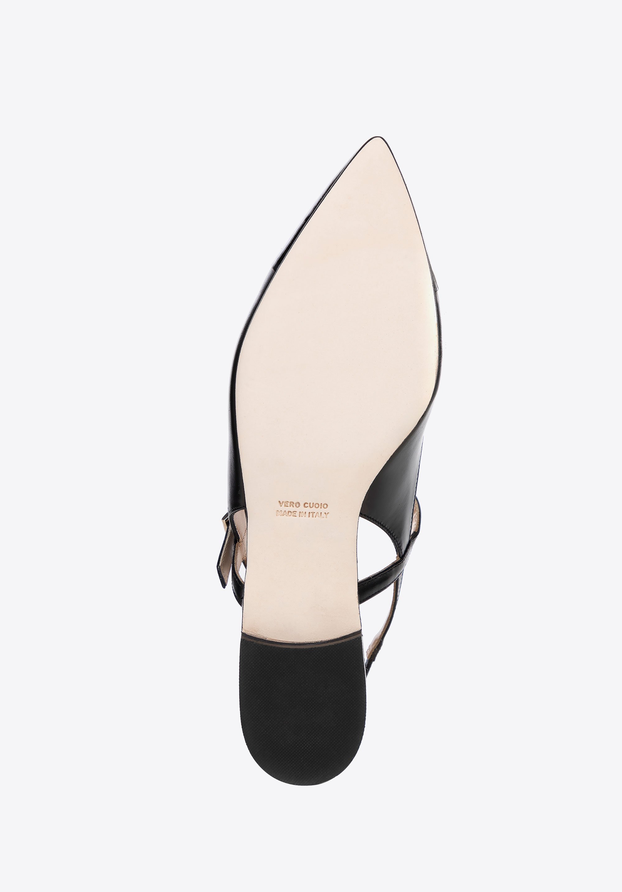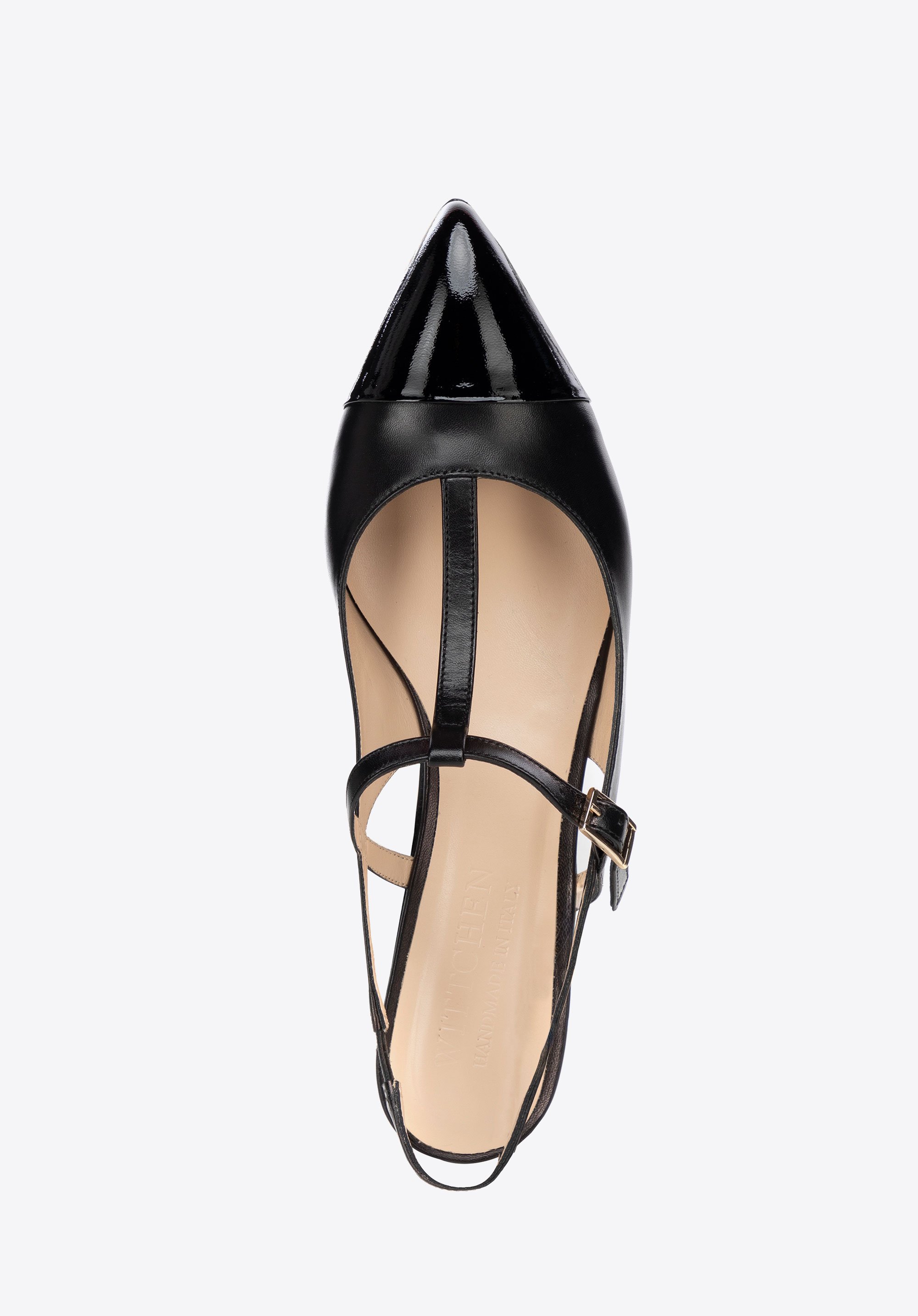 These unique ballerina flats blend classic style with a modern twist. Made entirely from natural leather, they offer excellent wearing comfort. The contrast between matte and patent leather adds a touch of sophisticated twist. A pointed toe creates the illusion of longer legs, while delicate buckle-fastened straps ensure a perfect fit. With an open heel and flat sole, they combine elegance and comfort, perfect for both everyday wear and special occasions.