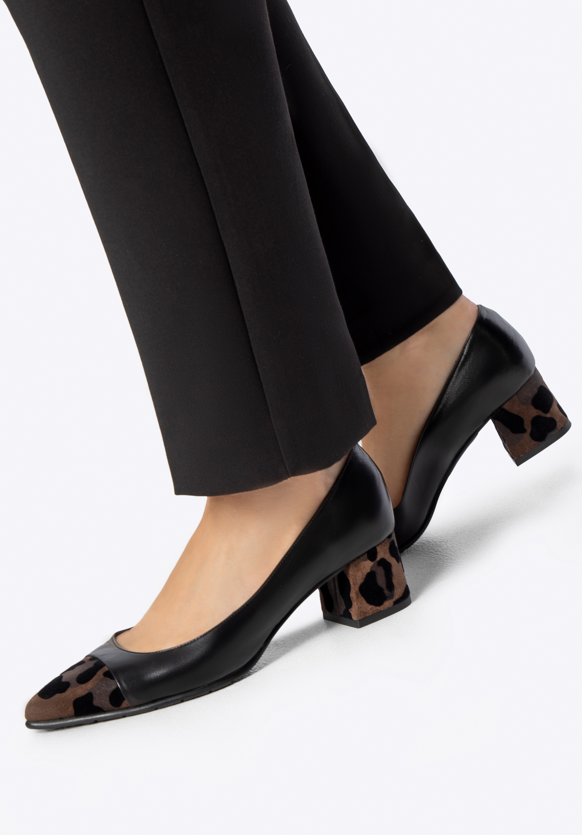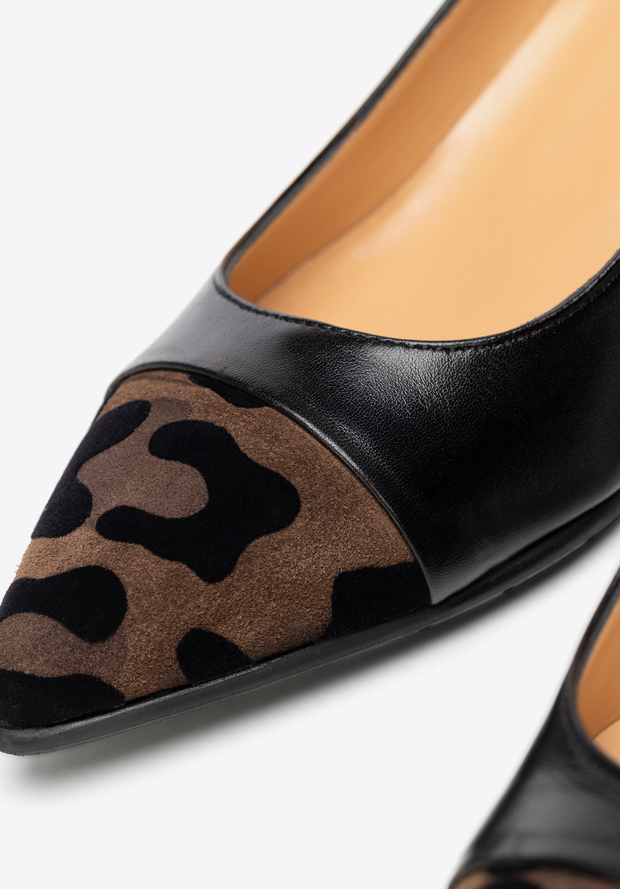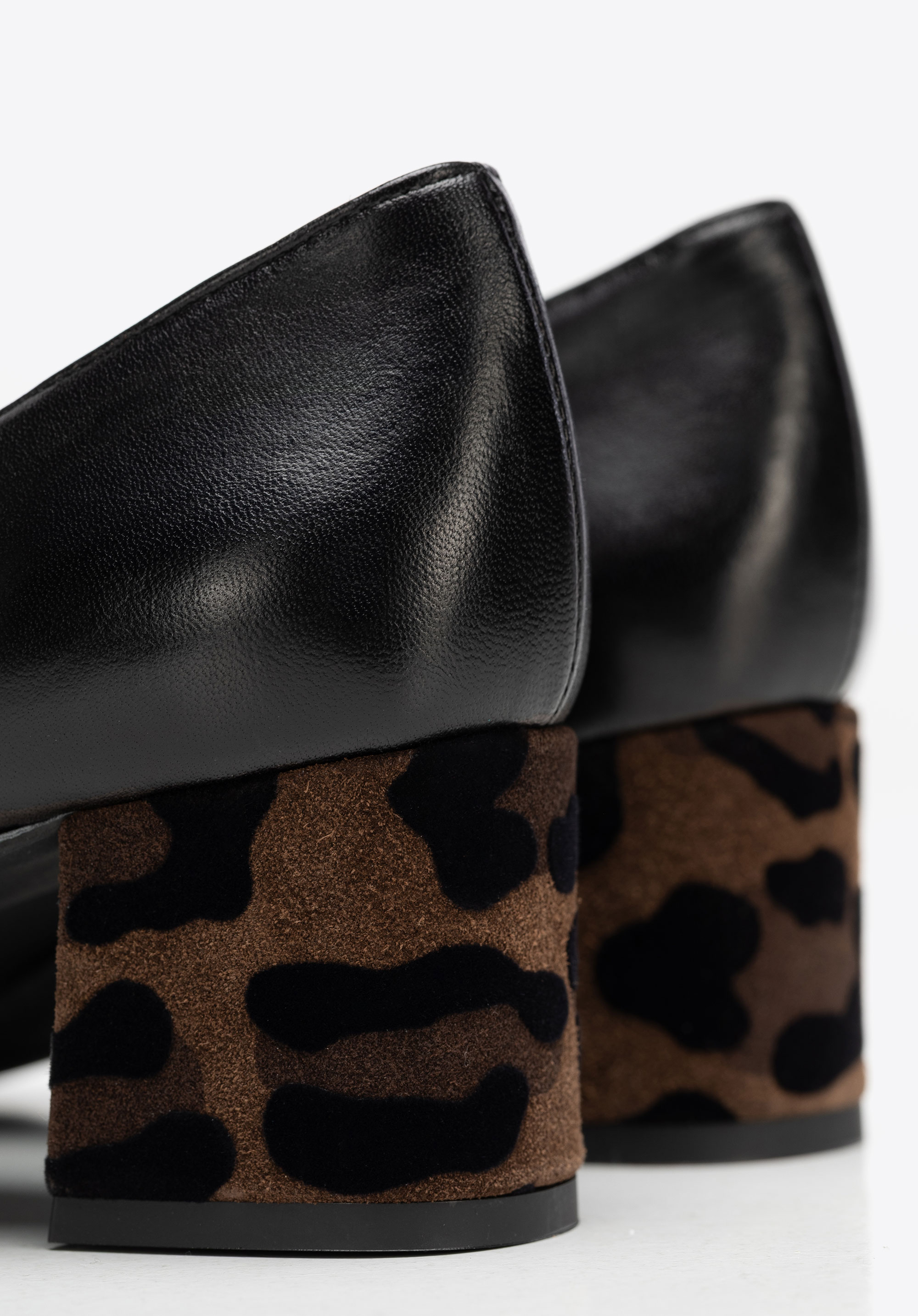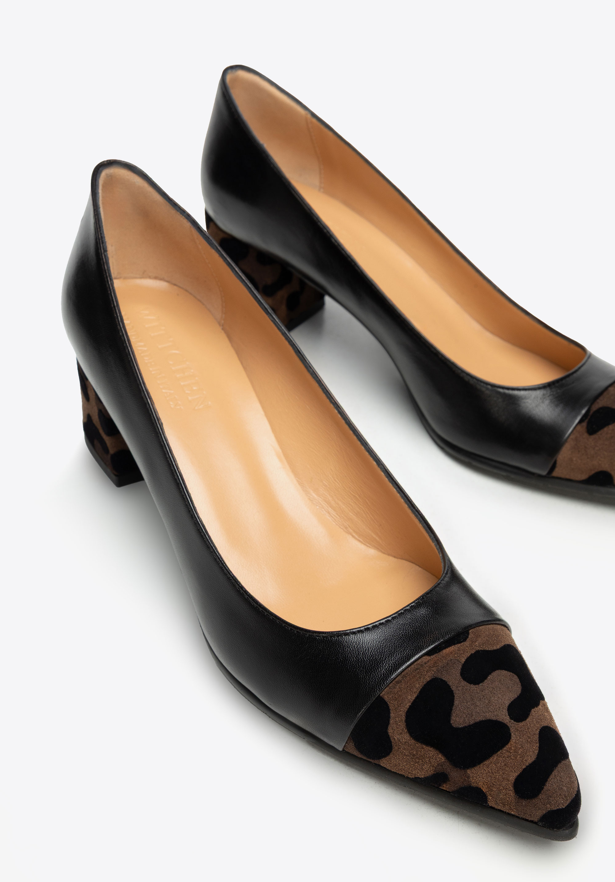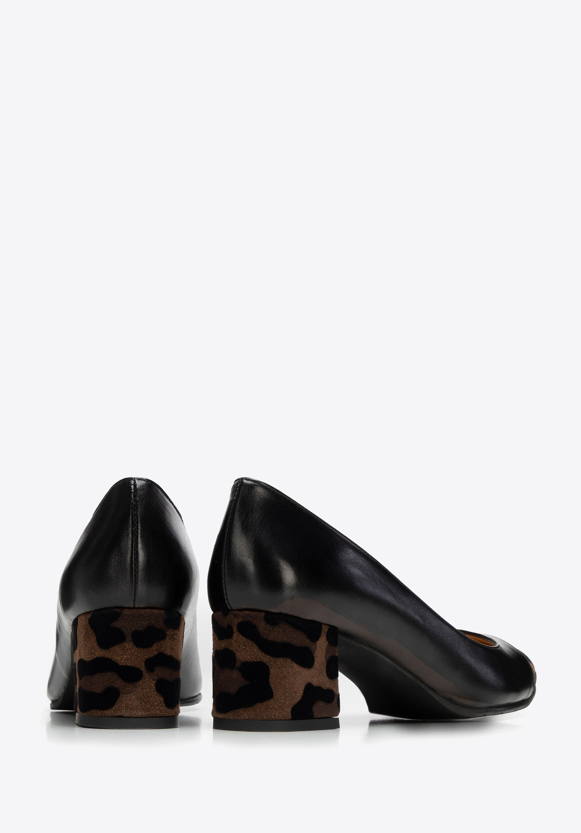 Looking for court shoes that combine timeless elegance with a subtle modern twist? This design was created for women who appreciate classic style but aren’t afraid to add a bold accent to their outfits. The upper is crafted from natural grain leather, beautifully contrasted with a striking detail – a pointed toe and block heel covered in leopard-print suede. The pointed toe visually elongates the leg, adding lightness to your silhouette, while the sturdy block heel ensures all-day comfort. Leather insole and lining provide exceptional softness and a perfect fit, and the rubber sole improves grip and cushioning.