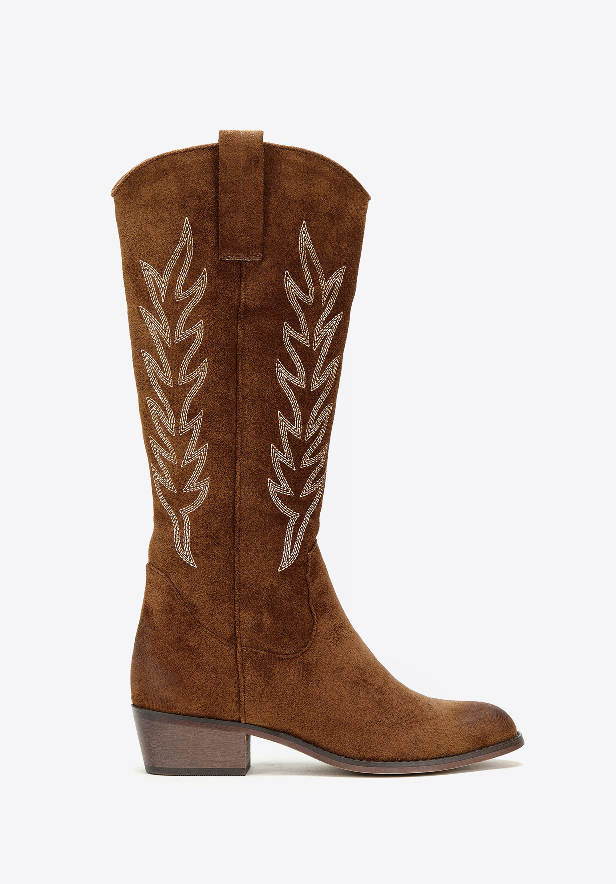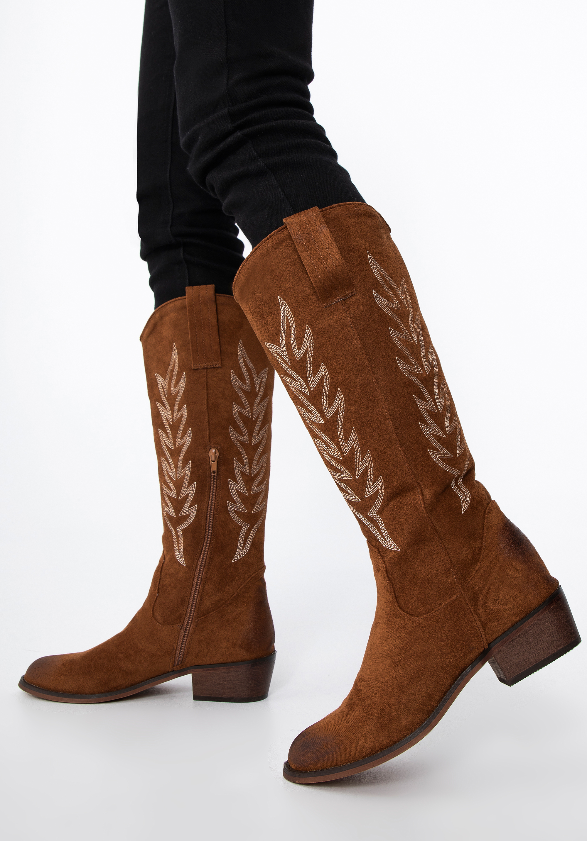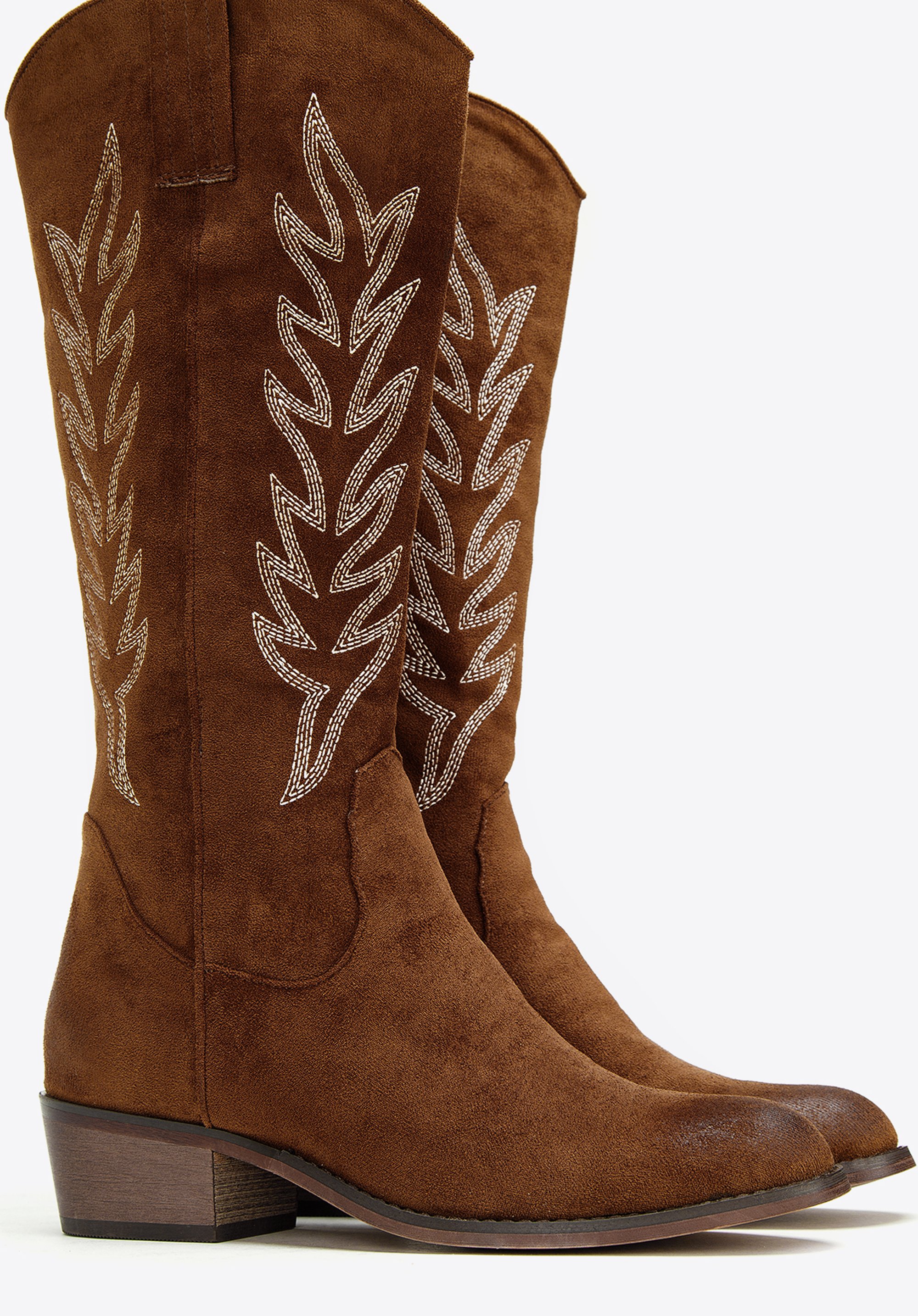 the highest quality suedette with a soft faux leather insole, designed to offer greater comfort. This unique staple western tall boot is updated with a stunning