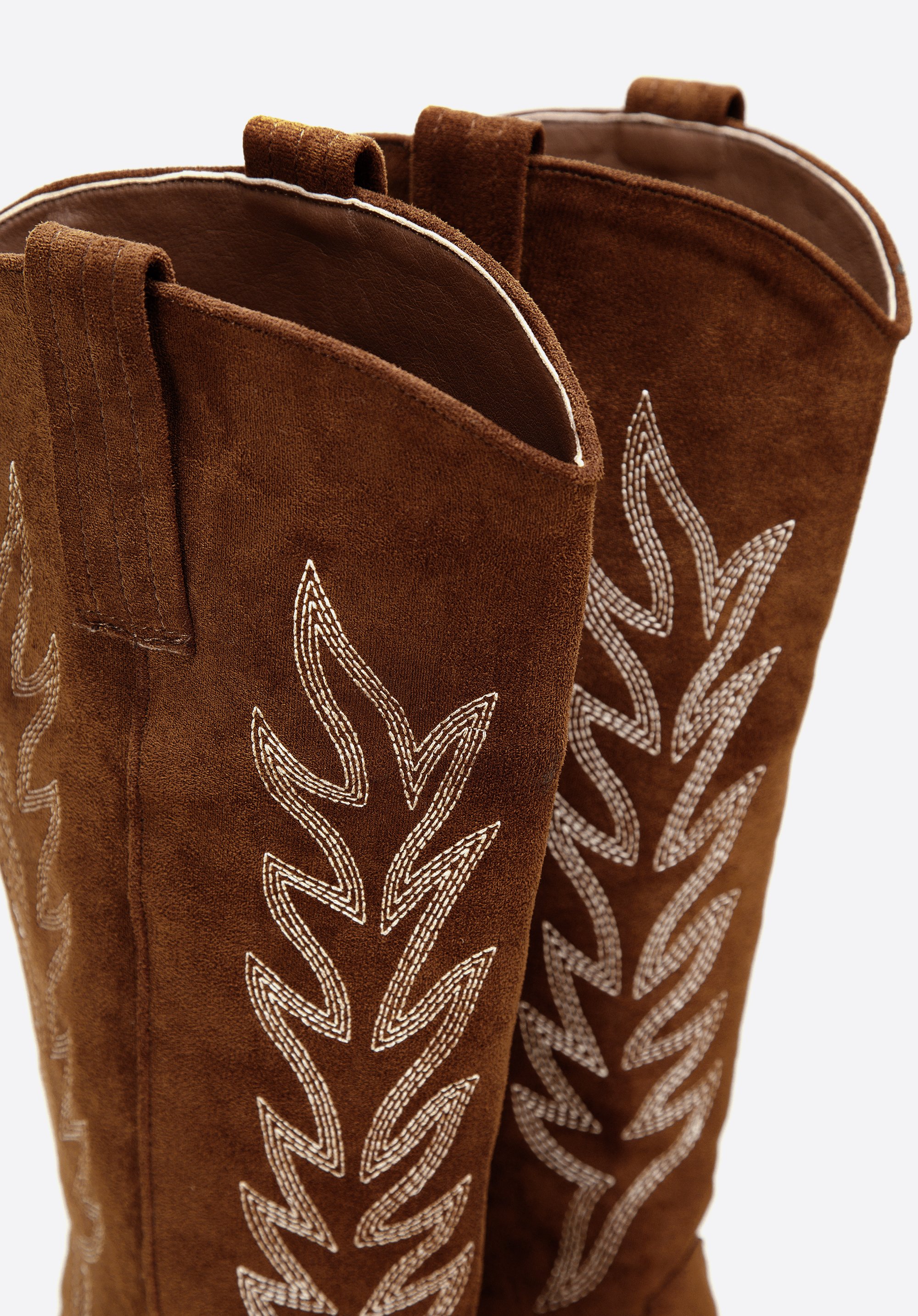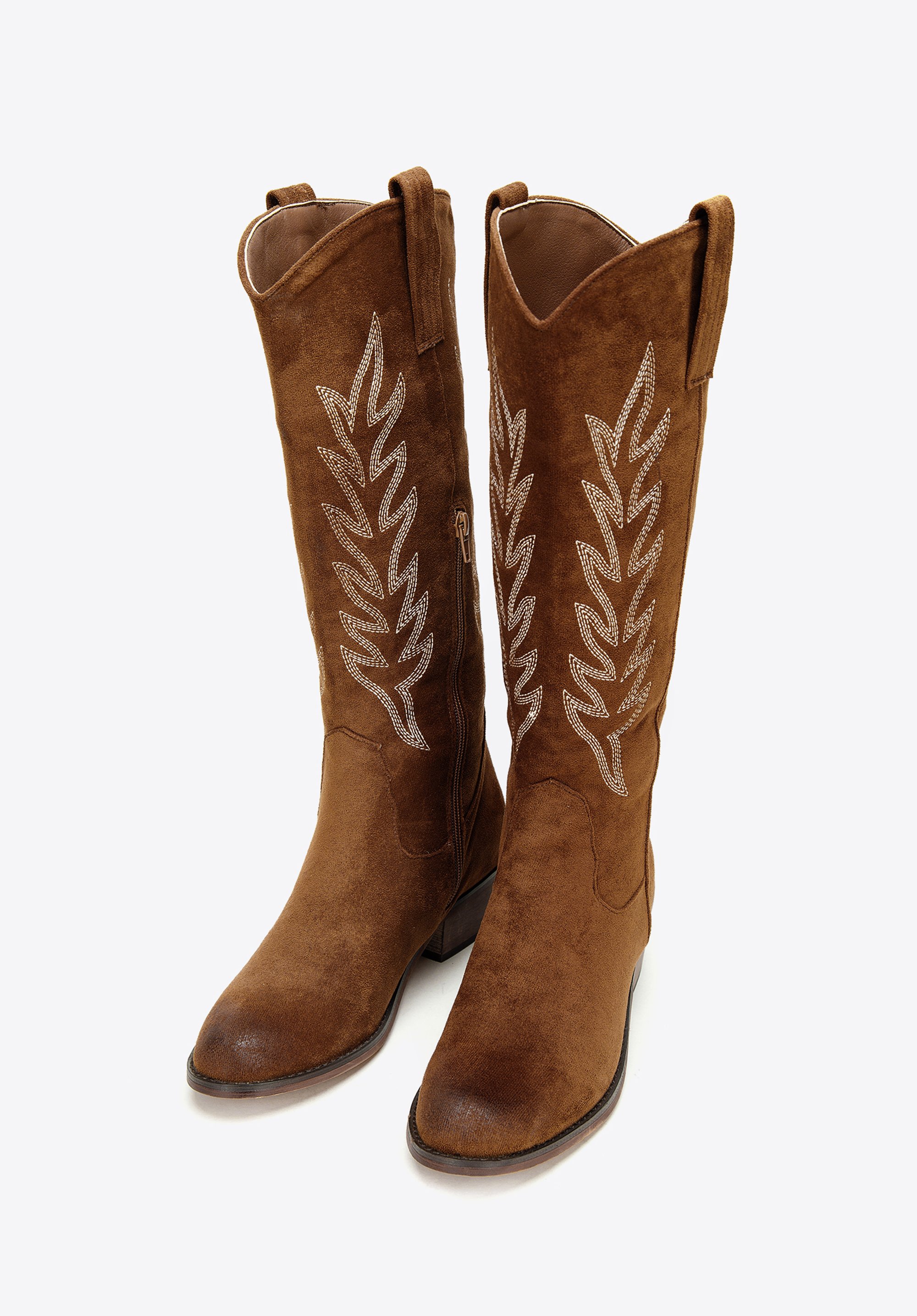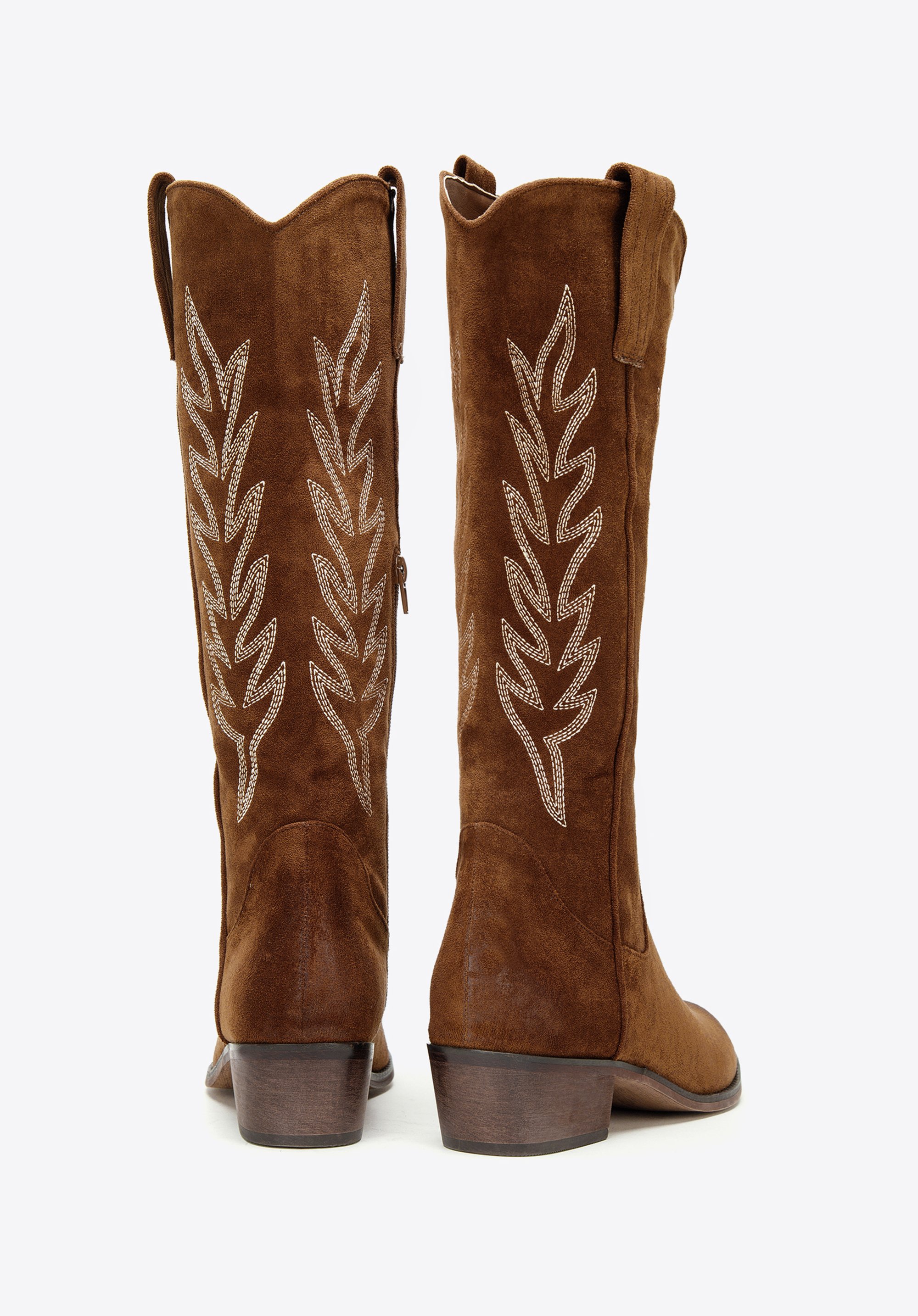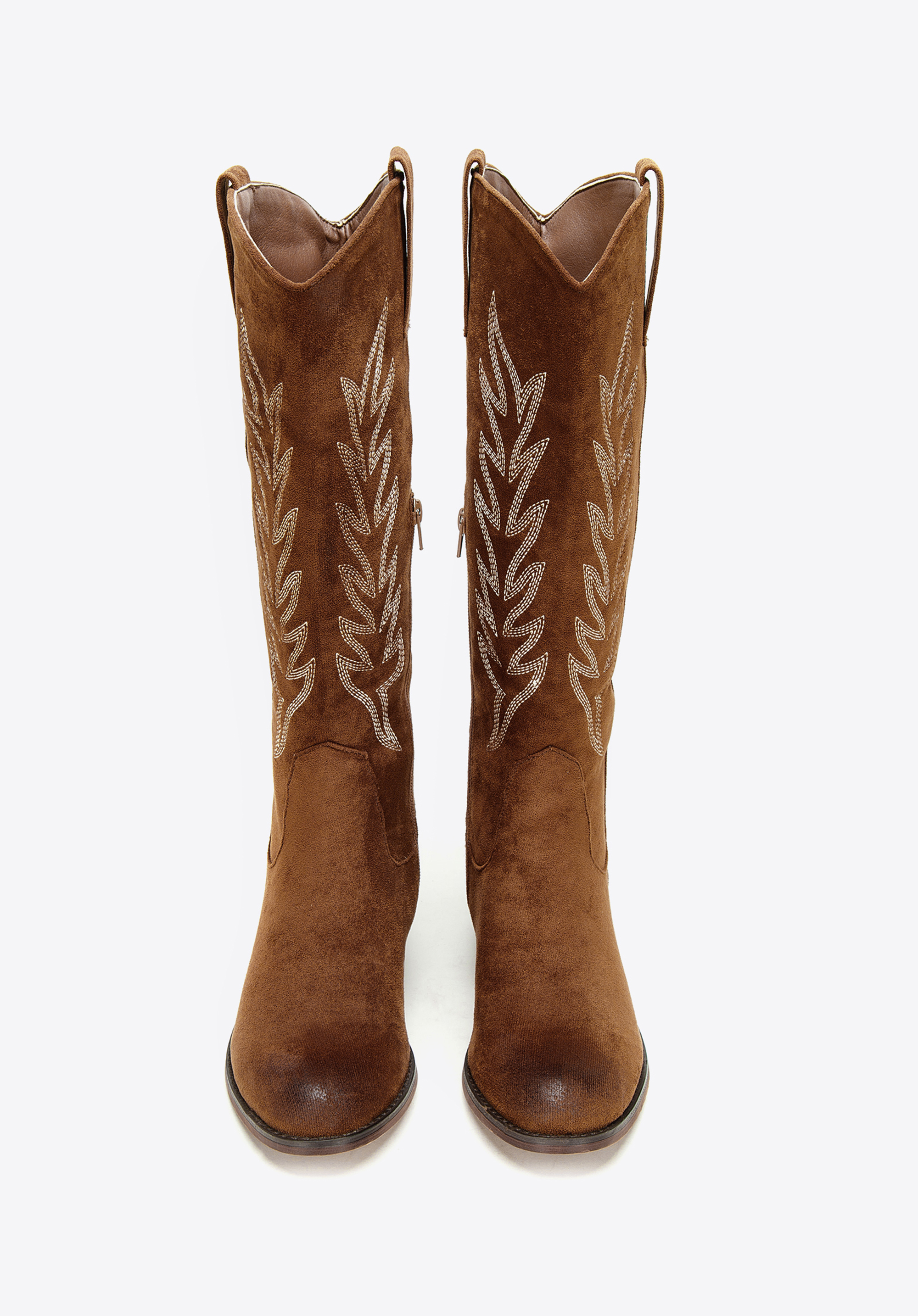 the highest quality suedette with a soft faux leather insole, designed to offer greater comfort. This unique staple western tall boot is updated with a stunning