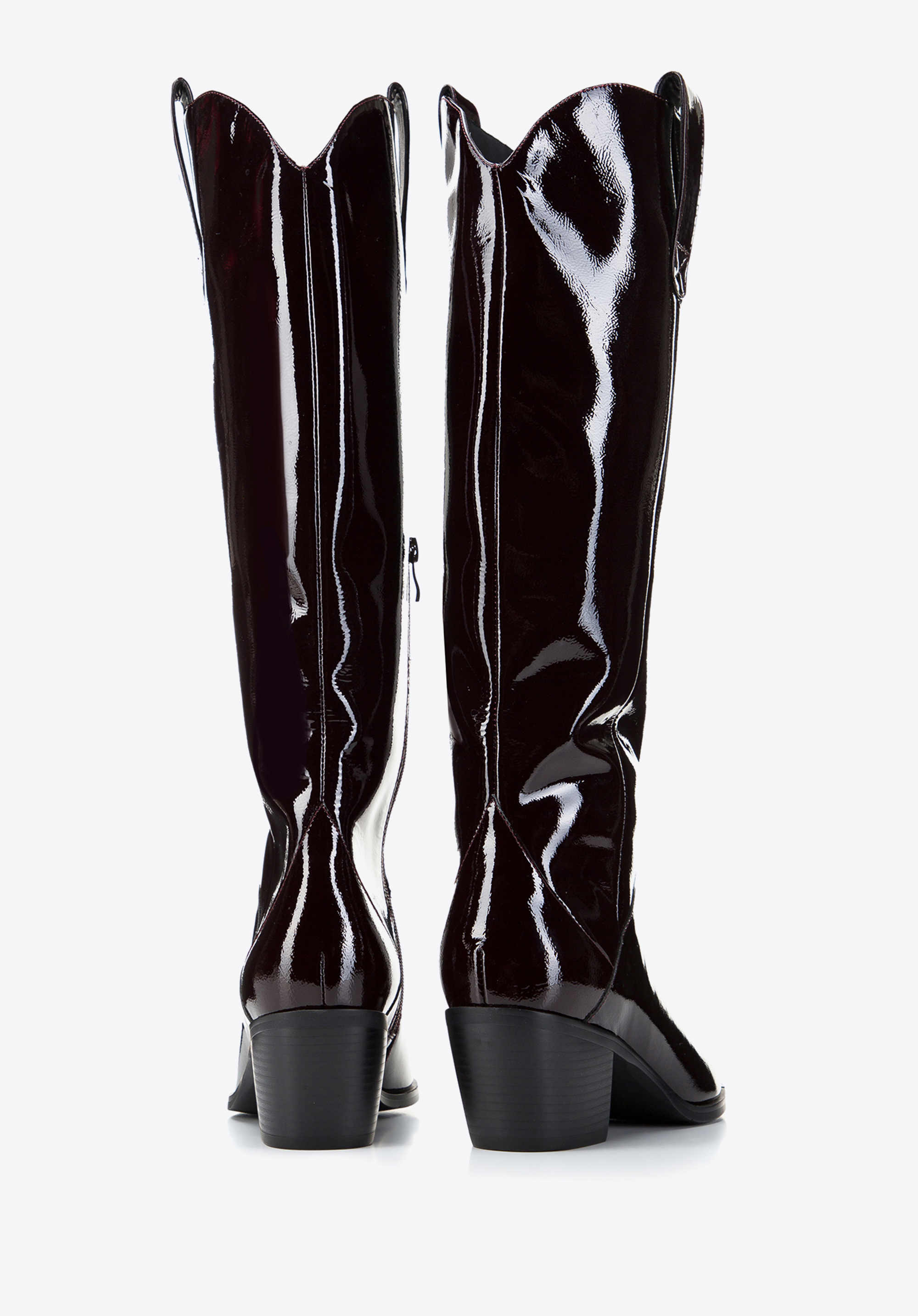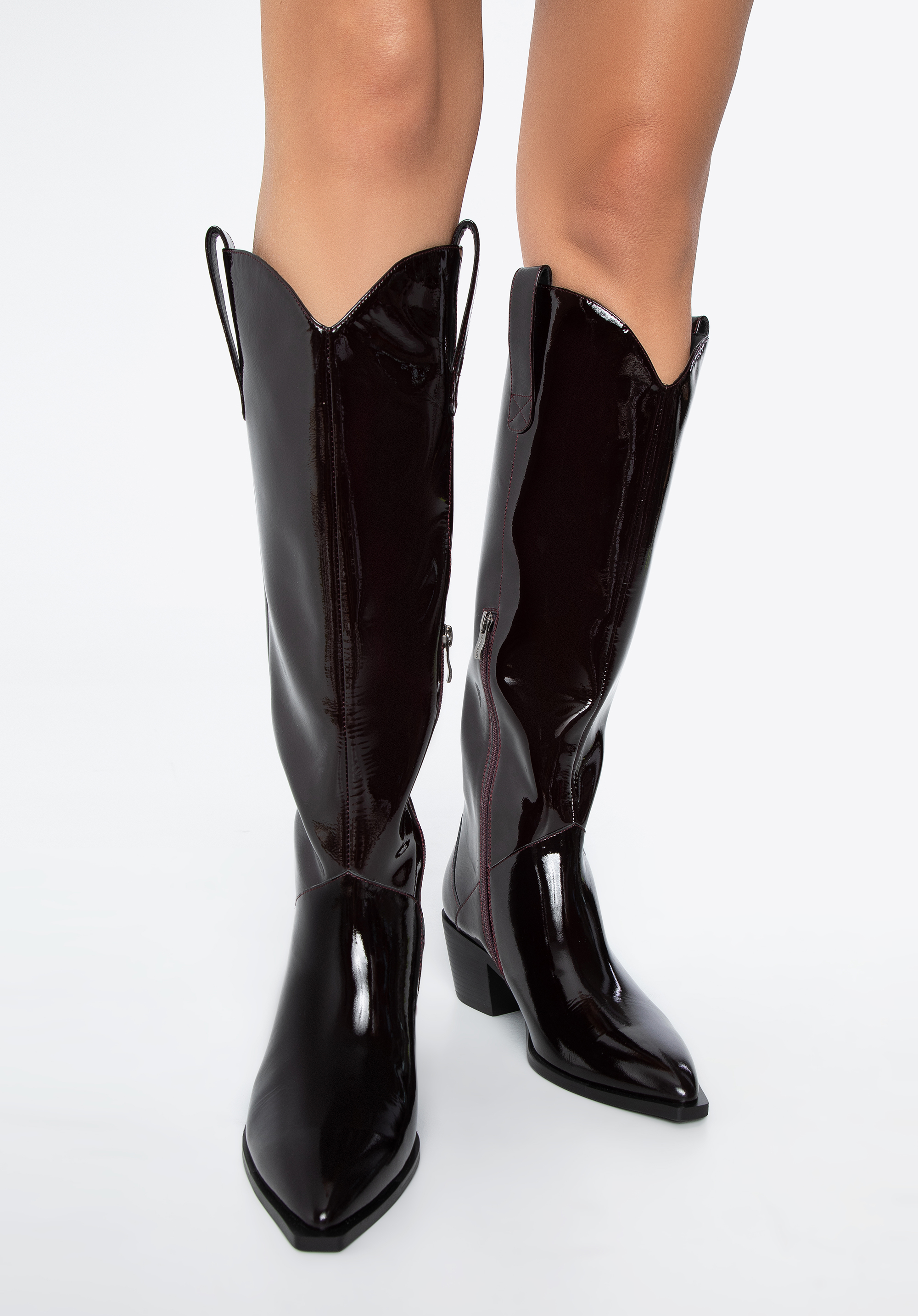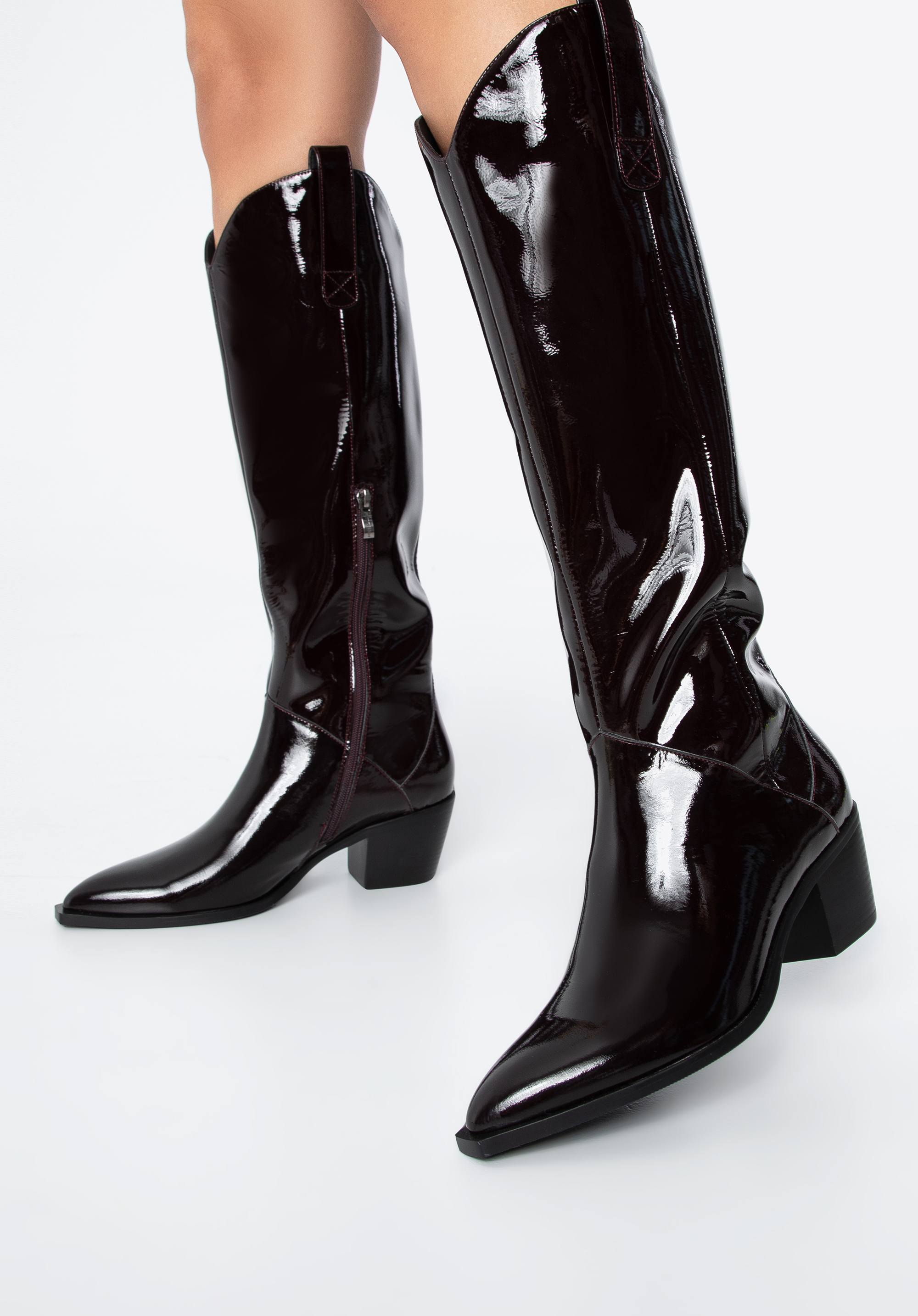 Added with elegance and uniqueness of cowboy style it means you will not go unnoticed. These staple western boots are updated with easy pull-up straps. Set on a wide cuban heel, these boots are crafted from the highest quality patent leather. These fashionable cowgirl boots are ideal for everyday wear and pair well with coctail fitted dress and also during the fall season with trousers and a shirt. The patent leather cowboy boots are a great choice for women who like to stay ahead in fashion.
