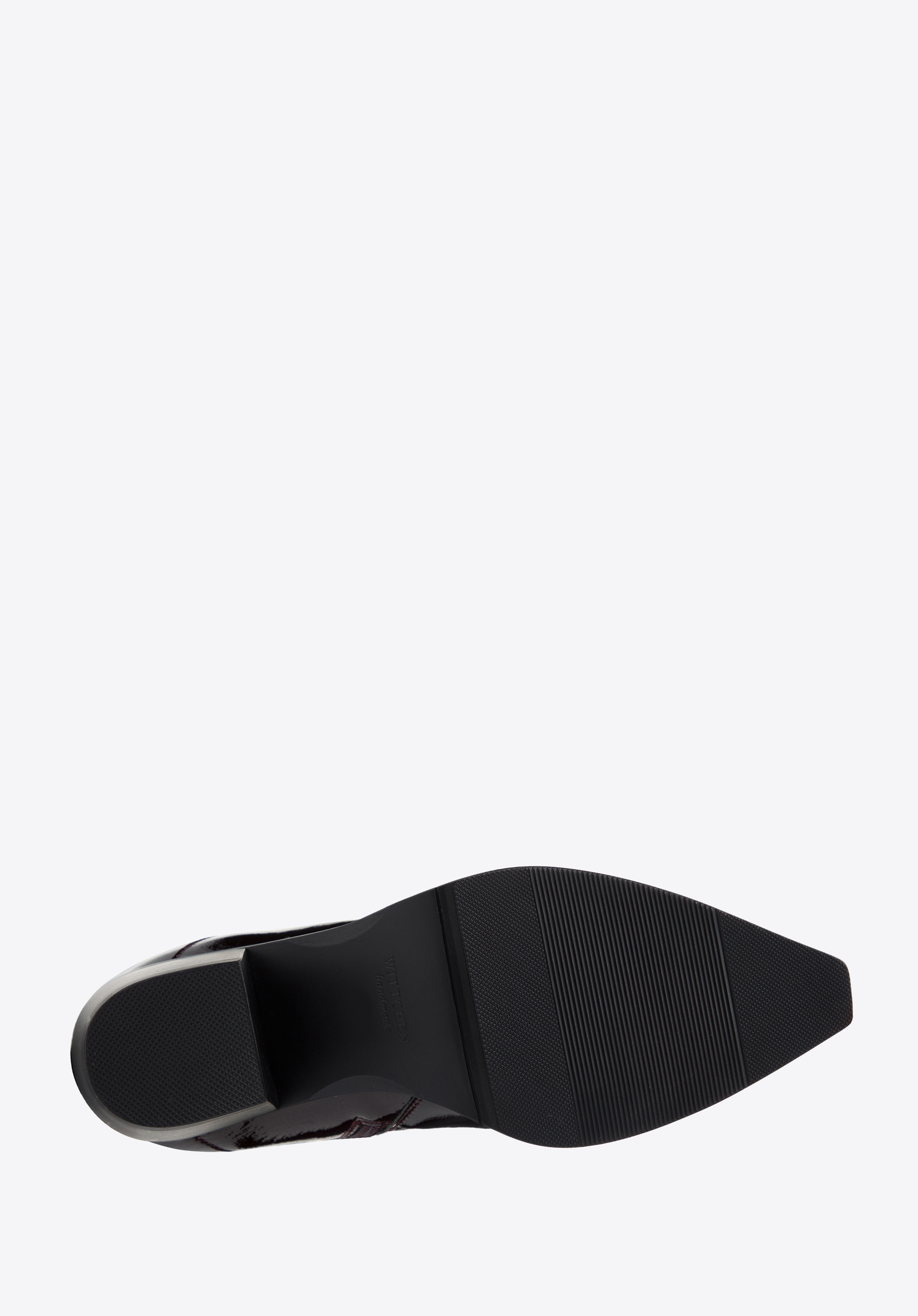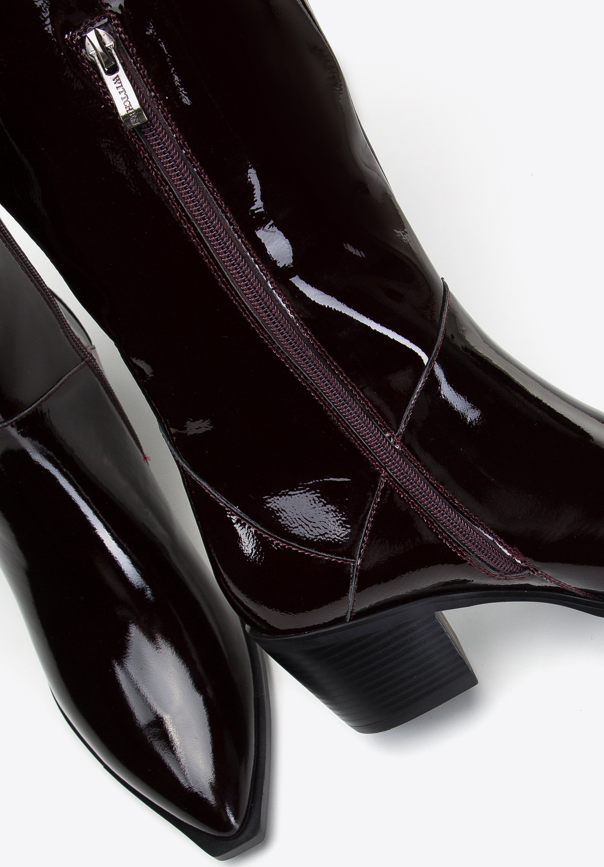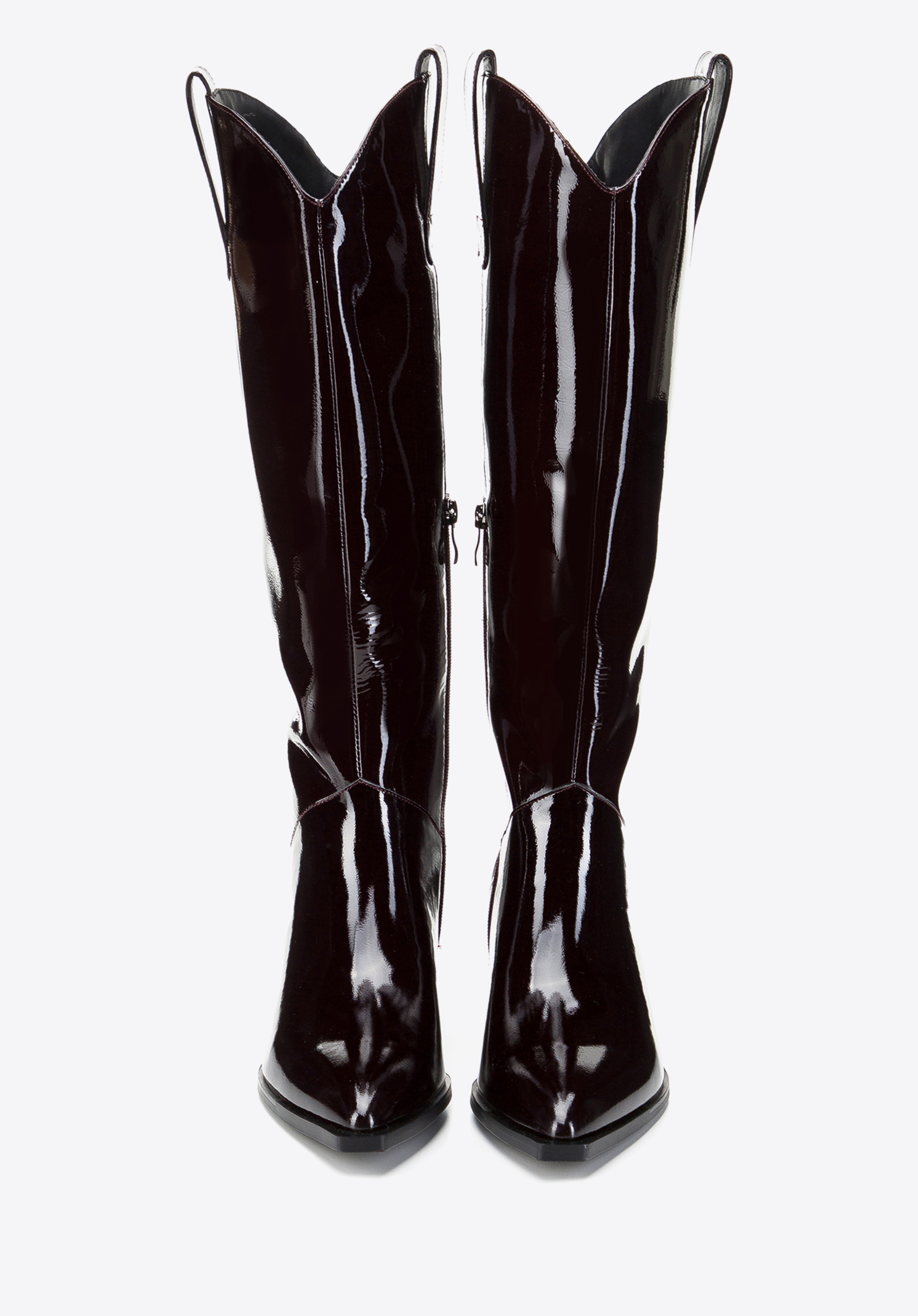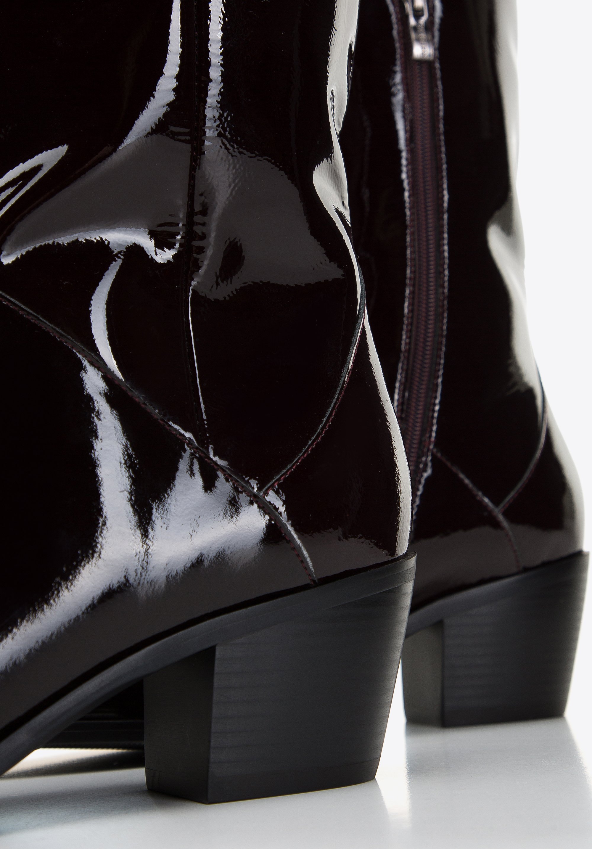 Added with elegance and uniqueness of cowboy style it means you will not go unnoticed. These staple western boots are updated with easy pull-up straps. Set on a wide cuban heel, these boots are crafted from the highest quality patent leather. These fashionable cowgirl boots are ideal for everyday wear and pair well with coctail fitted dress and also during the fall season with trousers and a shirt. The patent leather cowboy boots are a great choice for women who like to stay ahead in fashion.