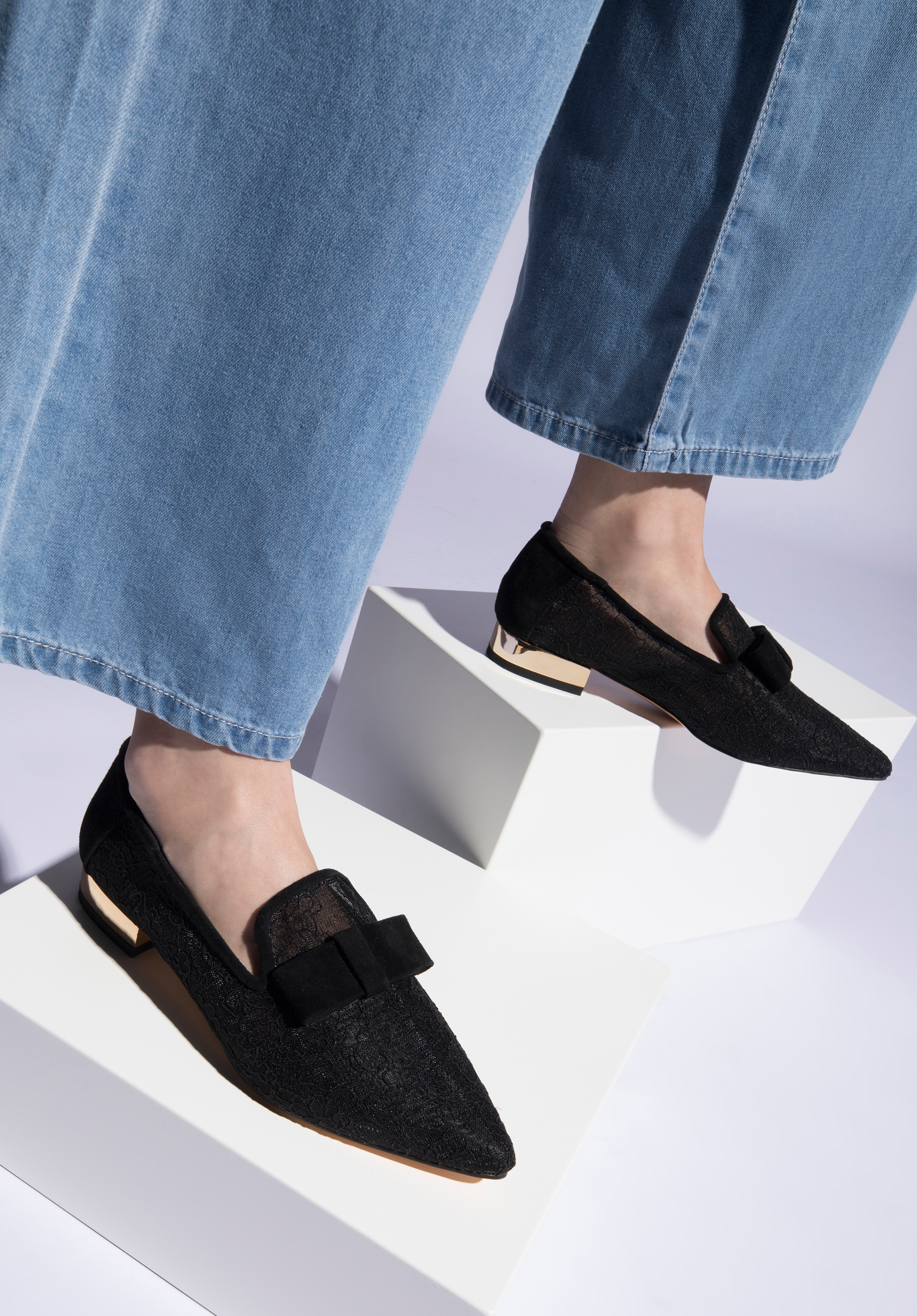 These unique shoes are definitely a head-turner. Made of a transparent material resembling lace, these shoes boasts a minimalistic, suede bow detail at the front for added appeal. The shoe toe is additionally lined with leather. The pointed toe will elongate the foot, and the low, comfortable gold-tone heel will add sophisticated twist to this design. Wear them with your favorite mini dress or chinos and a shirt - you will look special in every situation. Women's transparent loafers with a low heel are a great choice for enthusiasts of fashionable accessories.