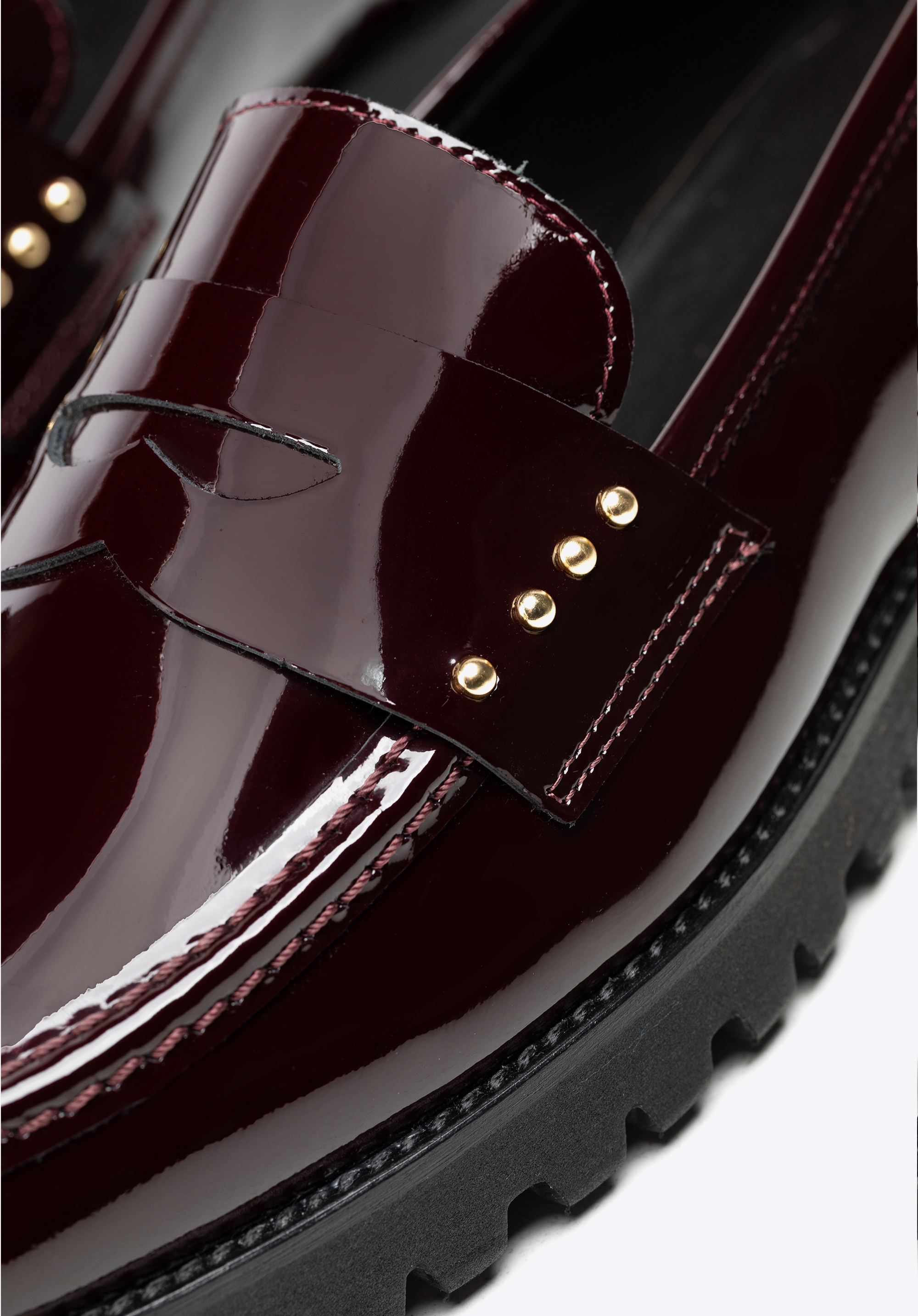 Elegant with a touch of edge – these loafers are the perfect choice for women who value timeless style with a modern twist. Crafted from high-quality patent natural leather, they captivate with their glossy finish and refined details. Delicate studs add a hint of jewellery-inspired charm, while the almond-shaped toe subtly elongates the foot, giving your silhouette an elegant lightness. The leather interior adapts to the shape of your foot, ensuring lasting comfort even on the busiest of days.