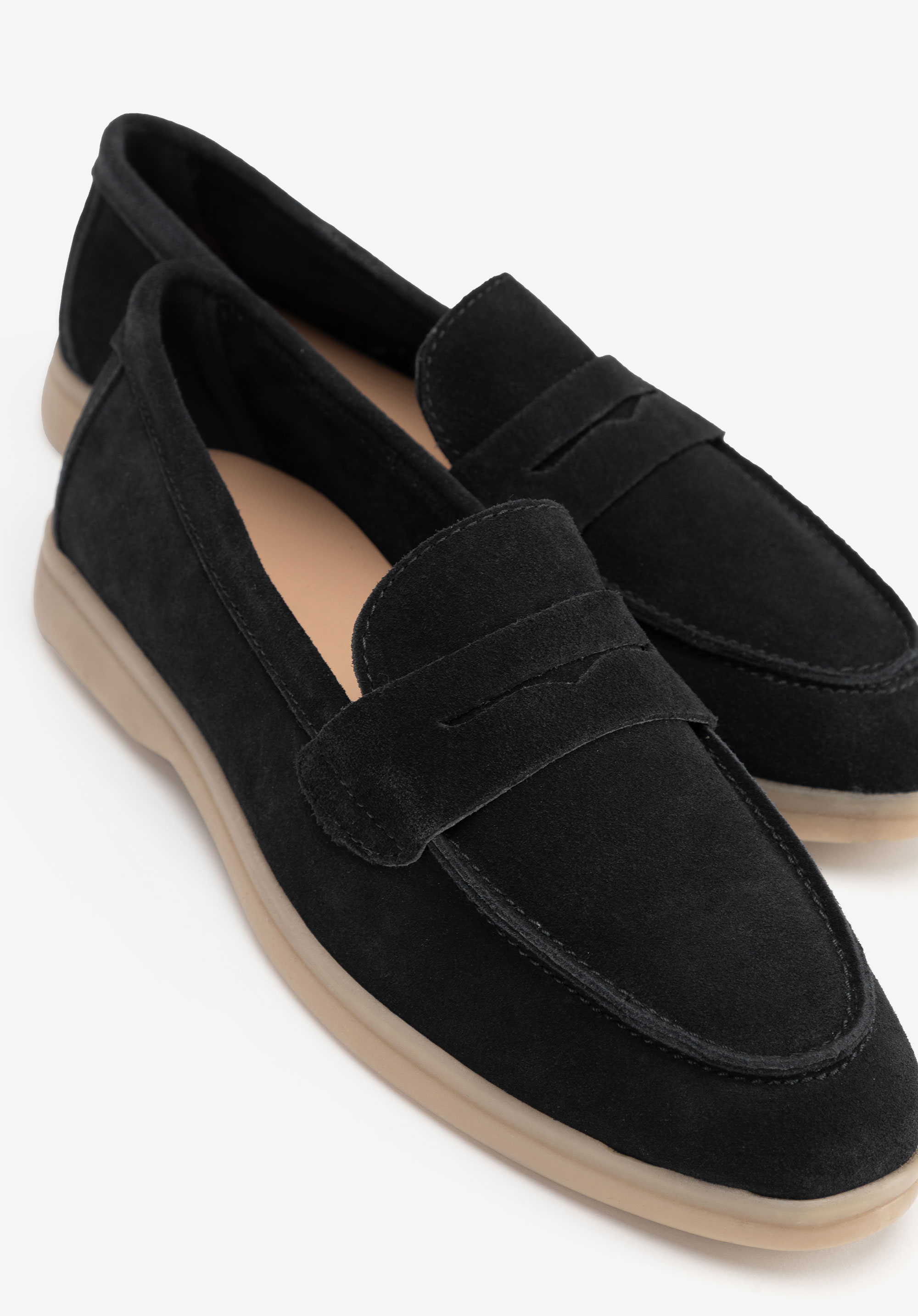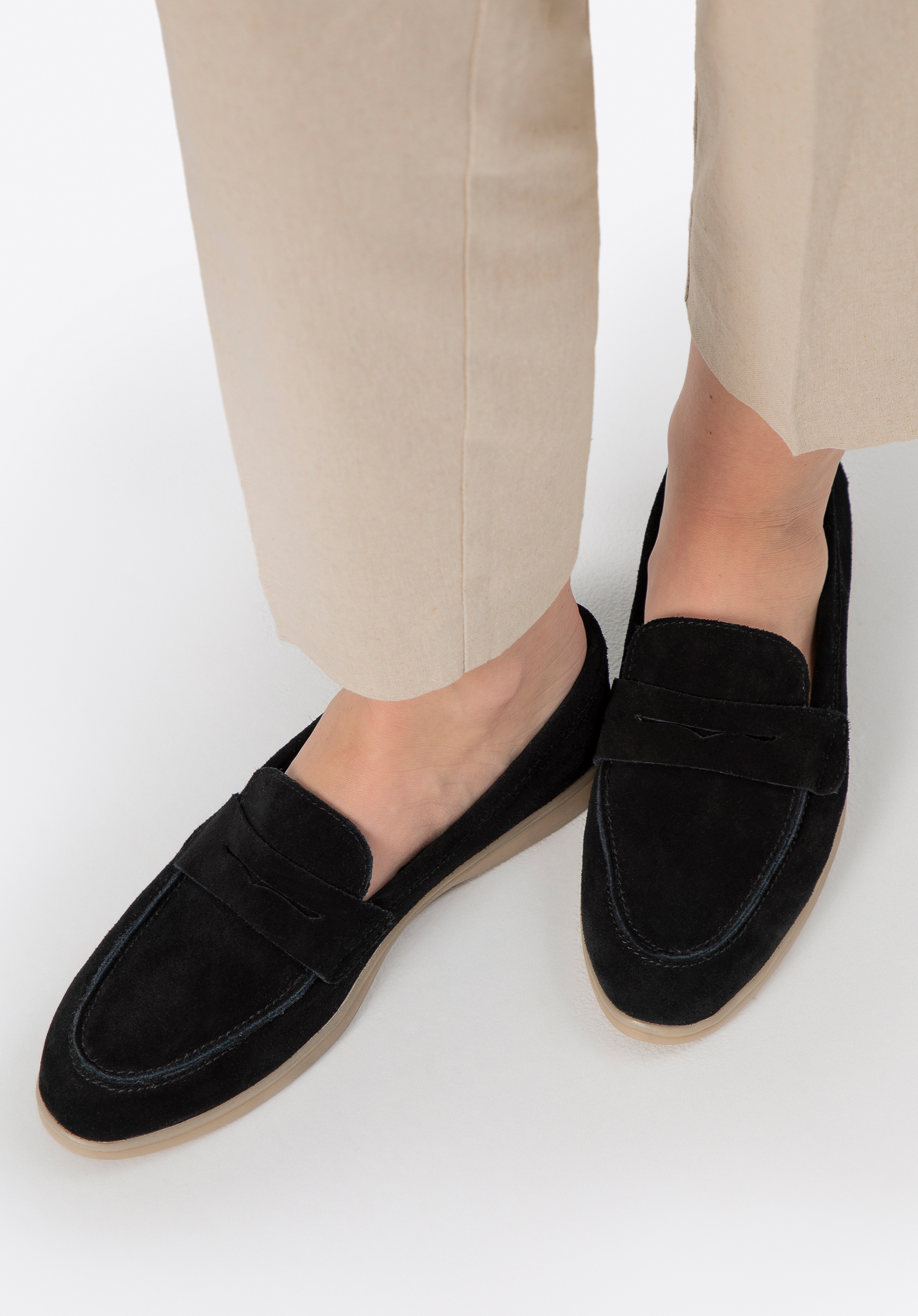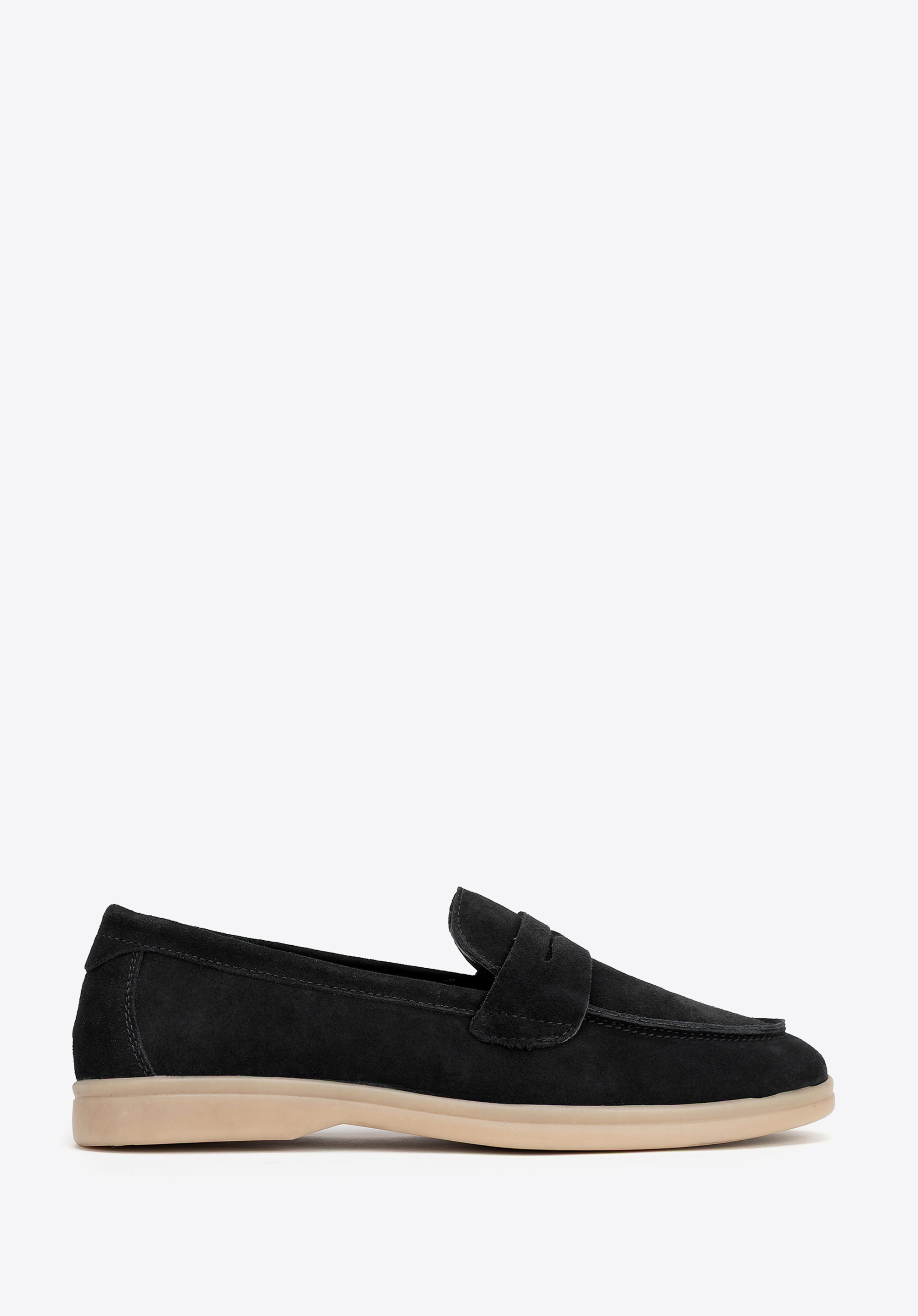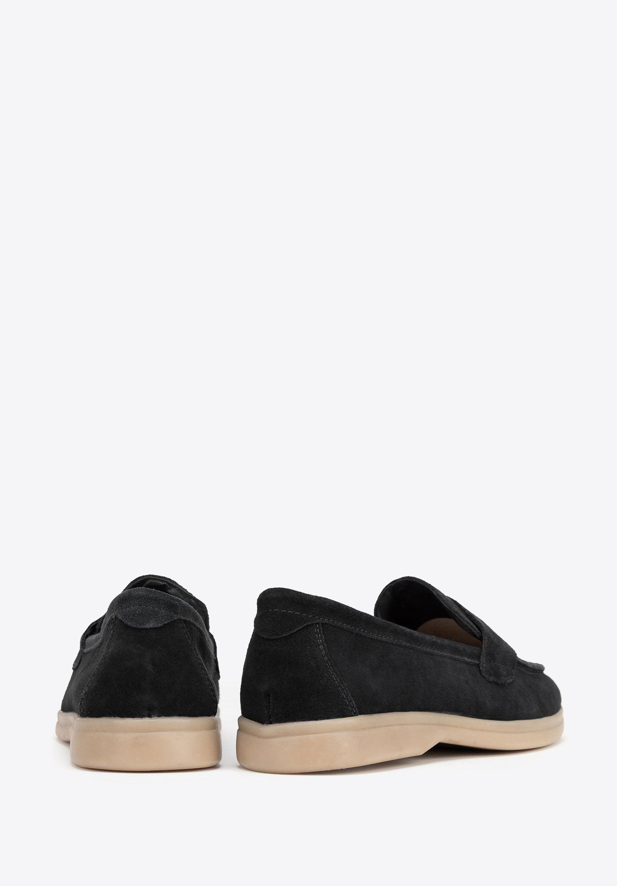 Women's loafers made from suede leather combine elegance, comfort, and versatility. Crafted from soft suede, with a faux leather insole and microfibre lining, these shoes ensure all-day comfort. The flat TPR sole provides flexibility and durability, while the rounded toe adds a touch of subtle charm. Their slip-on design epitomises convenience, making them perfect for everyday wear when easy on-and-off functionality matters just as much as lasting comfort.