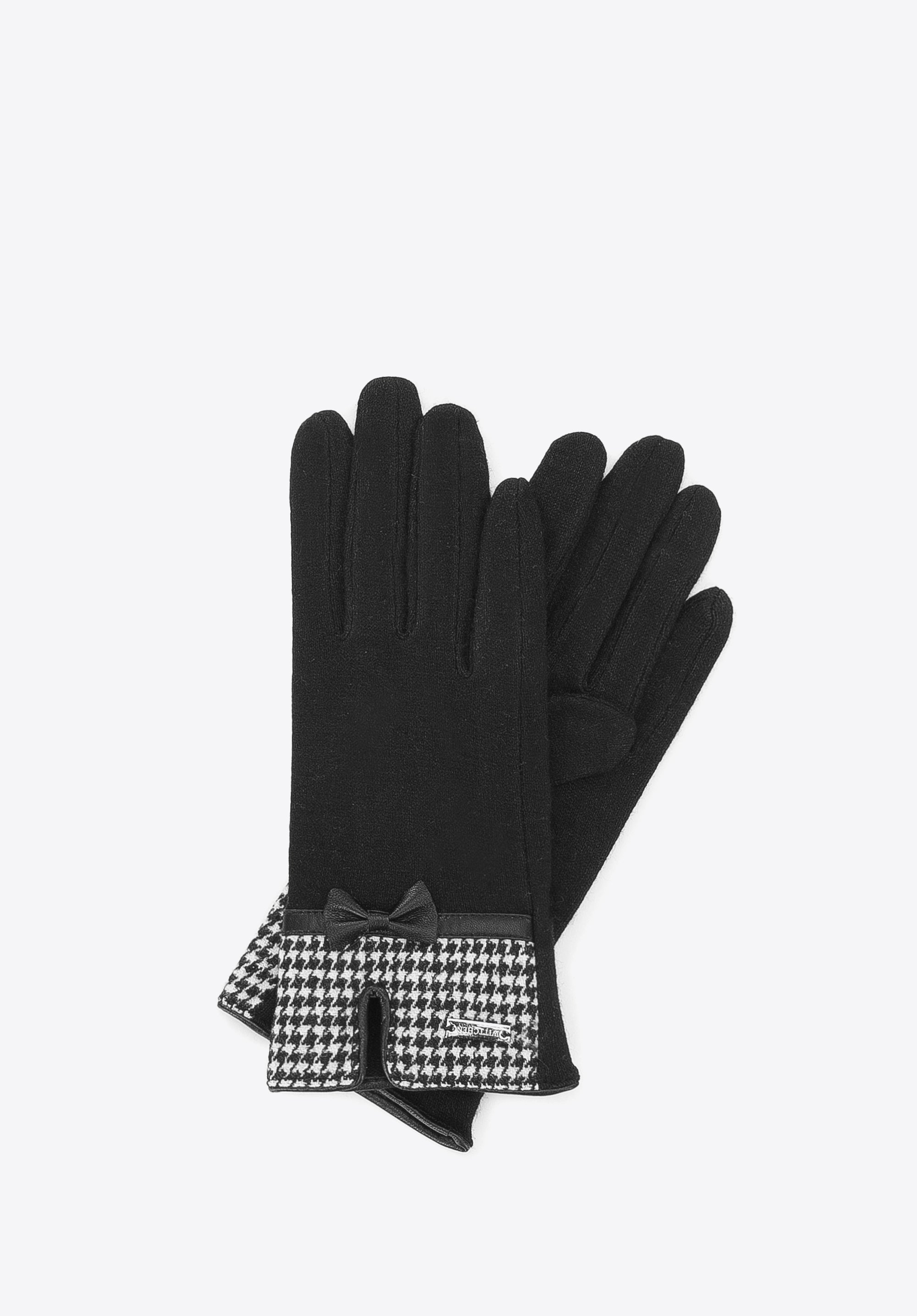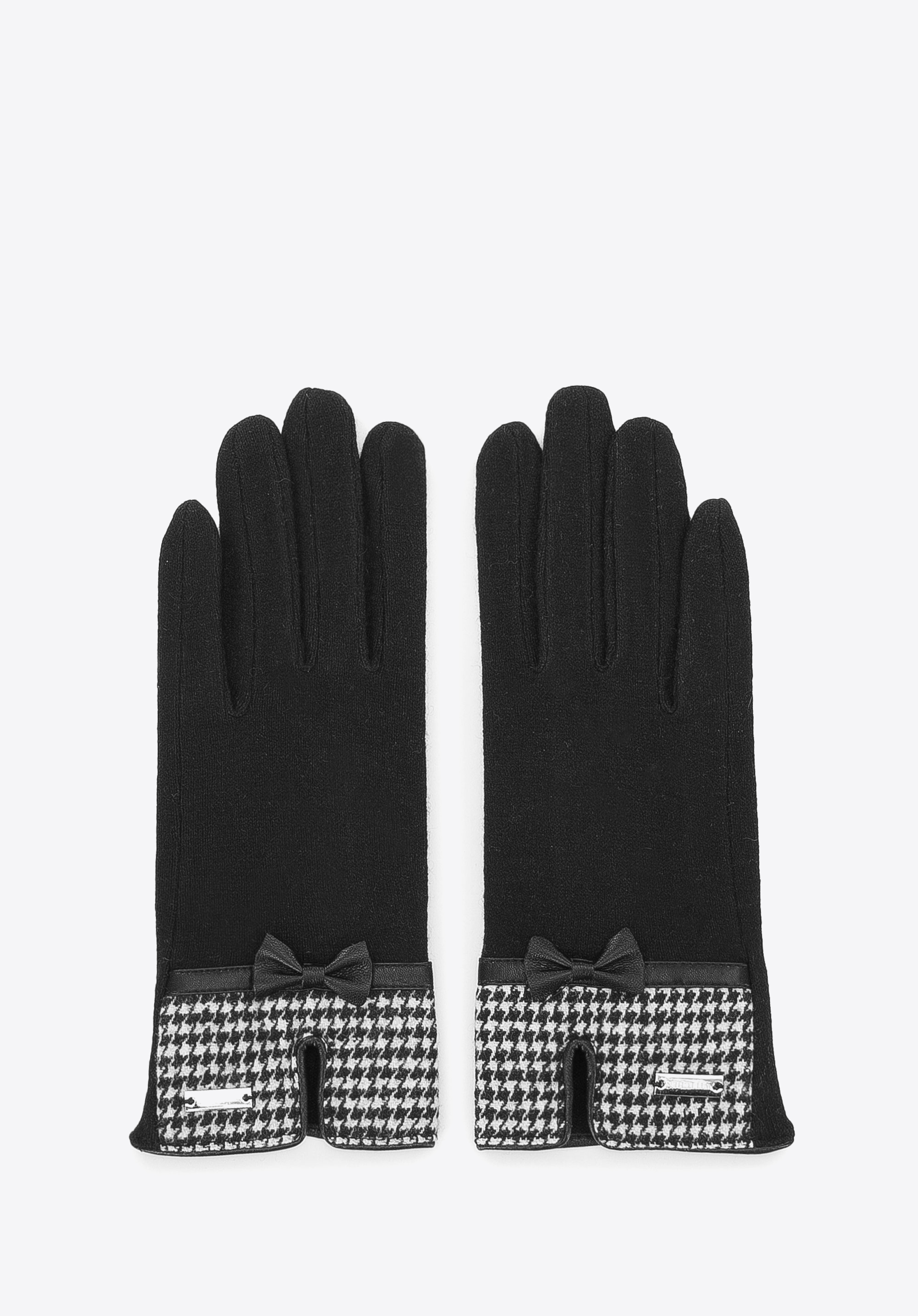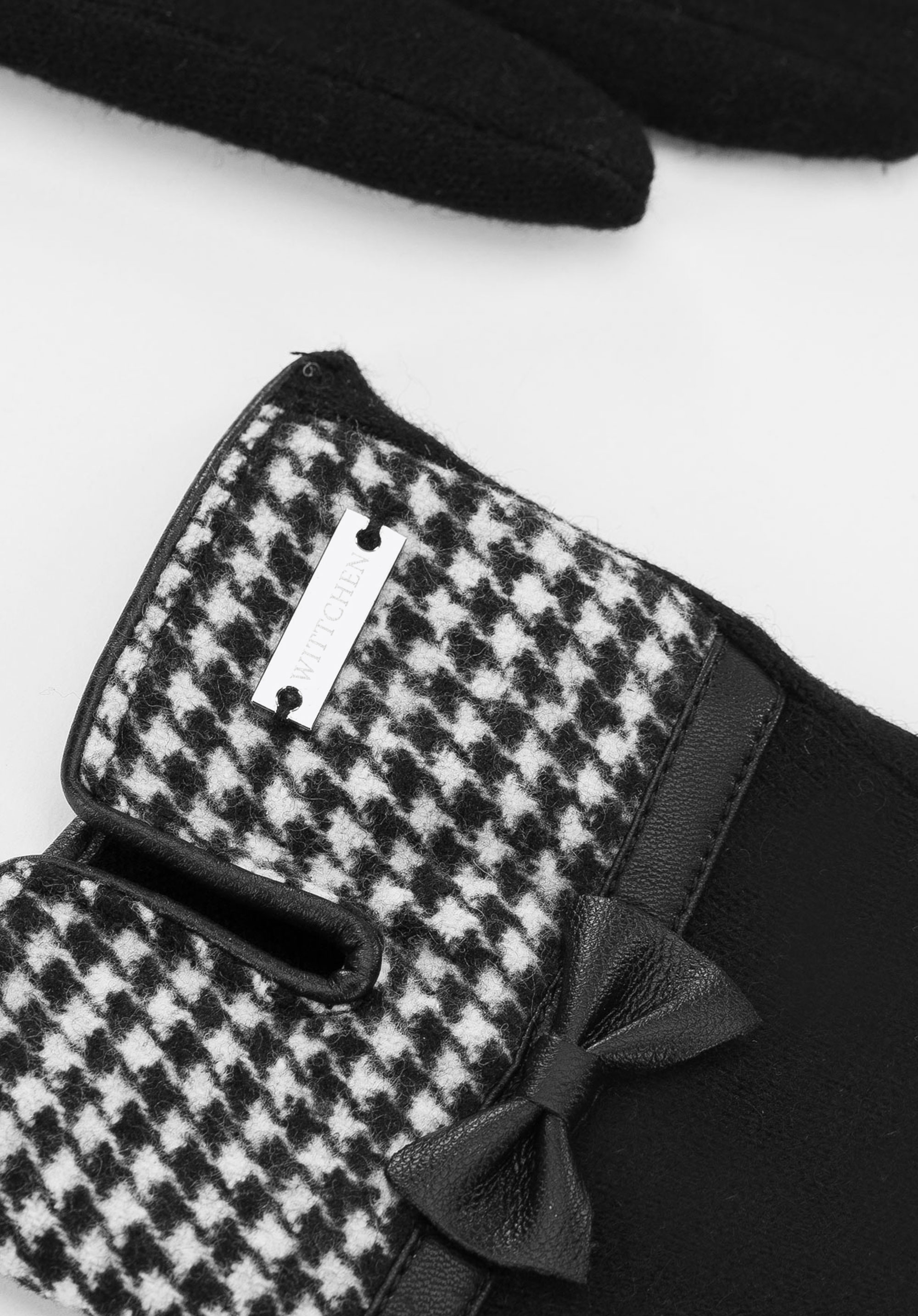 Classic women's gloves with petite bow detail are very flattering and give a refined touch to every winter outfit. Crafted from the highest quality wool and nylon blend with added fibres that allow you to use touch screen devices without removing your gloves. It is very useful feature when you are outside on a walk and want to check something on your phone. Embellished with a bow detail and houndstooth check pattern at the wrist , these gloves made in 50% of wool offer unrivaled comfort and warmth. These gloves add a sophisticated finishing touch to your winter accessories line-up.