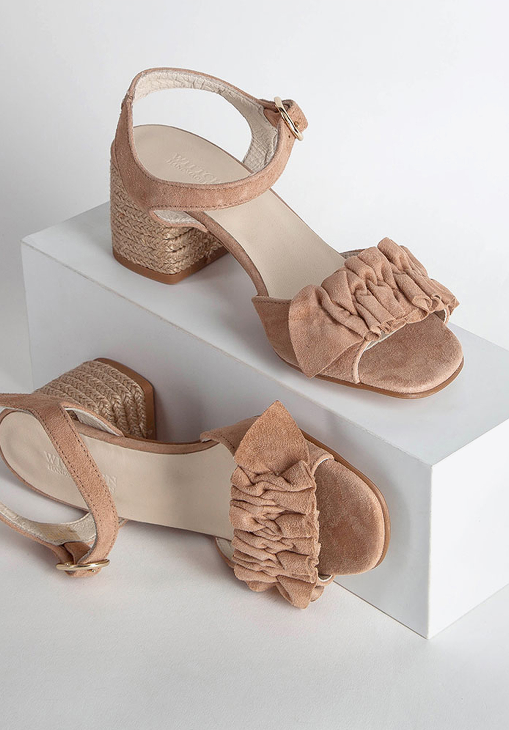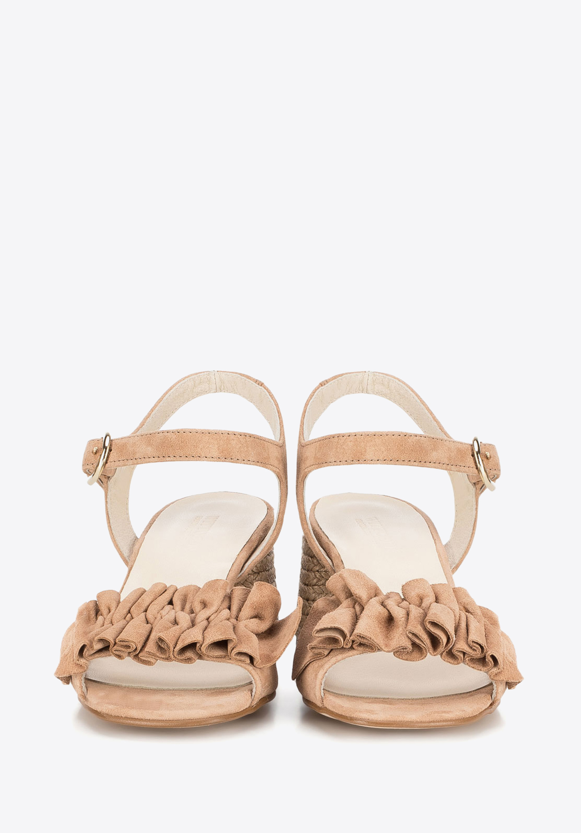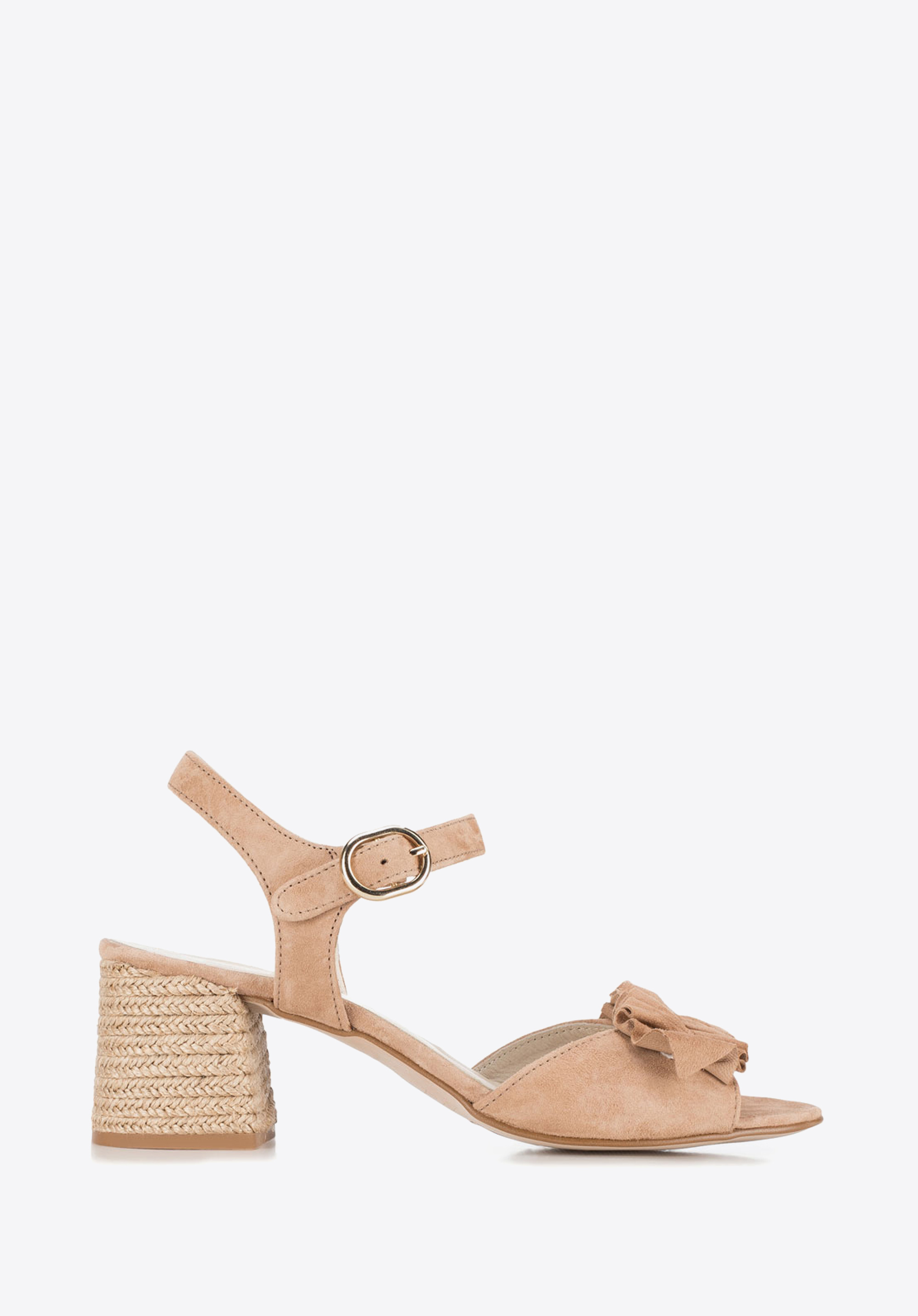 Elevate your summertime outfit with these attractive sandals. Available in beige, red and black shade, they rest on a mid block heel and are adorned with the suede ruffles on the toe strap. This pair will team perfectly not only with lightweight summer dresses but also with shorts. Our advice: rope effect block heel completes this summer design.